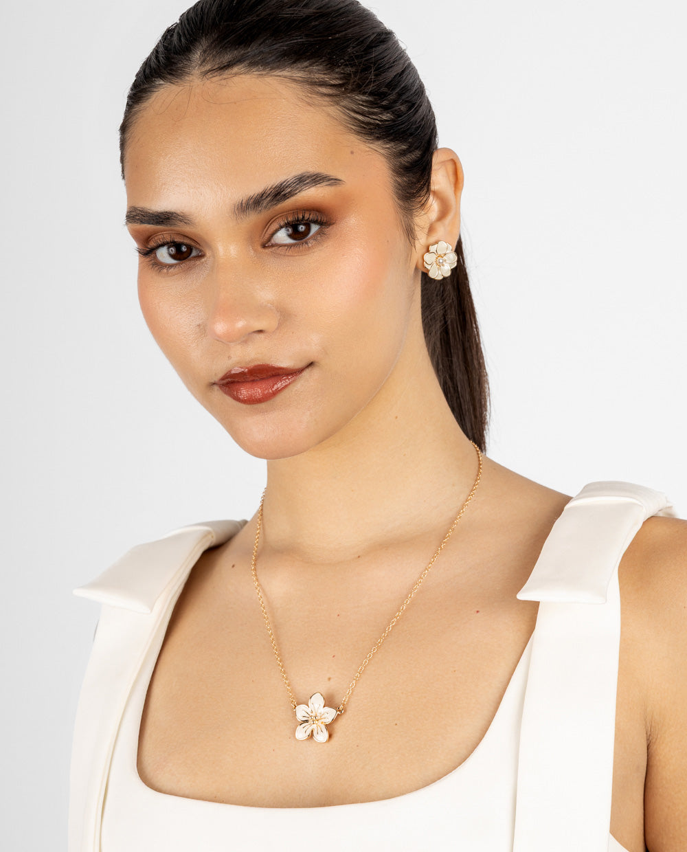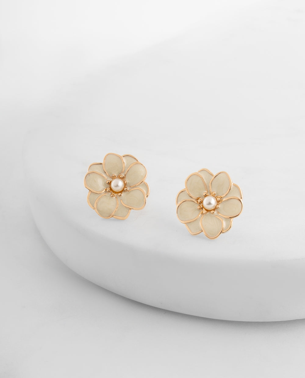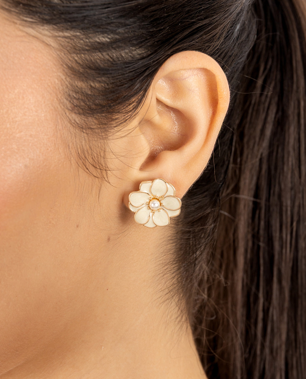 Aretes grandes bañados en oro con diseño de flor en acabado nacarado. Pertenecen a la colección Premium son hipoalergénicos, ideales para pieles sensibles.