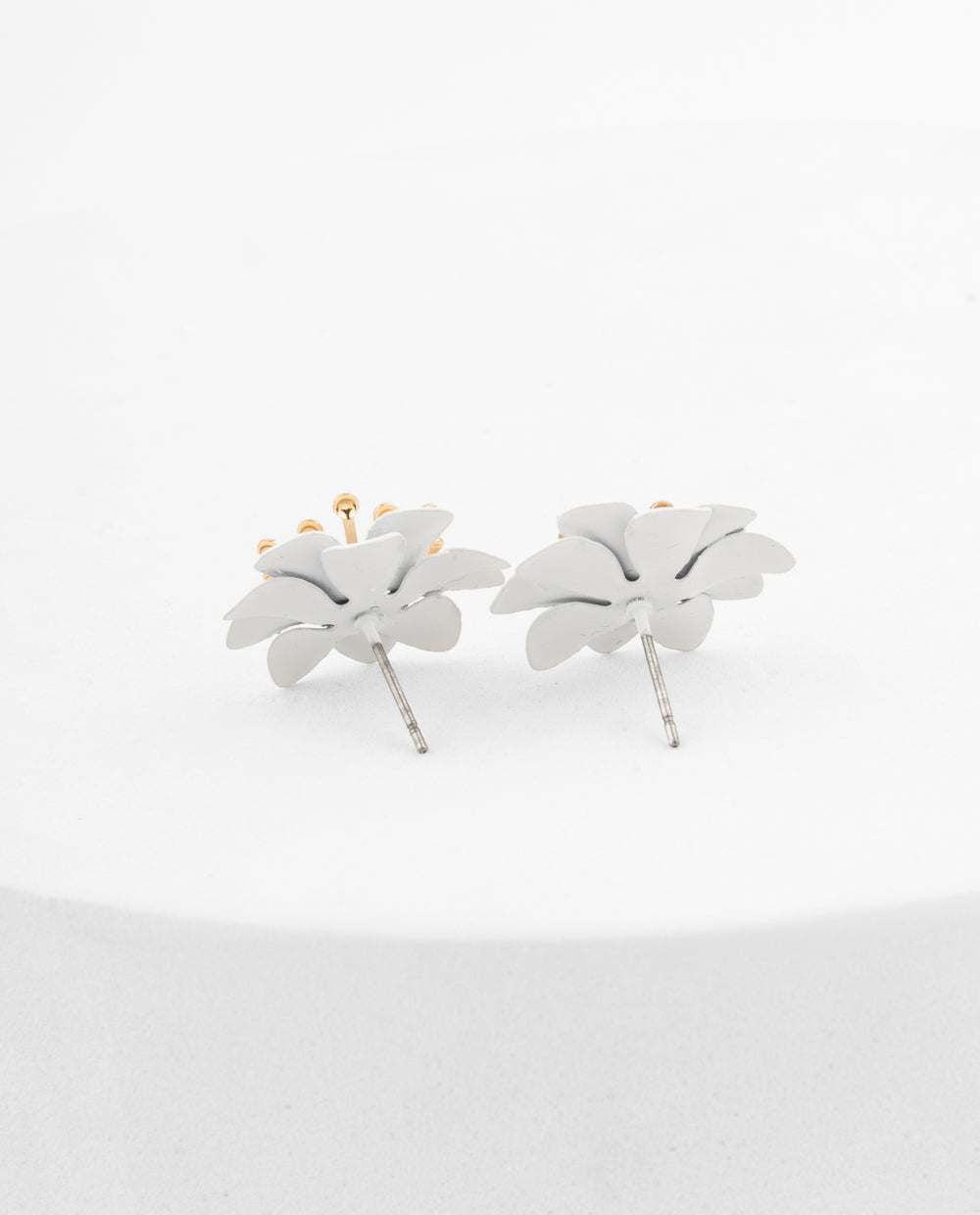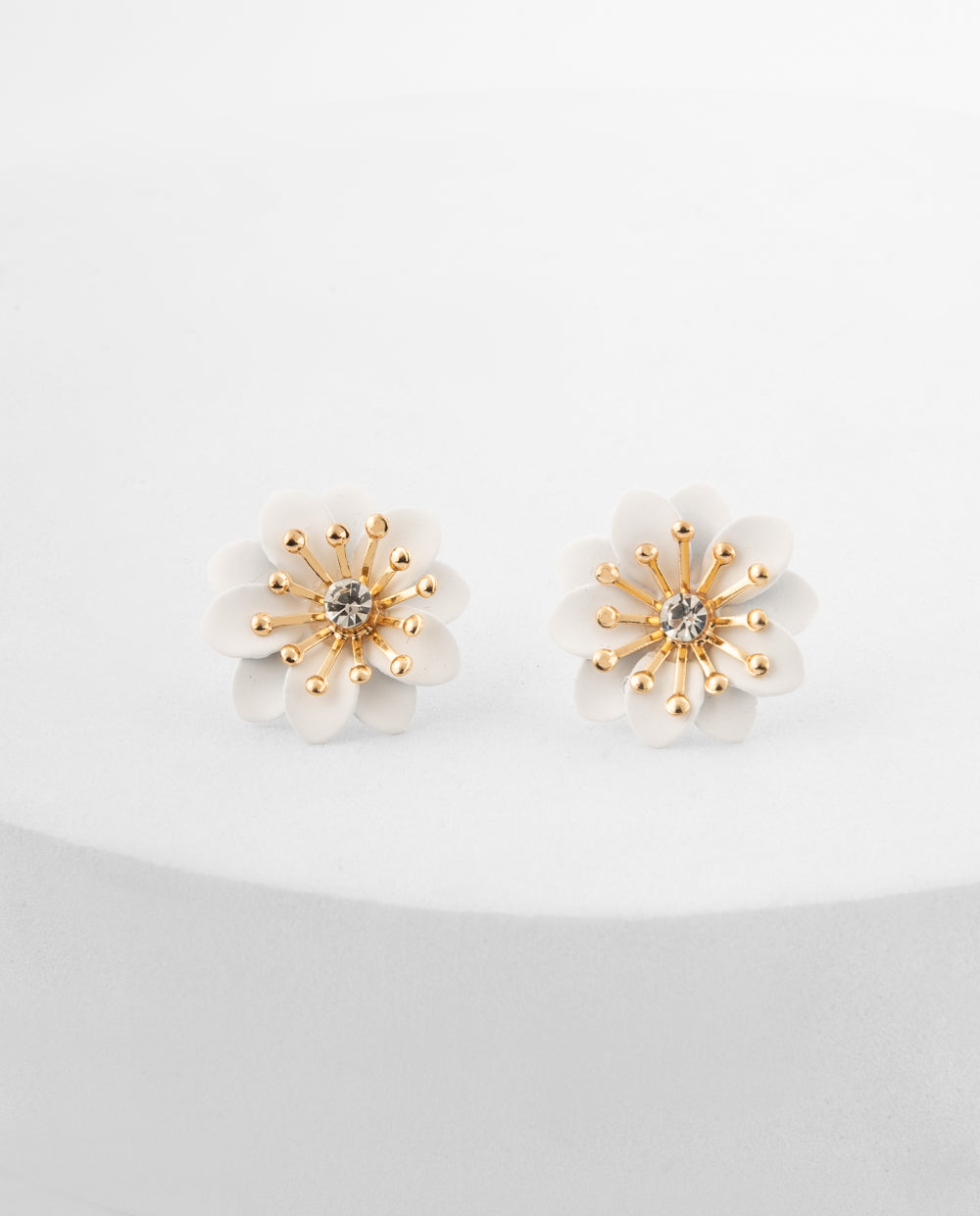 Aretes en forma de flor con pétalos blancos y detalles dorados, acompañados de un centro facetado que aporta un brillo delicado.