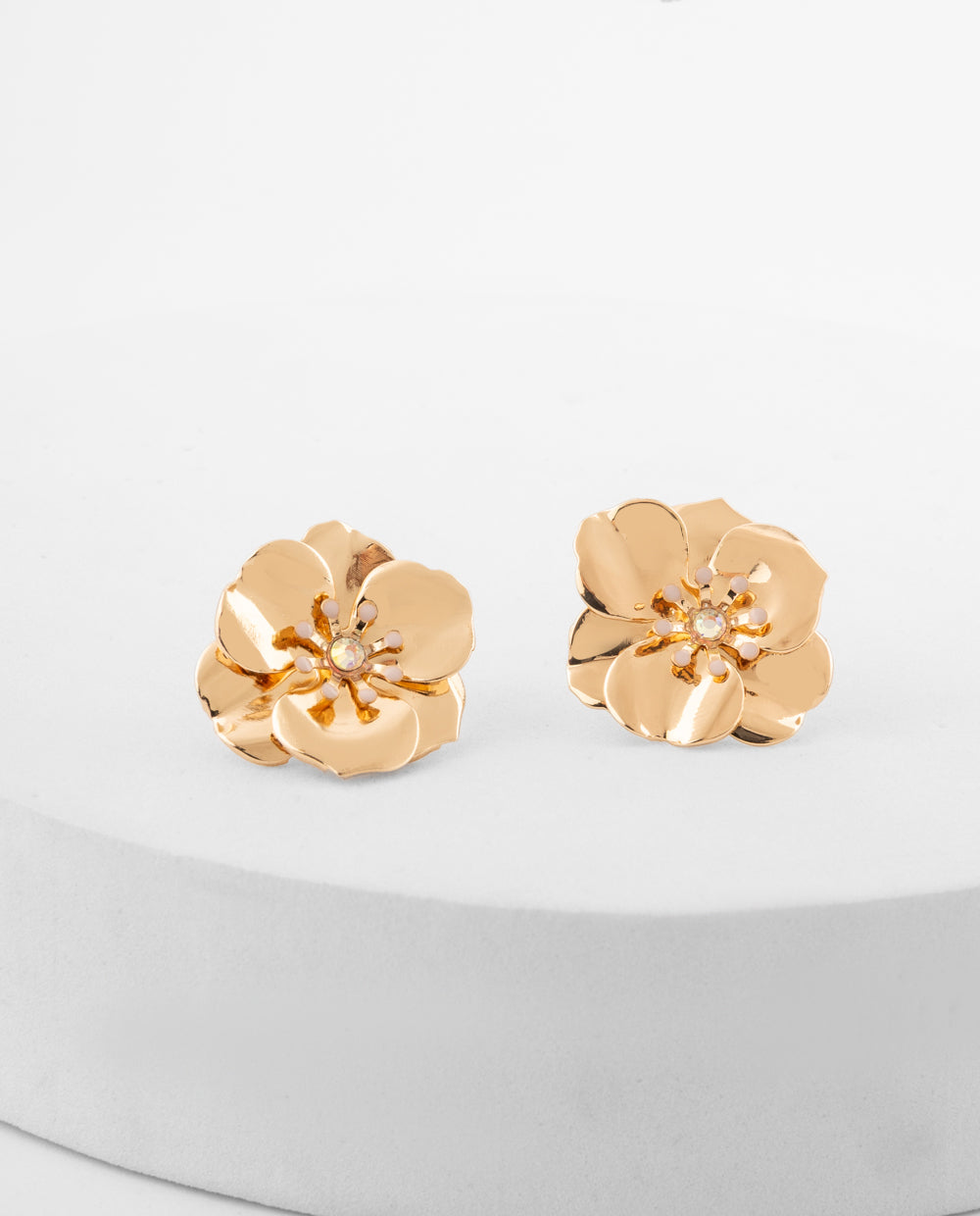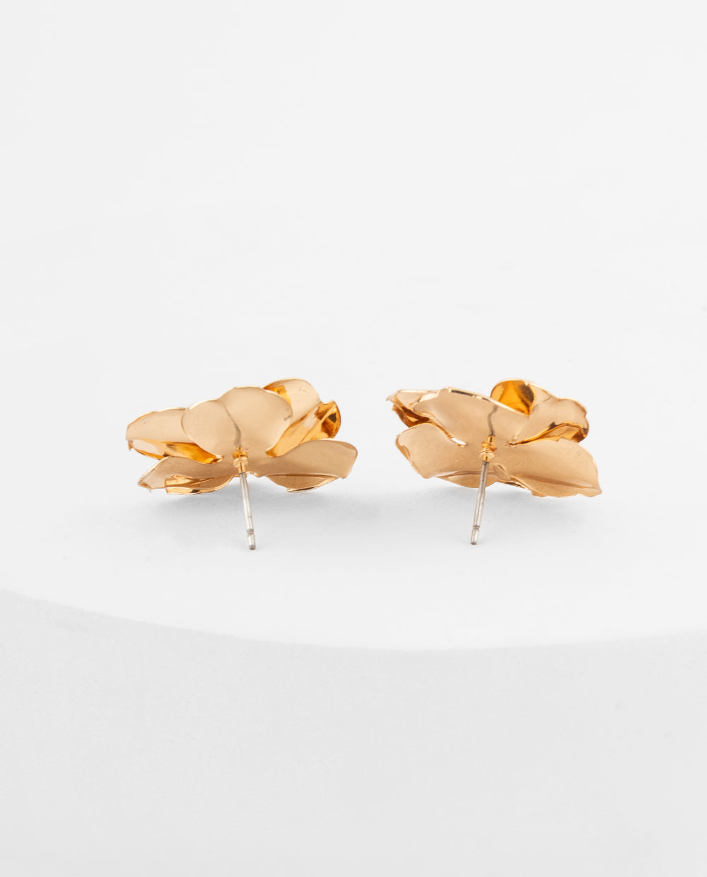 Aretes en forma de flor metálica dorada con centro brillante, perfectos para añadir un toque elegante y luminoso a cualquier look.