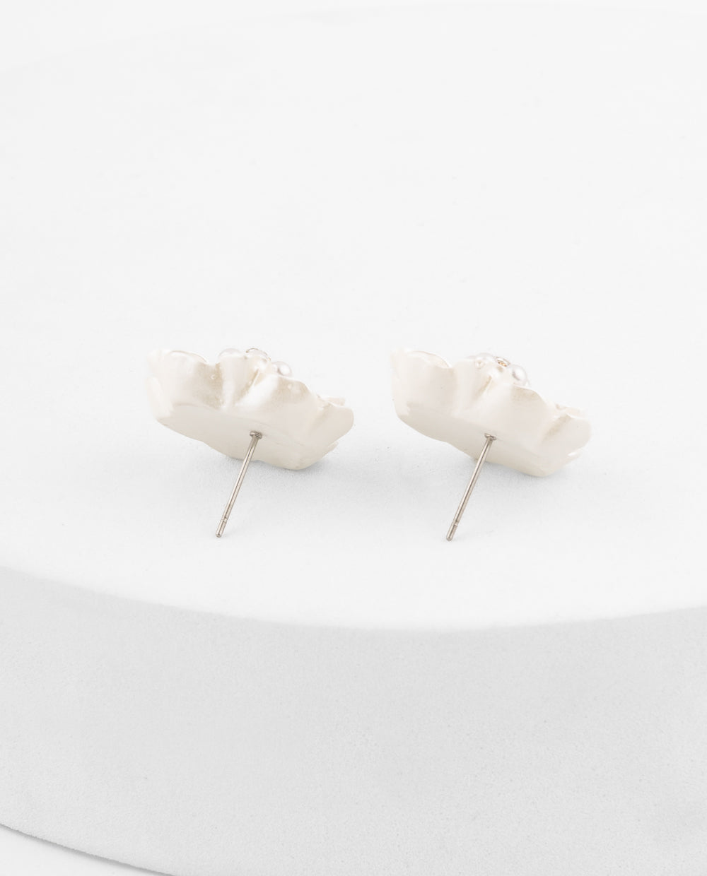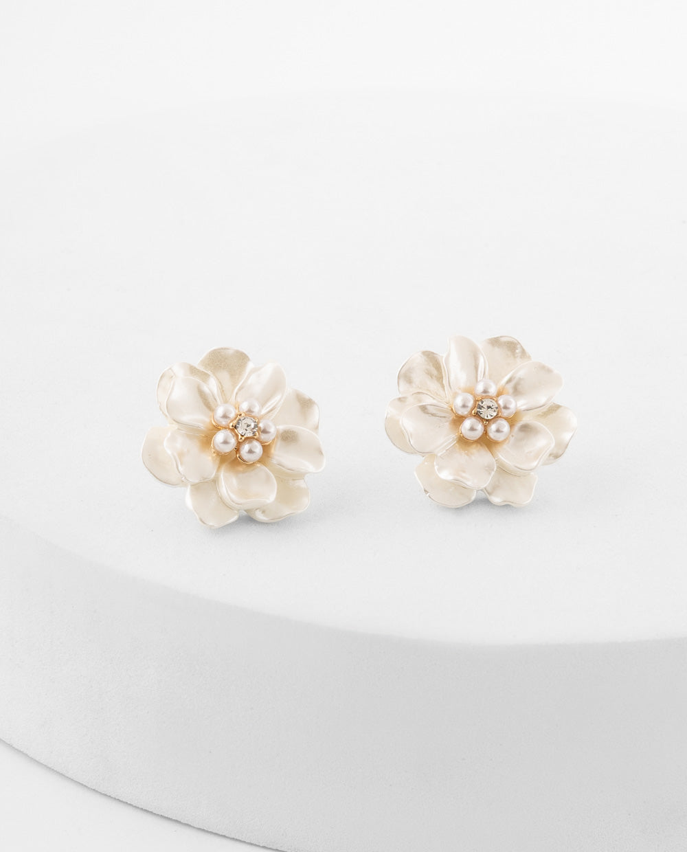 Aretes con diseño de flor nacarada y centro de perlas y brillo, perfectos para un toque elegante y delicado.