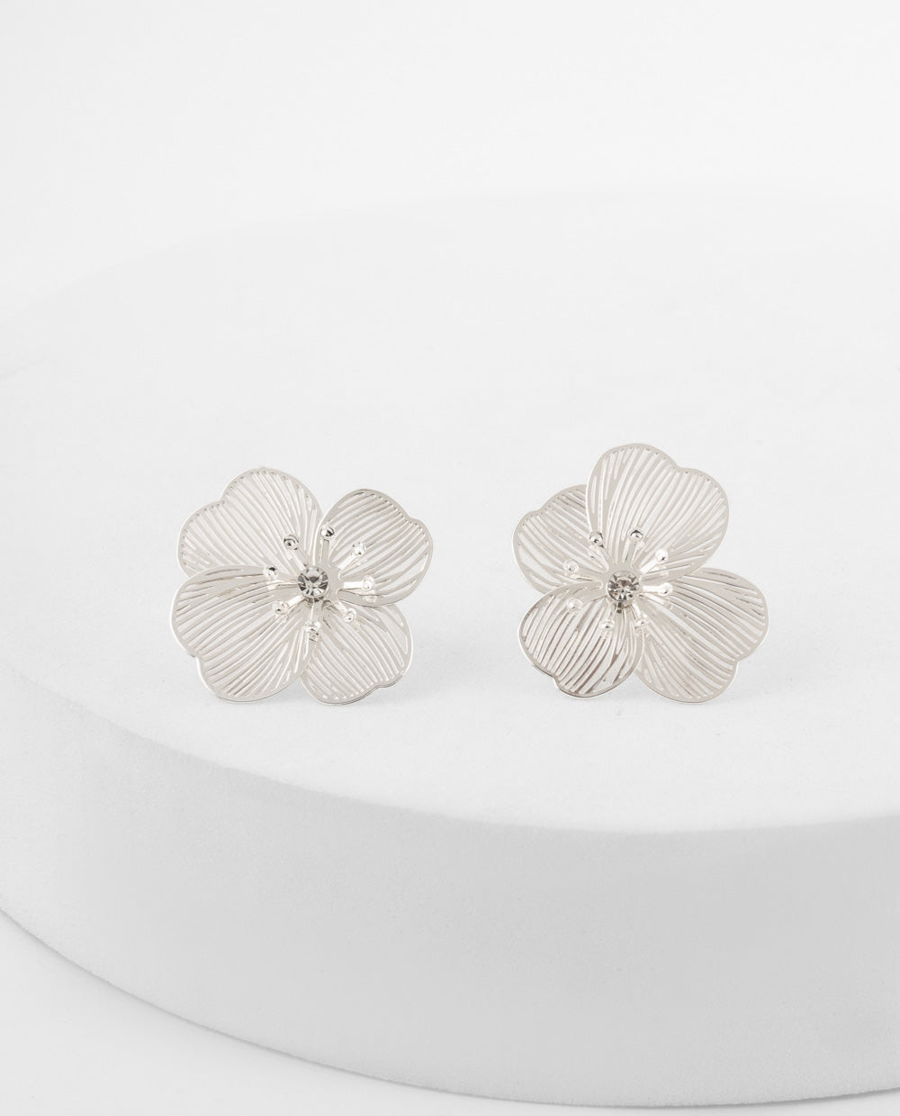 Aretes grandes con diseño de flor plateada en acabado brillante, delicadamente texturados para aportar un toque elegante y femenino.