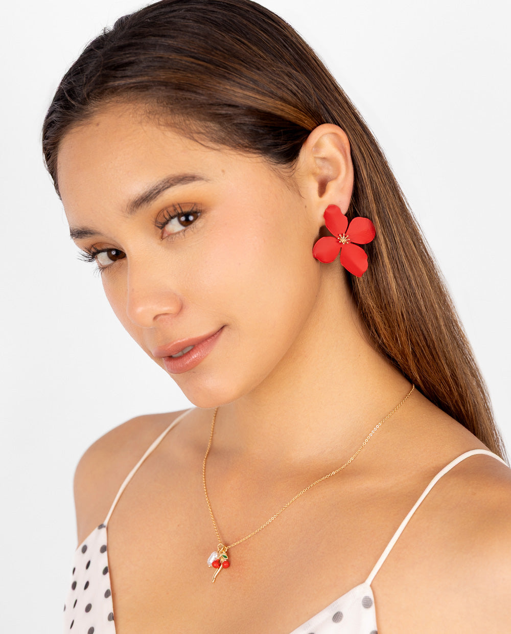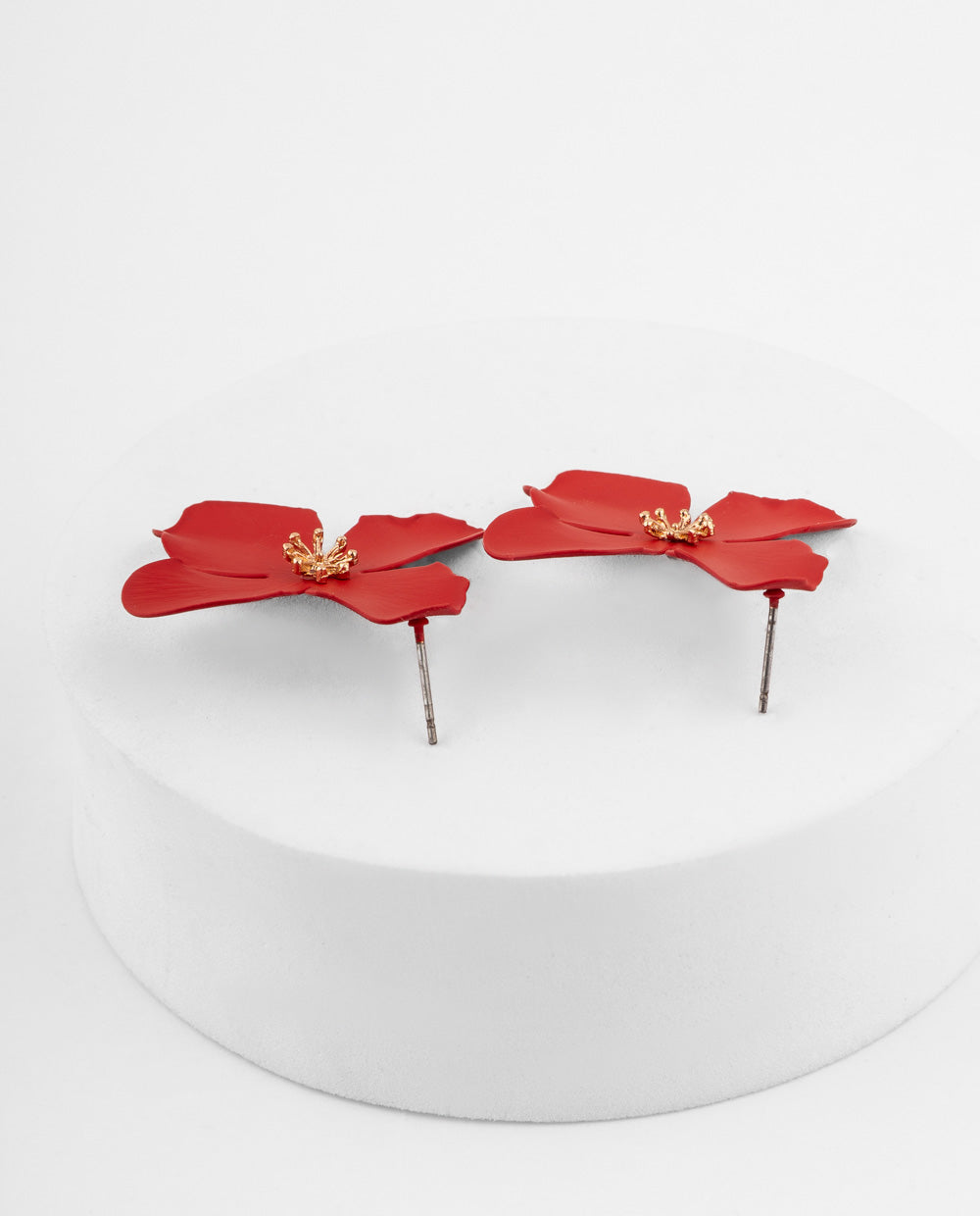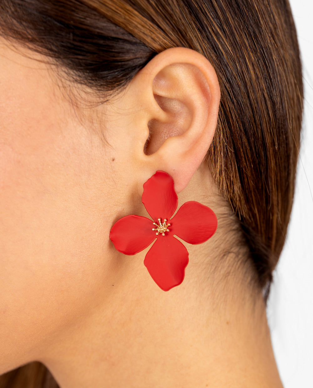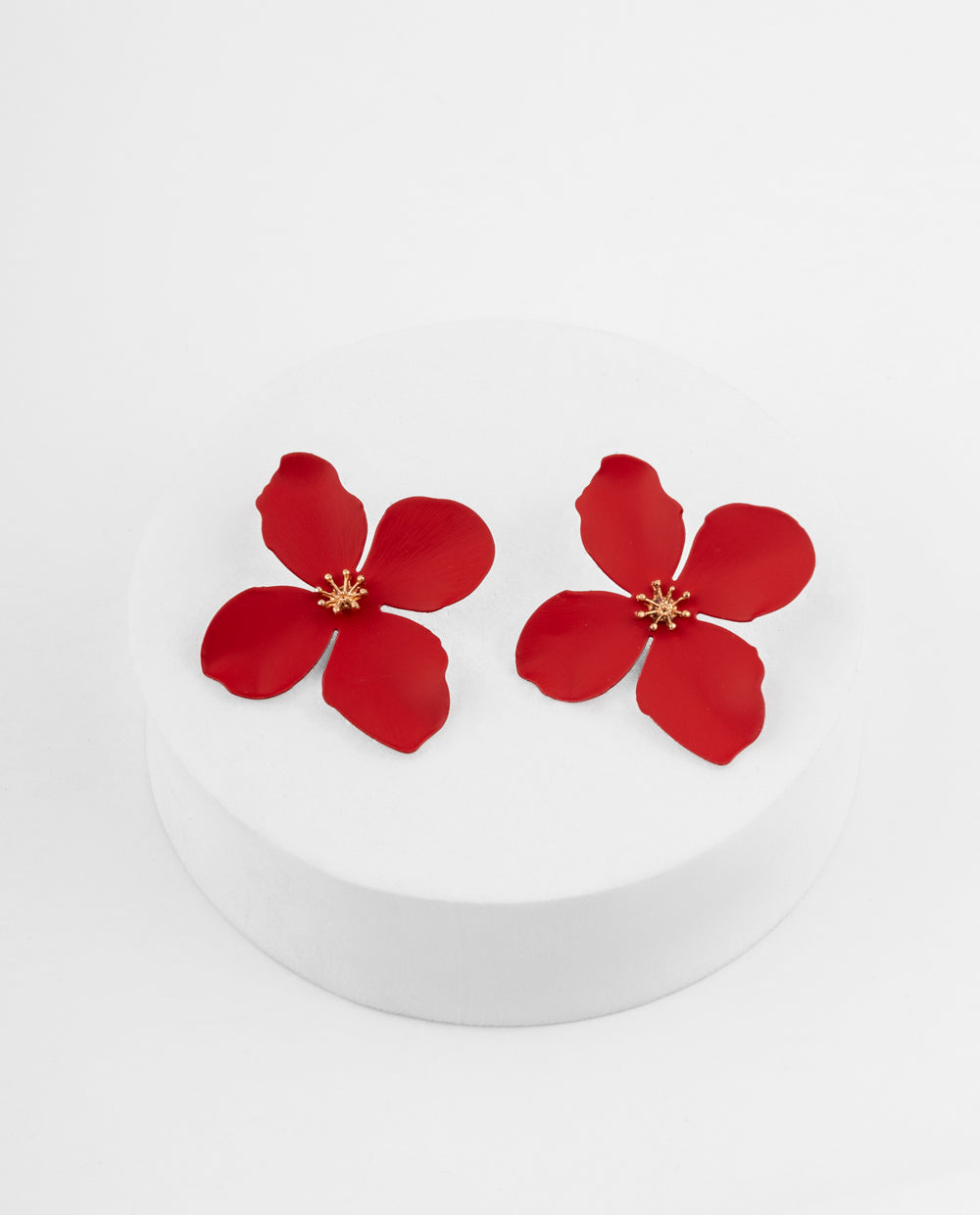 Aretes grandes en forma de flor con pétalos rojos mate y centro dorado texturizado. Diseño liviano y de acabado satinado que resalta por su volumen y color intenso.