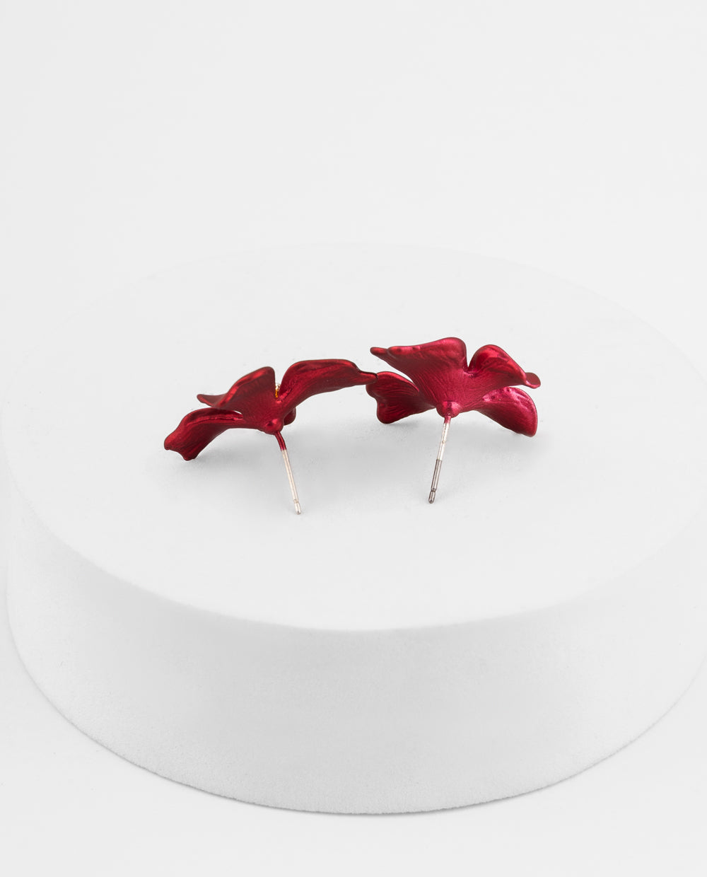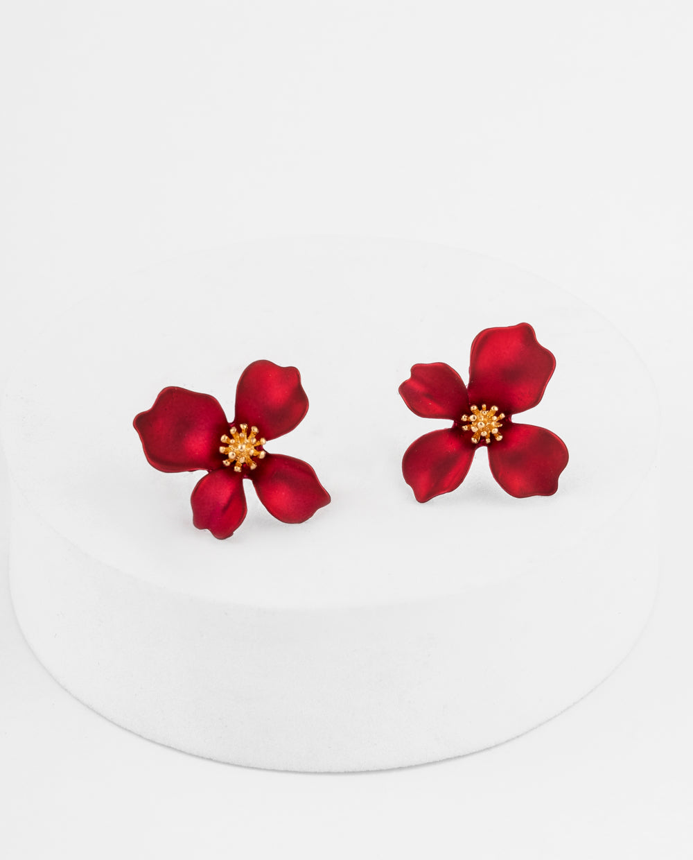 Aretes grandes en forma de flor con pétalos en tono rojo cábala y centro dorado texturizado. Diseño de cuatro pétalos con acabado satinado que resalta por su brillo suave y detalle elegante.