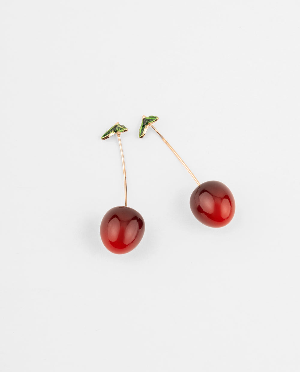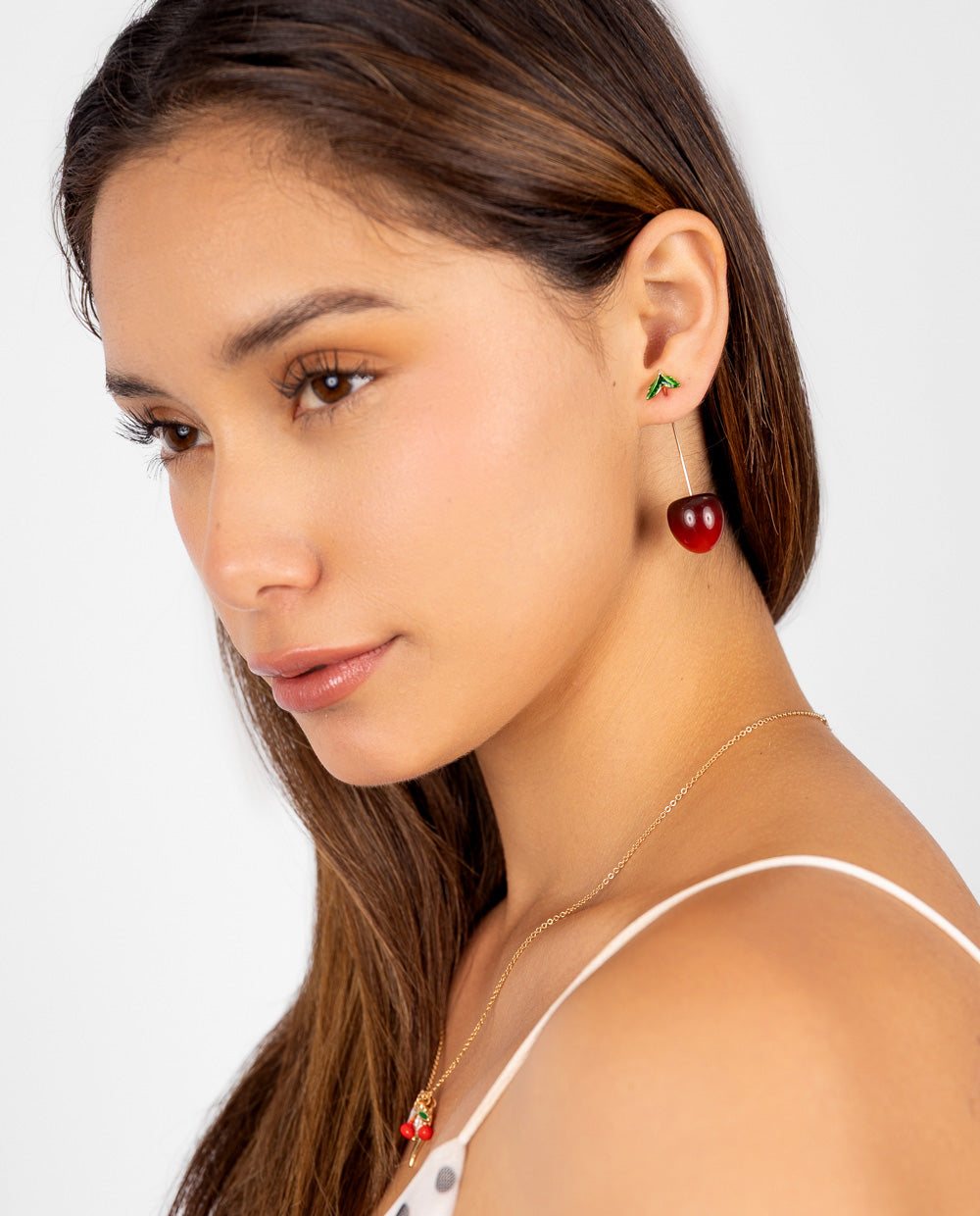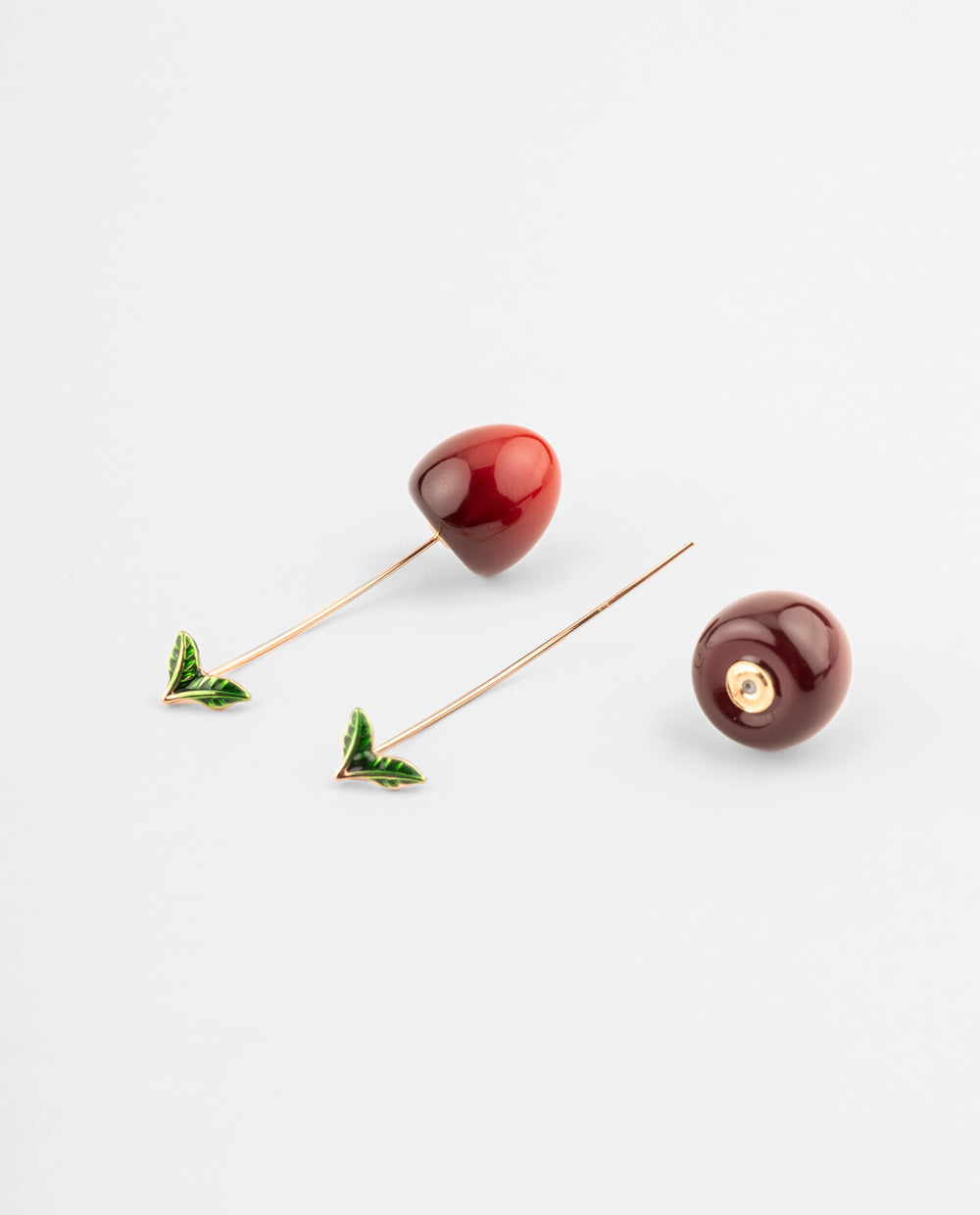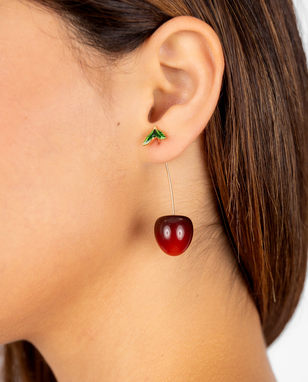 Aretes largos con estructura metálica dorada, hojas verdes esmaltadas y fruto rojo brillante en acabado liso. Diseño moderno y liviano que combina forma orgánica con efecto pulido.