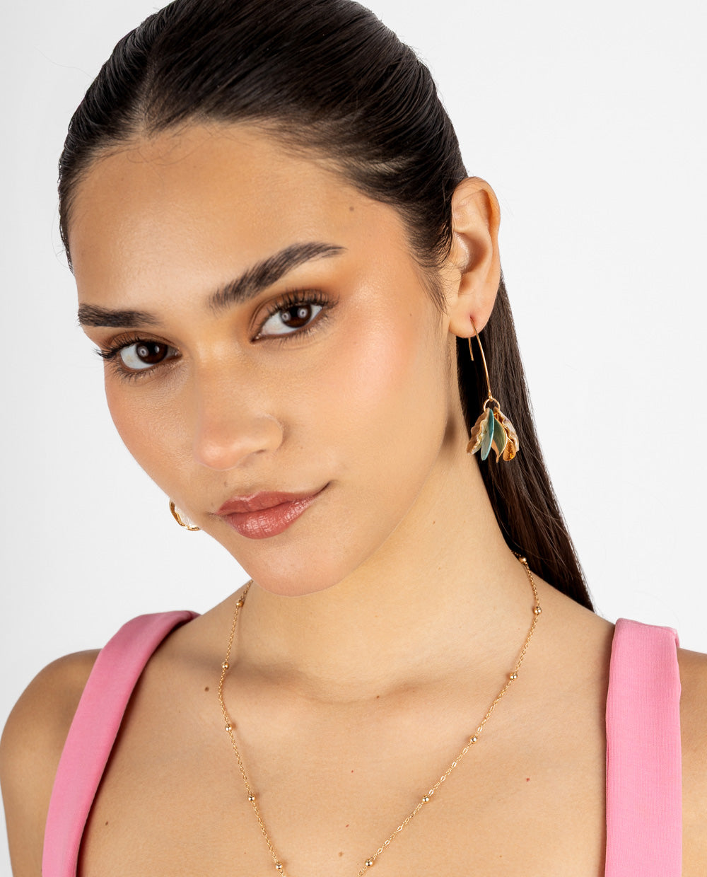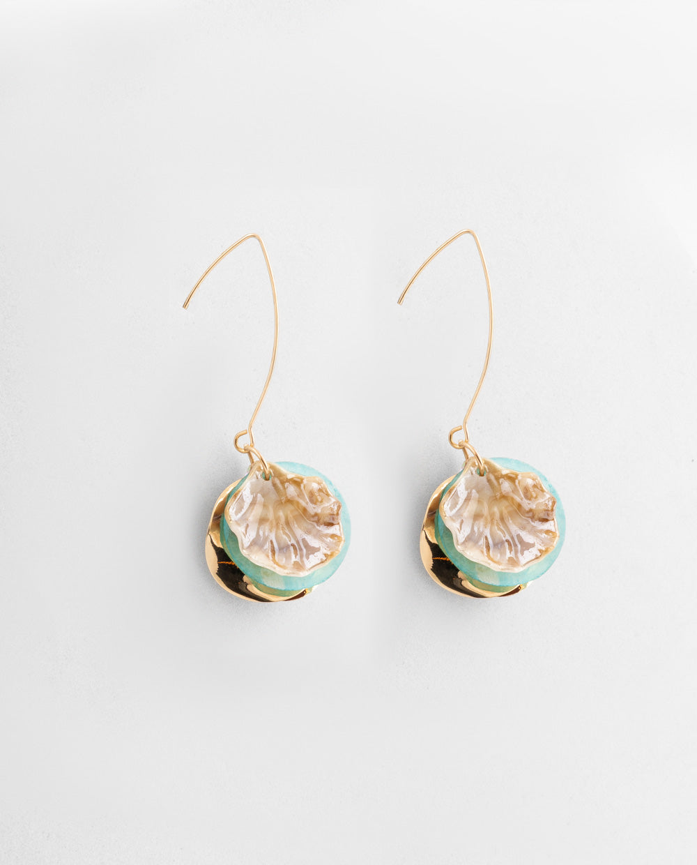 Aretes colgantes con juegos de discos dorados y detalles nacarados en tono mint, ligeros y con brillo suave que resalta cualquier look.