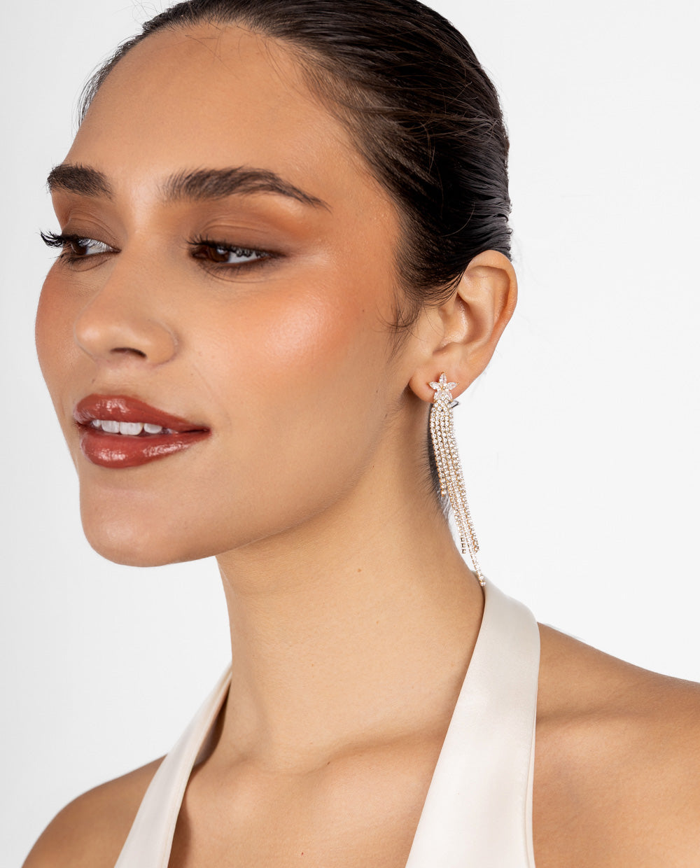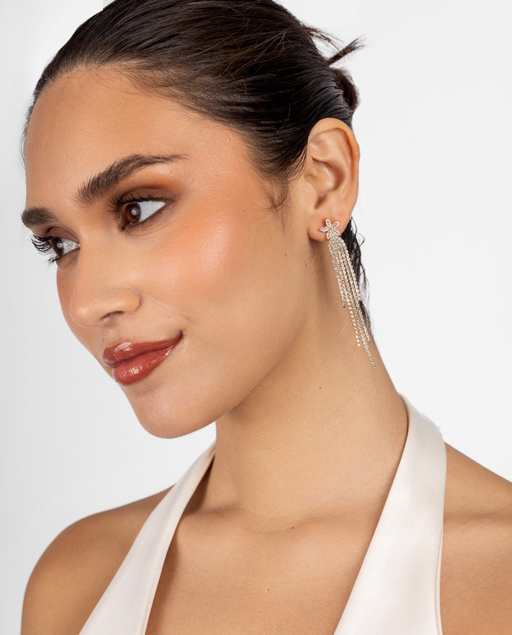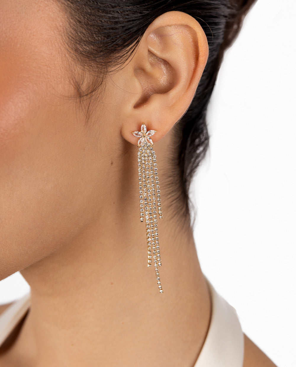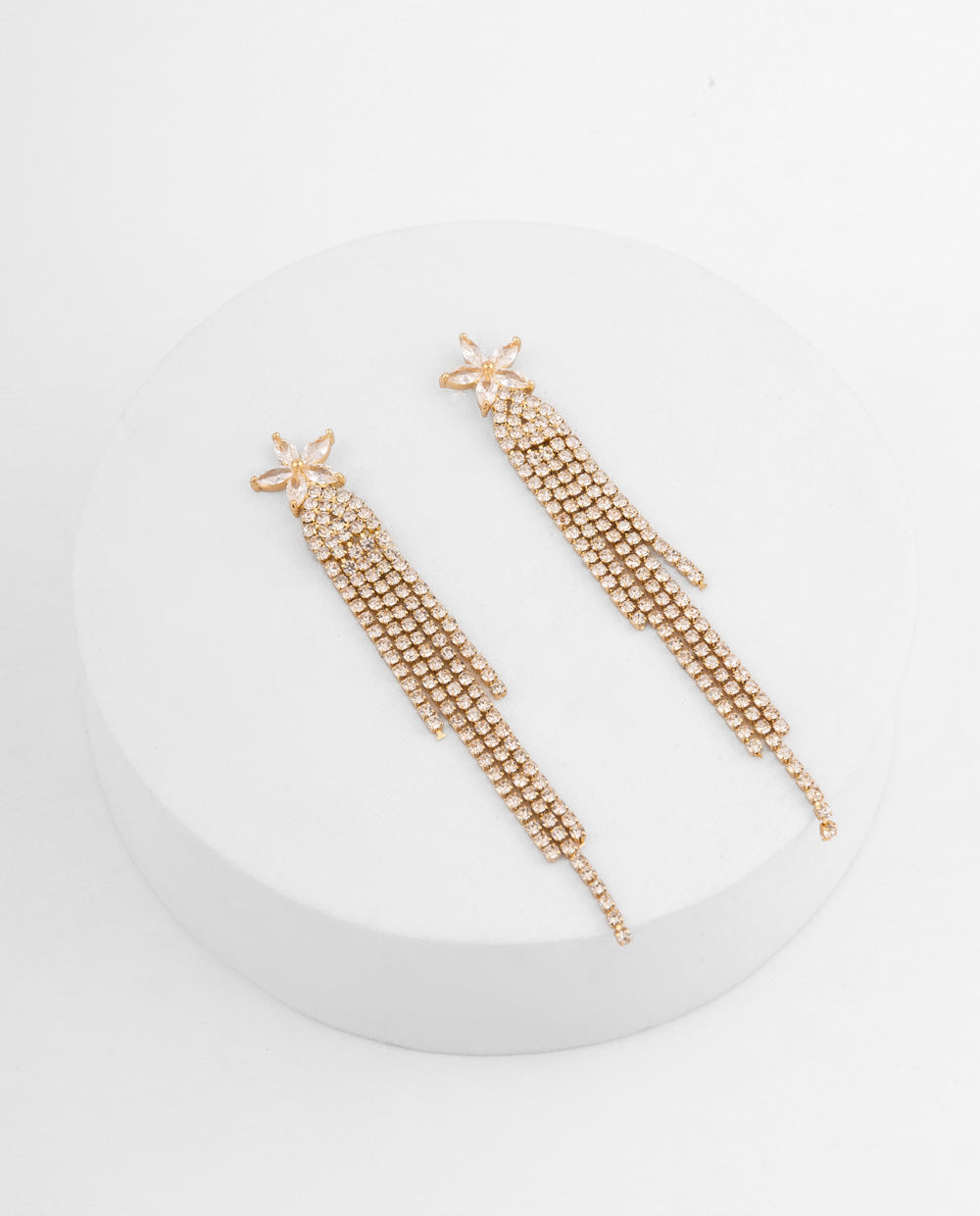 De nuestra colección Moda, diseñados con una delicada flor en la parte superior que da paso a una caída en cascada de múltiples cadenas brillantes. Su acabado dorado y lleno de destellos los convierte en el accesorio ideal para looks de noche o de fiesta, aportando movimiento y luminosidad en cada paso.