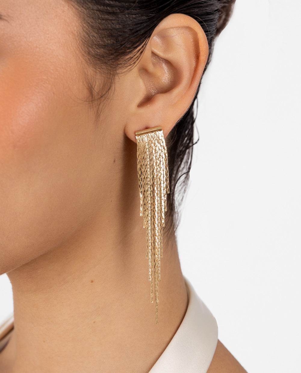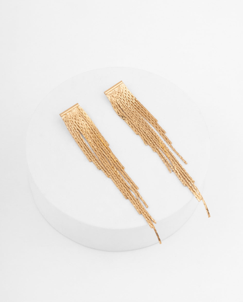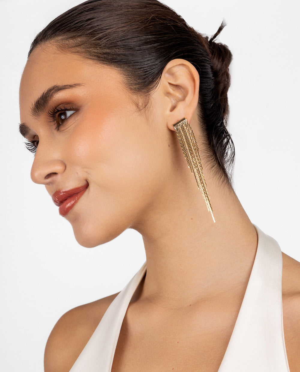 De la colección Moda, ideales para un look de fiesta lleno de estilo. Su diseño de flecos dorados aporta brillo y movimiento, convirtiéndolos en el accesorio perfecto para destacar en ocasiones especiales y noches elegantes.