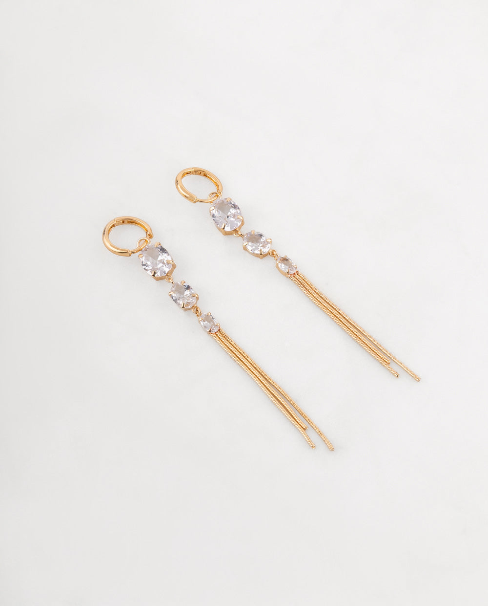 Aretes colgantes en acabado dorado con pedrería de zircón que aporta un brillo elegante y sofisticado. Su diseño estilizado con finas cadenas genera movimiento y luz en cada paso. Ideales para complementar looks de noche o elevar un outfit minimalista con un toque glam.