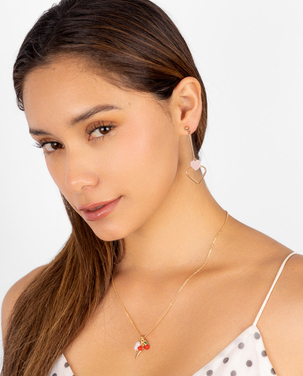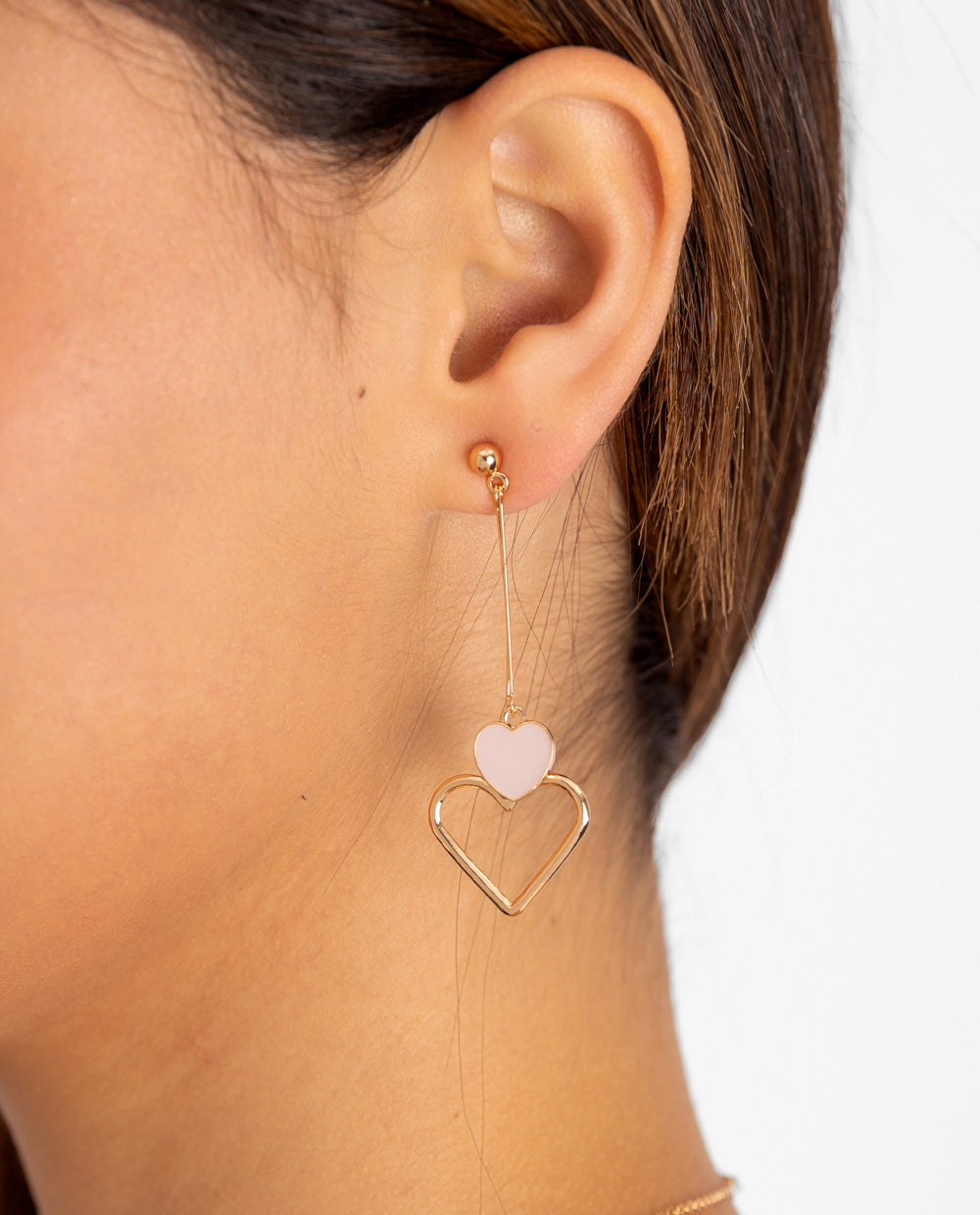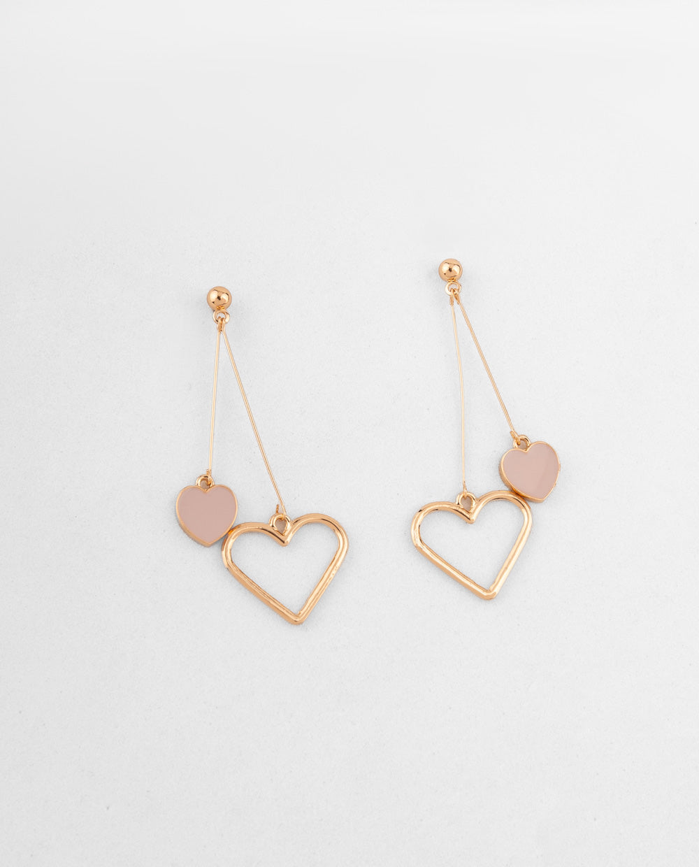 Aretes largos colgantes con estructura dorada y dos dijes de corazón: uno calado y otro esmaltado en tono nude. Diseño liviano con líneas finas y acabado brillante que aporta movimiento sutil.