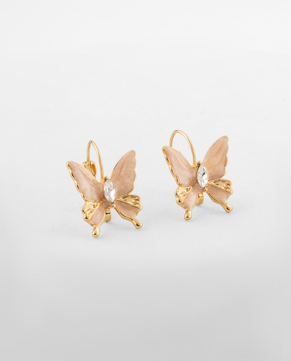 Aretes con mariposas en acabado dorado y alas en tono rosado suave, detalle delicado y femenino para iluminar cualquier look.