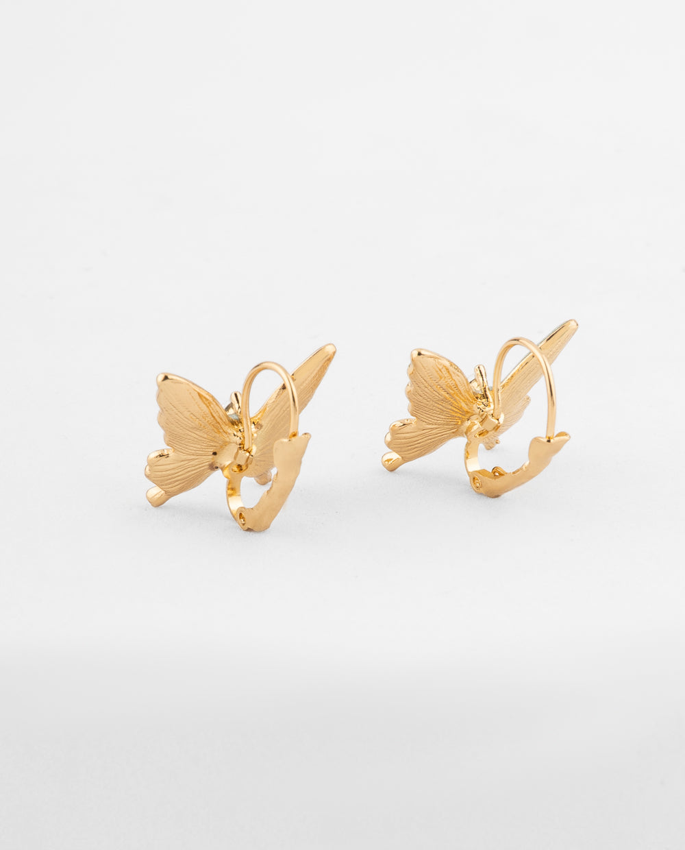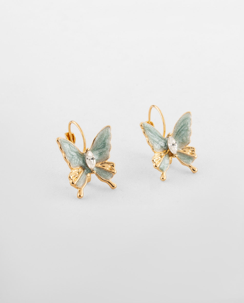 Aretes con mariposas en acabado dorado y alas en tono verde suave, detalle delicado y femenino para iluminar cualquier look.