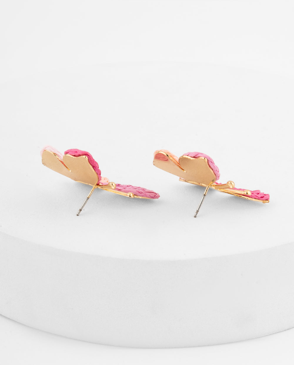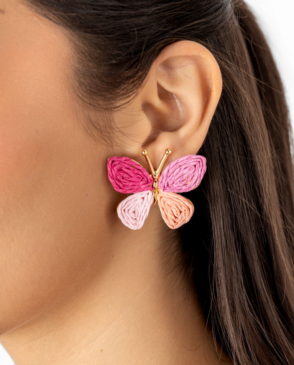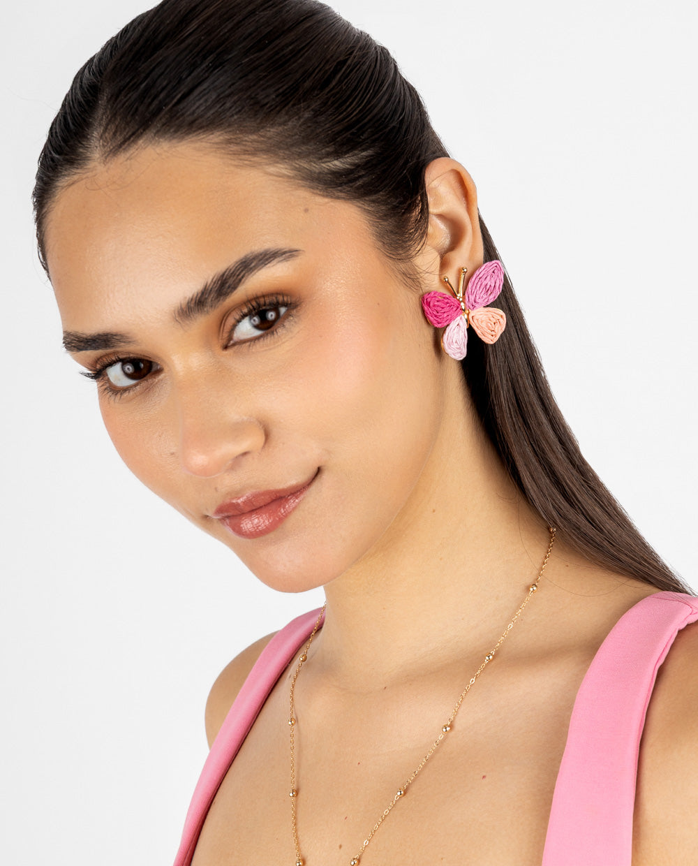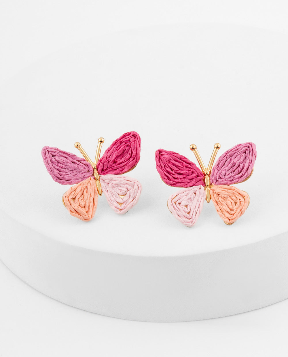 Aretes grandes tipo stud con mariposa en tonos rosados y textura trenzada, ideales para un look dulce y ligero.