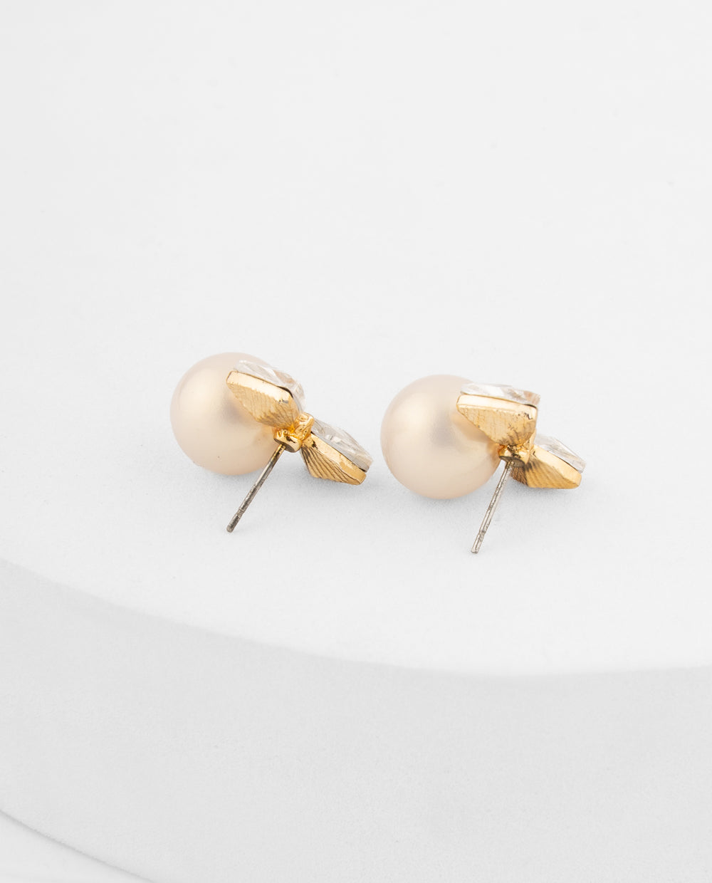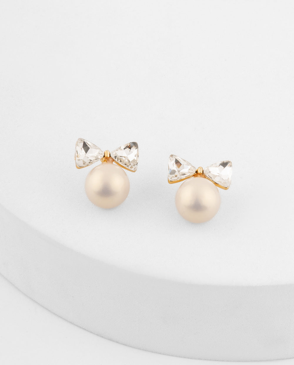 Aretes tipo stud con perla redonda y detalle de moño con incrustaciones brillantes. Diseño delicado y femenino ideal para looks clásicos.