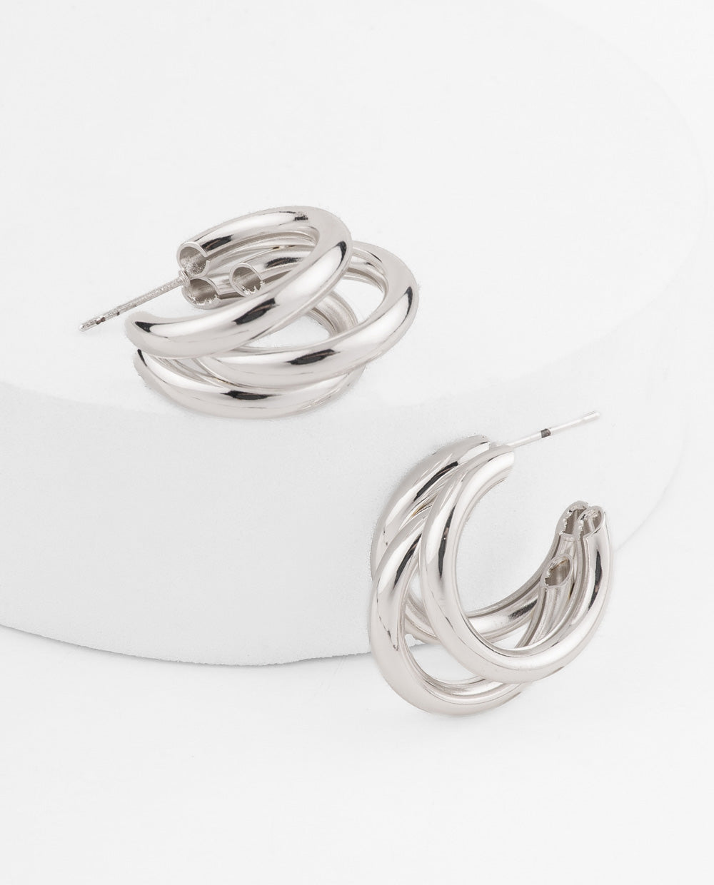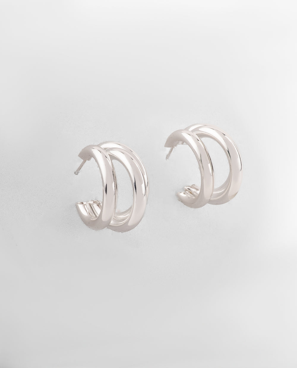 Aretes plateados en diseño de argolla triple con acabado brillante, que aportan un estilo moderno y fresco. Su versatilidad los convierte en el complemento perfecto para looks casuales con denim, realzando tu outfit con un aire trendy. Una pieza esencial que combina sencillez y sofisticación en cada ocasión.