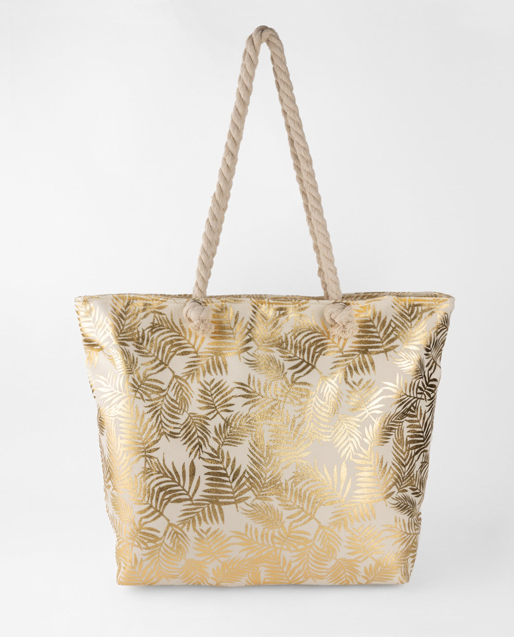 Bolso de playa estampado en dorado con diseño de hojas y asas de soga, amplio y ligero para llevar todo en verano.