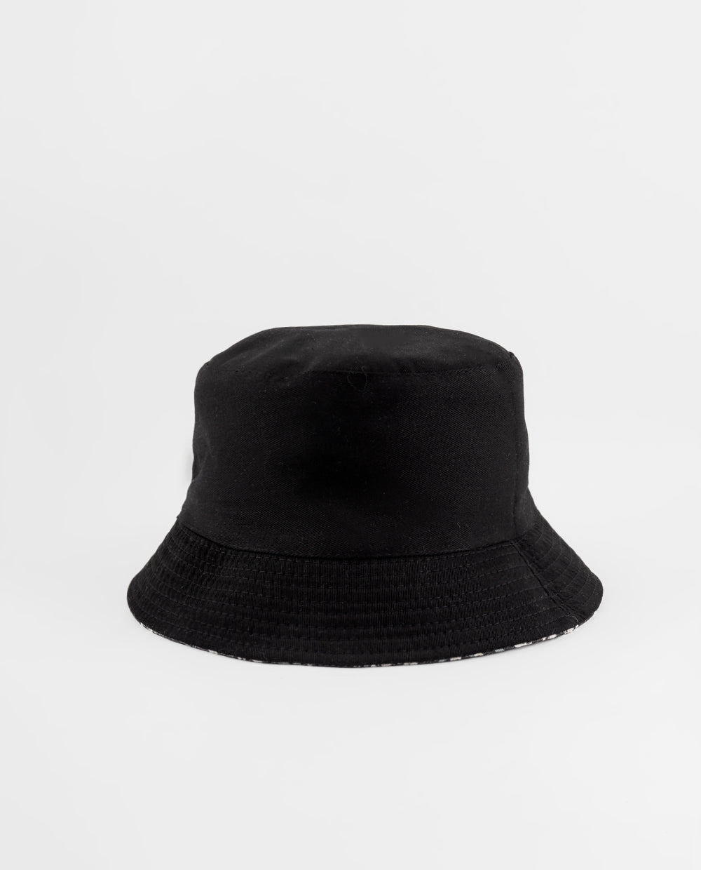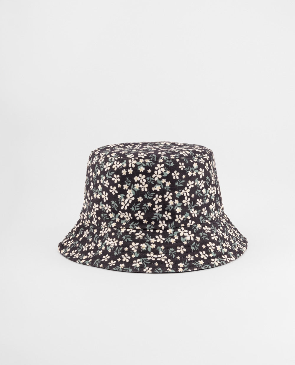 Bucket hat reversible con un lado de diseño floral en tono oscuro y el otro lado liso en color negro. Fabricado en algodón suave y ligero.