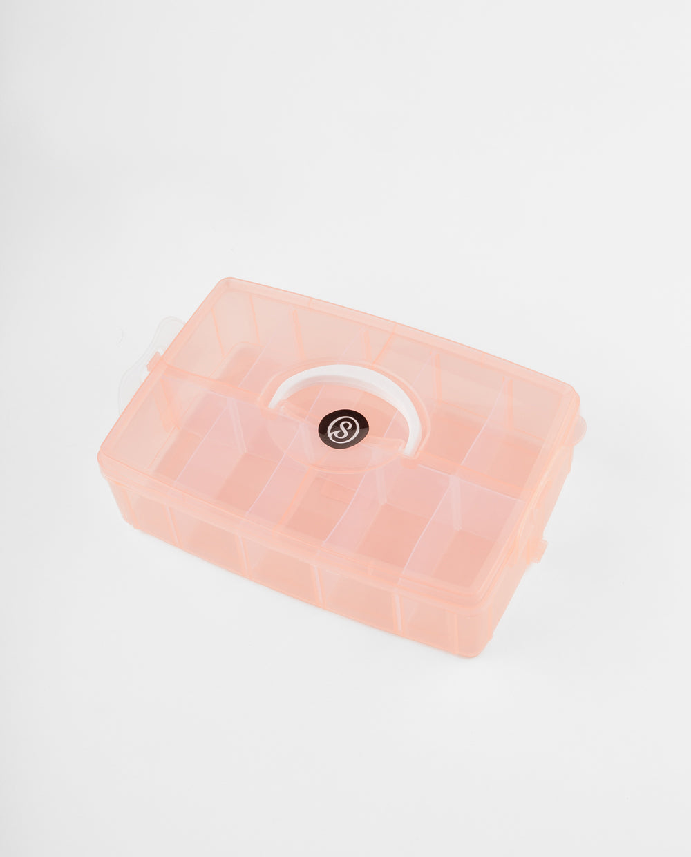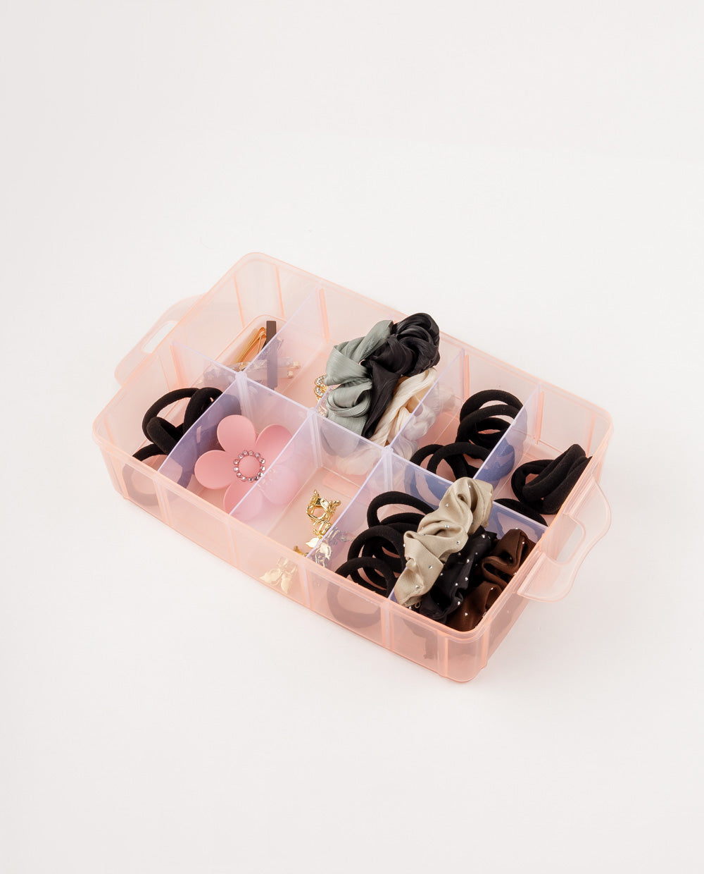 Mantén tus accesorios siempre en orden con esta práctica caja organizadora rosada. Su diseño con divisiones internas permite clasificar desde ligas y scrunchies hasta joyería y pequeños objetos personales. Ideal para llevar en la cartera, guardar en el clóset o usar en tu tocador, cuidando que cada cosa tenga su lugar.