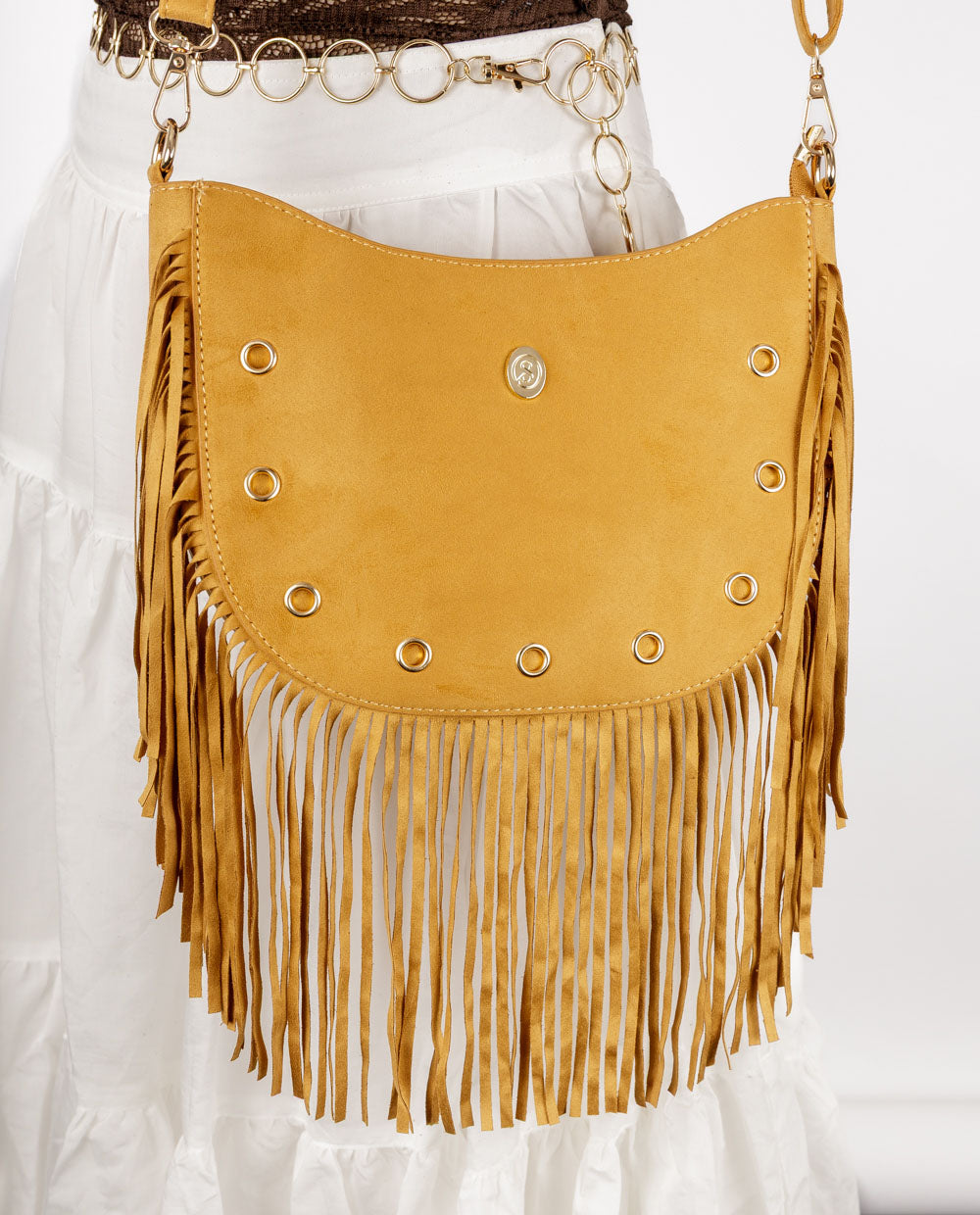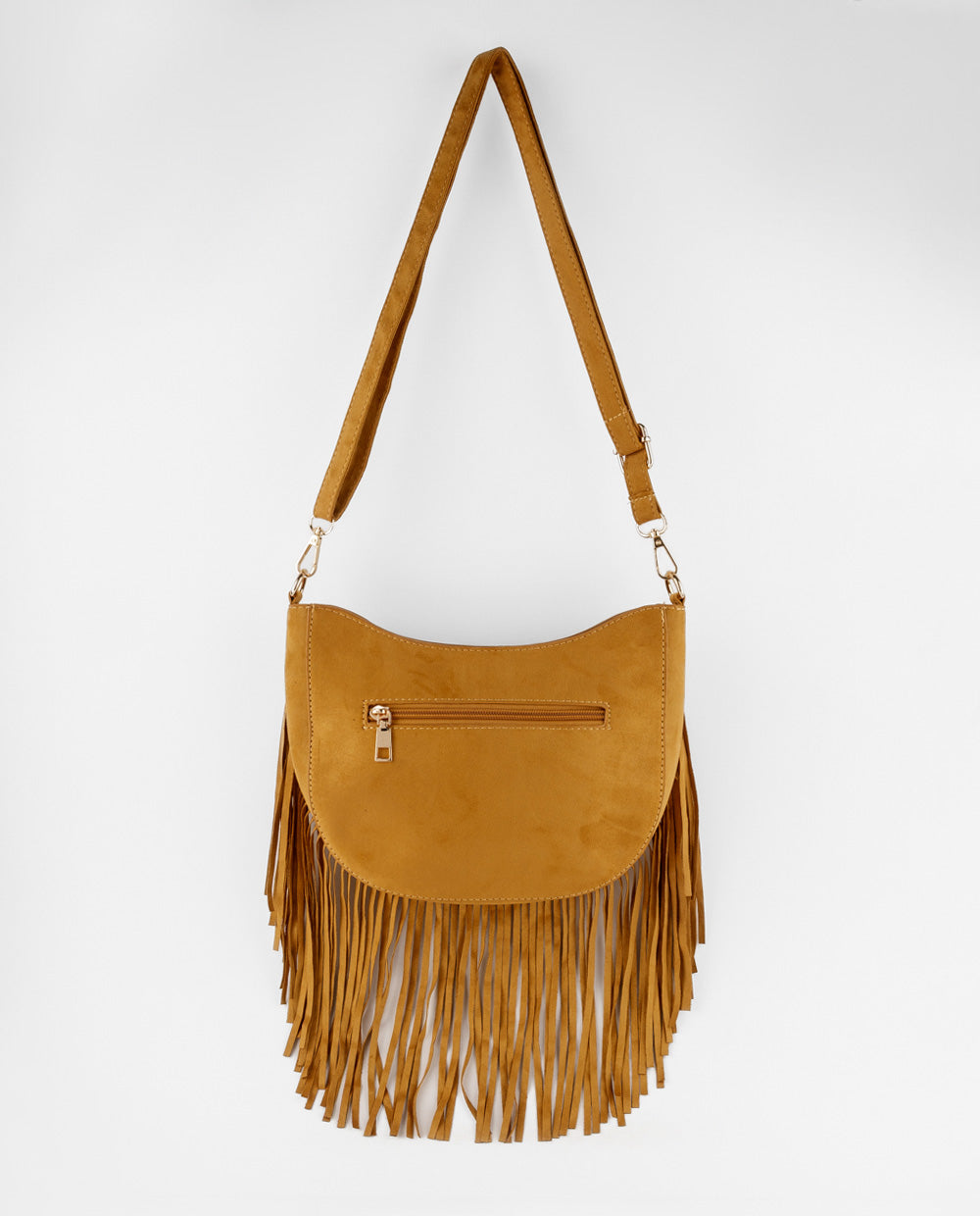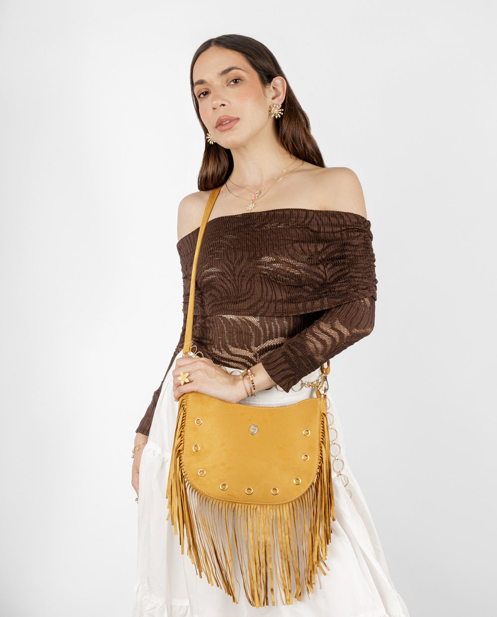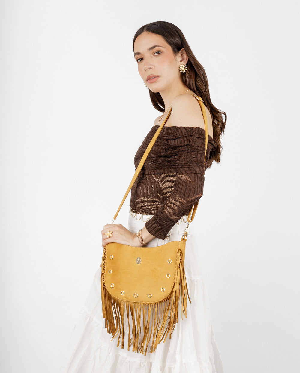 Con un diseño boho chic que no pasa desapercibido, esta cartera amarillo mostaza es ese toque de estilo que transforma tu outfit. Su textura de gamuza se complementa con detalles metálicos dorados y flecos que le dan movimiento y carácter. Tiene un compartimento principal con cierre y un bolsillo trasero para mayor practicidad. Su correa ajustable te permite llevarla cómodamente al hombro o cruzada tipo crossbody, ideal para looks casuales, de fin de semana o salidas con amigas.