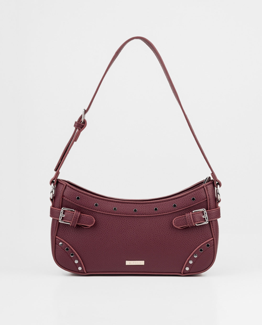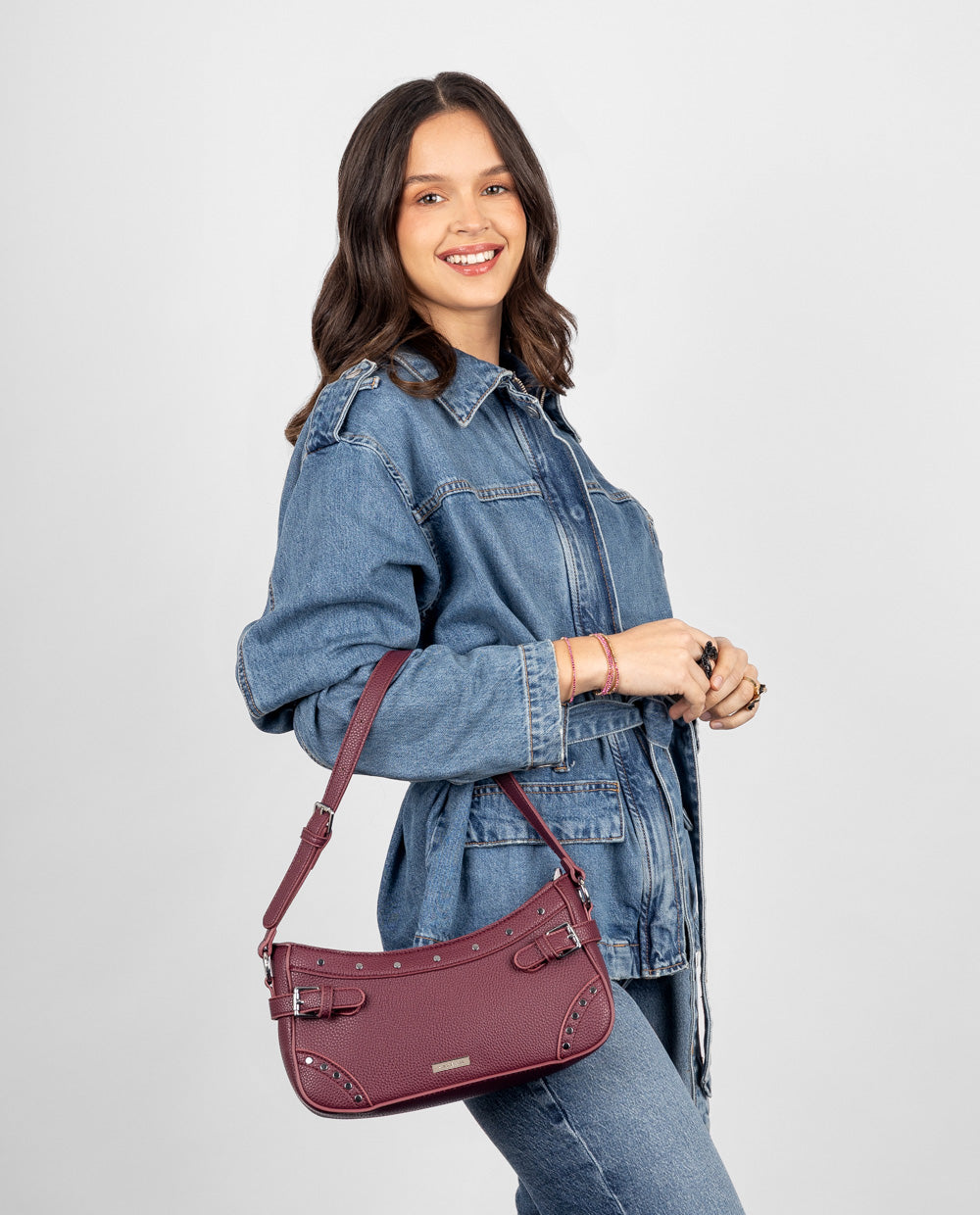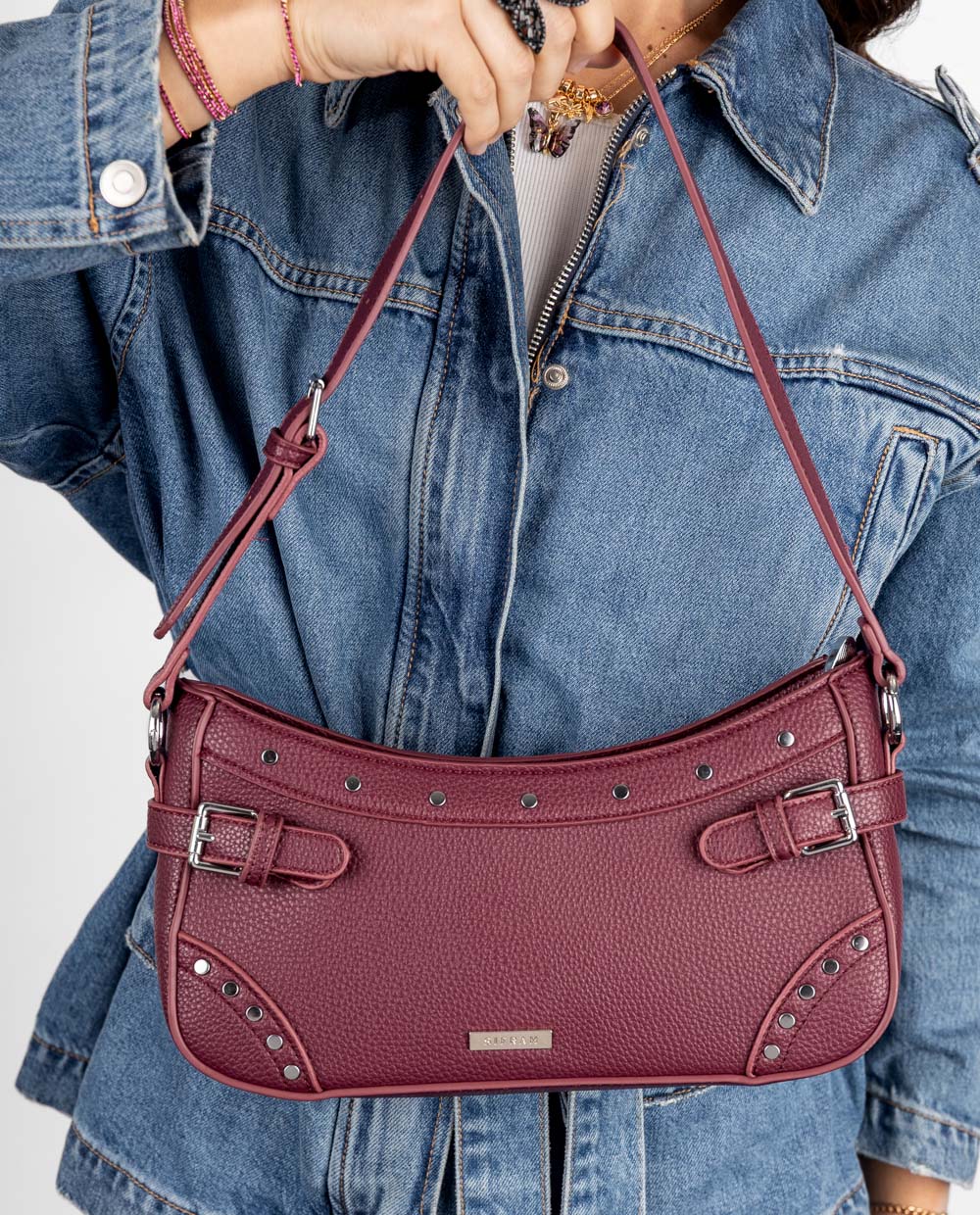 Con un tono uva que roba miradas y un diseño con hebillas y tachas metálicas, esta cartera baguette combina actitud y estilo. Ideal para looks casuales con un toque atrevido. ¡Una aliada chic para brillar 24/7! #SifrahmigaStyle