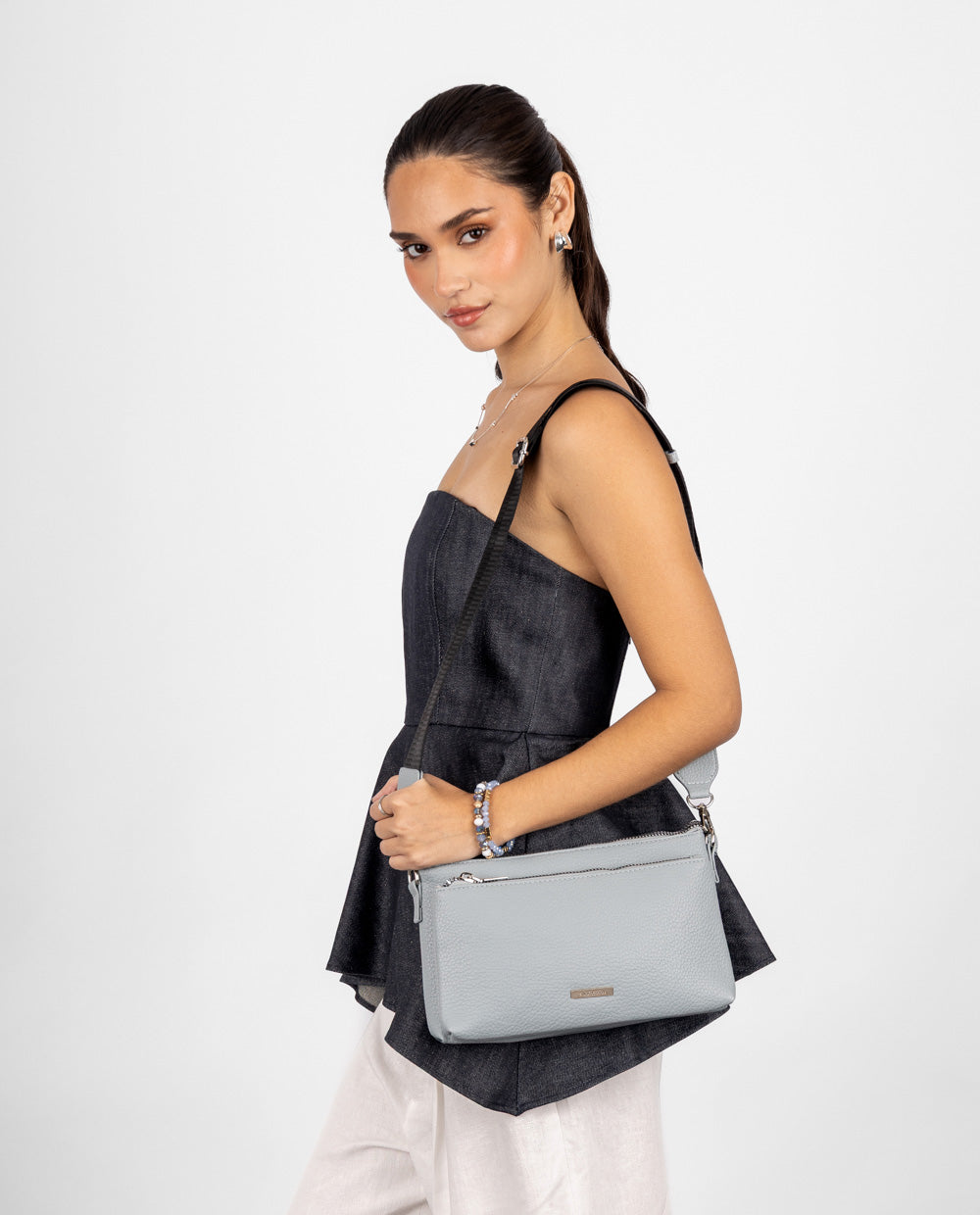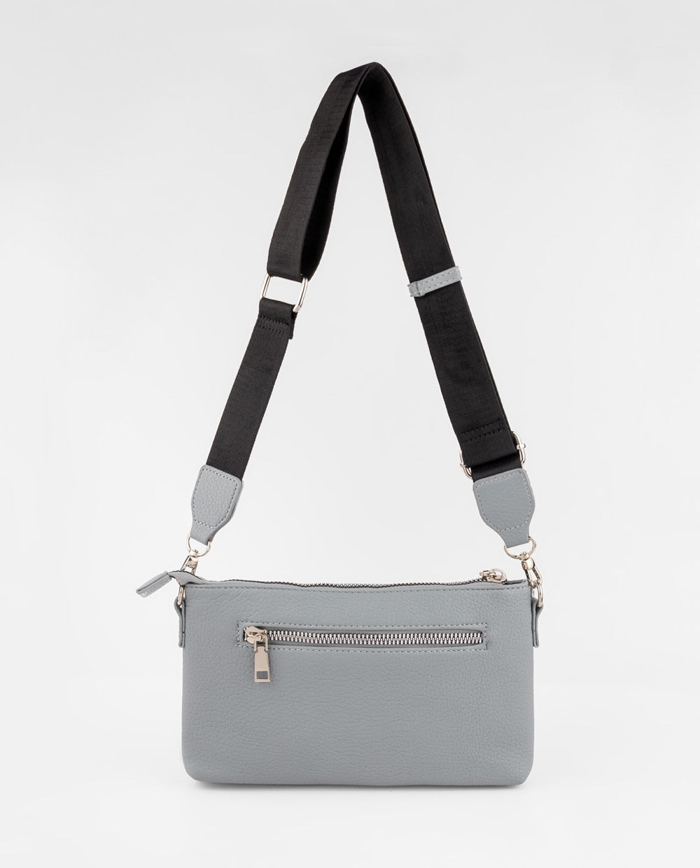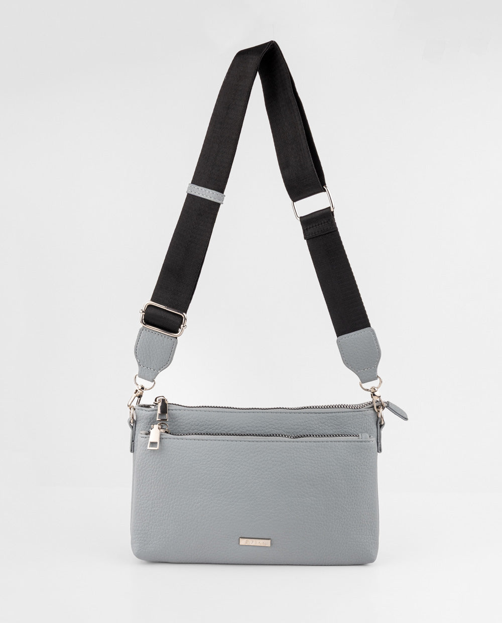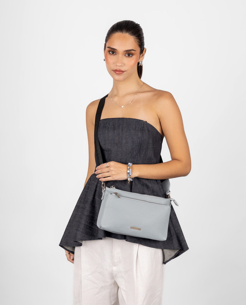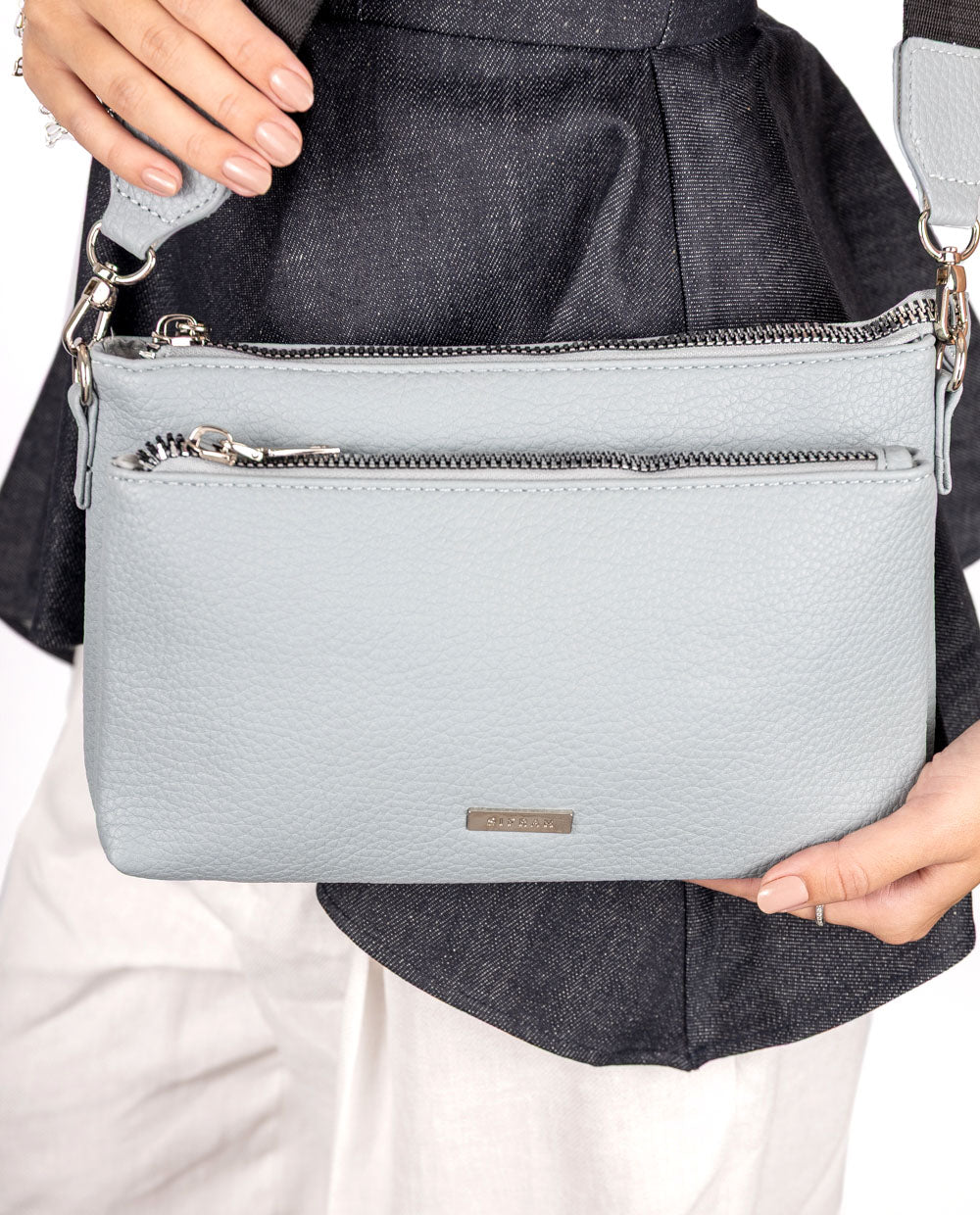 Un accesorio versátil y fresco que combina comodidad y estilo en cada salida. Su diseño en tono celeste con textura elegante se realza con una correa ancha bicolor ajustable que aporta un aire moderno y práctico. Puedes llevarla cruzada o al hombro, siempre manteniendo tus esenciales seguros con su cierre superior. Ideal para complementar looks casuales y urbanos bajo la tendencia Back to denim, creando un contraste chic con outfits denim o prendas neutras.