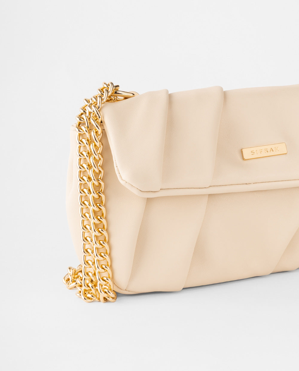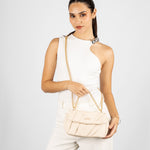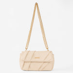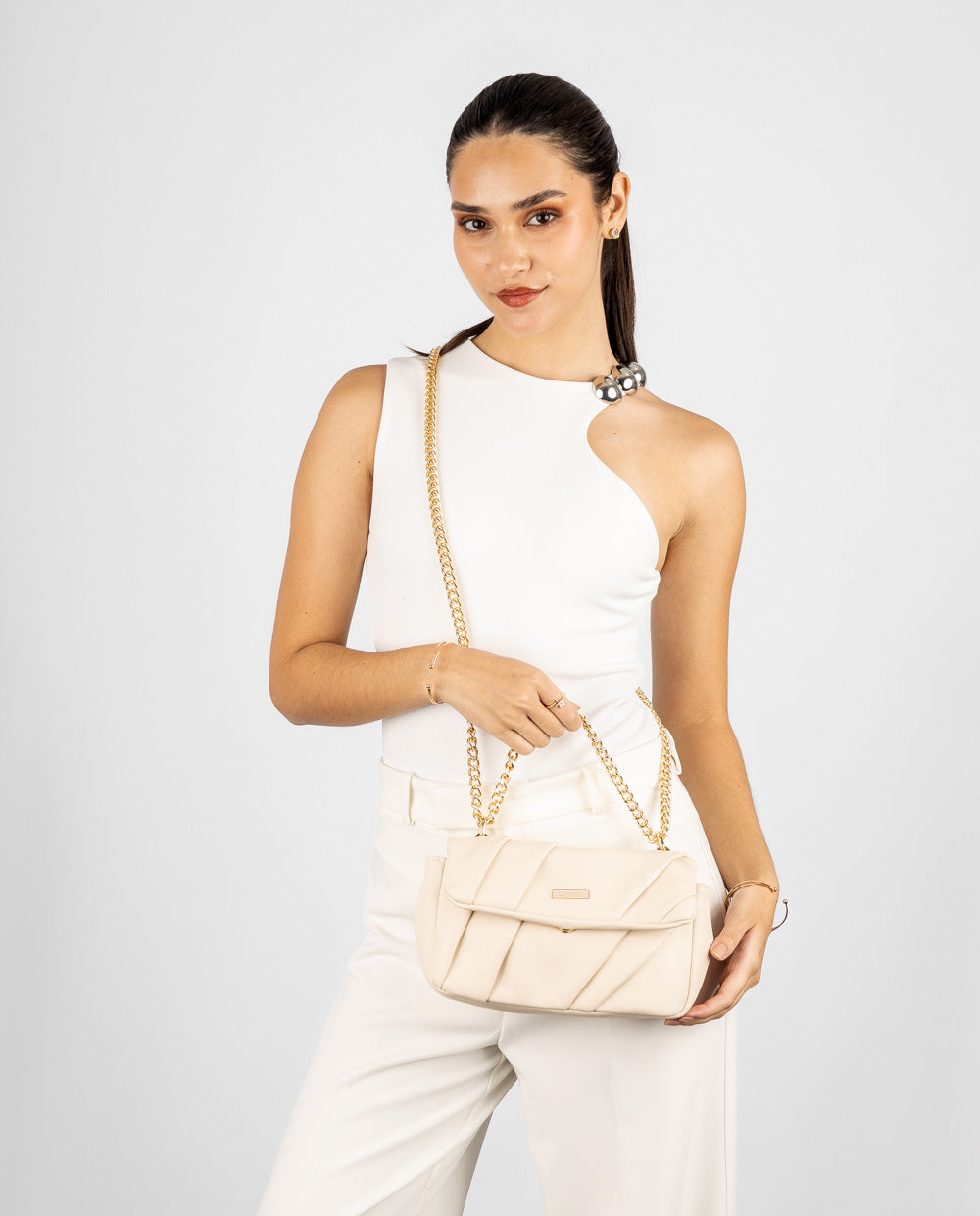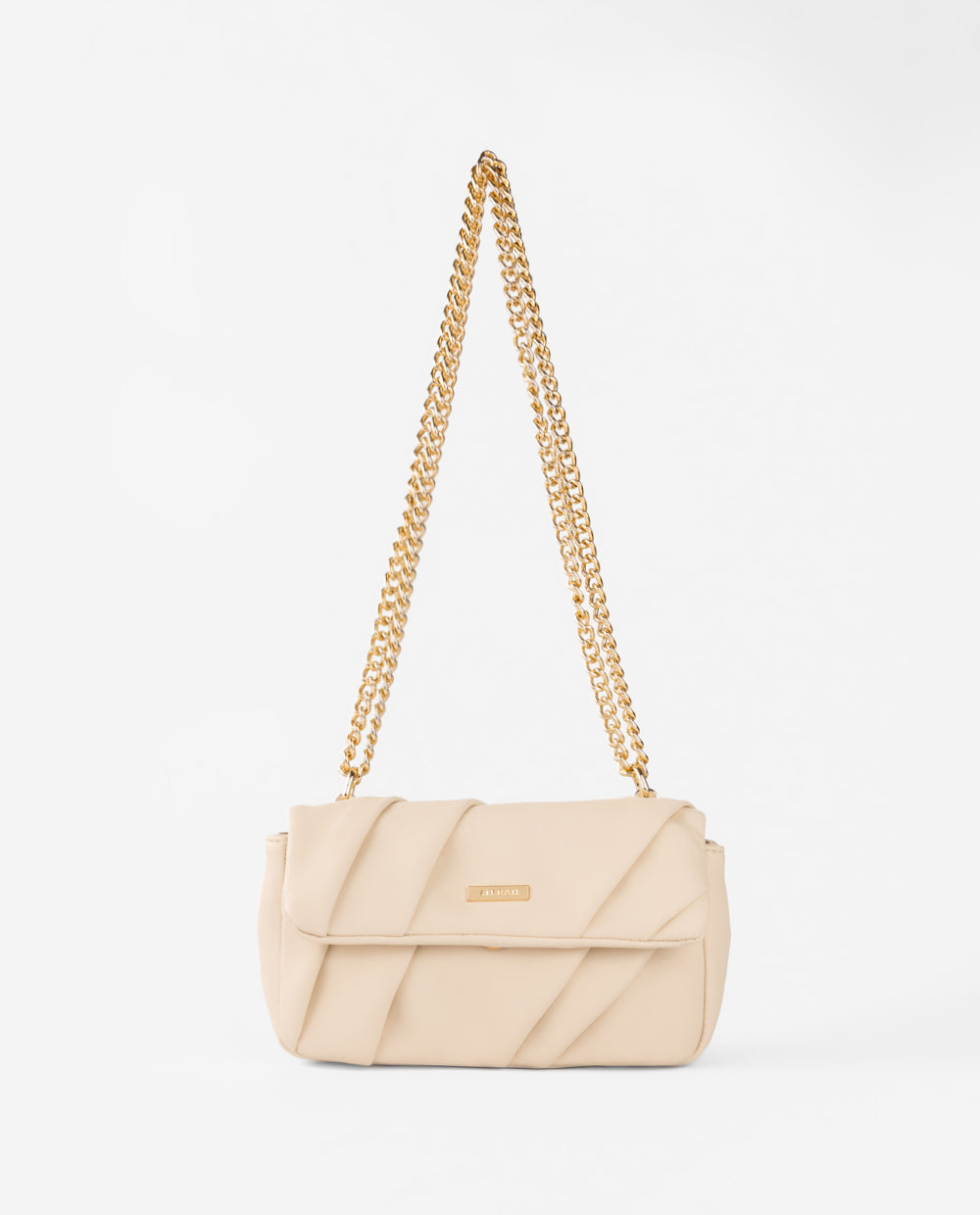 Cartera en material PU beige con diseño acolchado en líneas diagonales y tapa frontal con cierre seguro. Incluye doble cadena dorada que permite llevarla cruzada o al hombro.