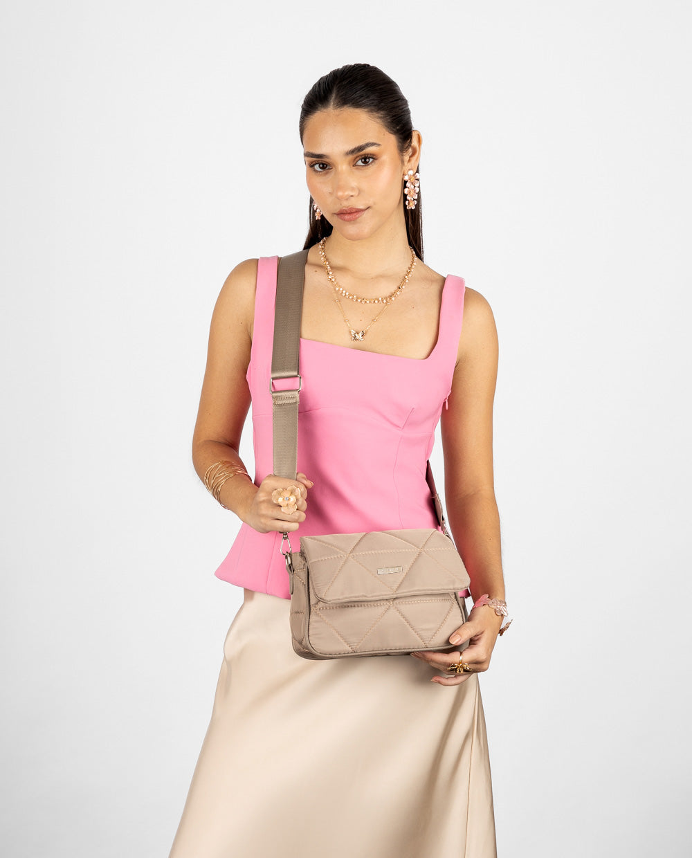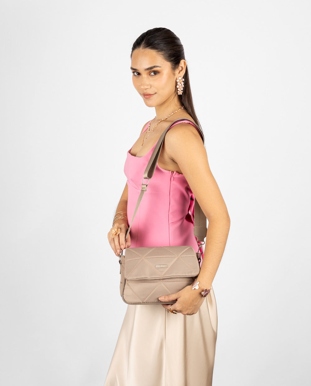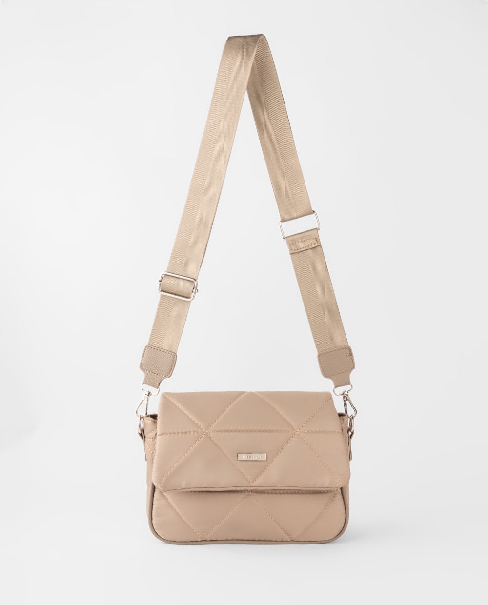 Cartera beige acolchada en patrones geométricos y tapa frontal con cierre seguro. Incluye correa ancha ajustable y desmontable que aporta comodidad para uso diario.