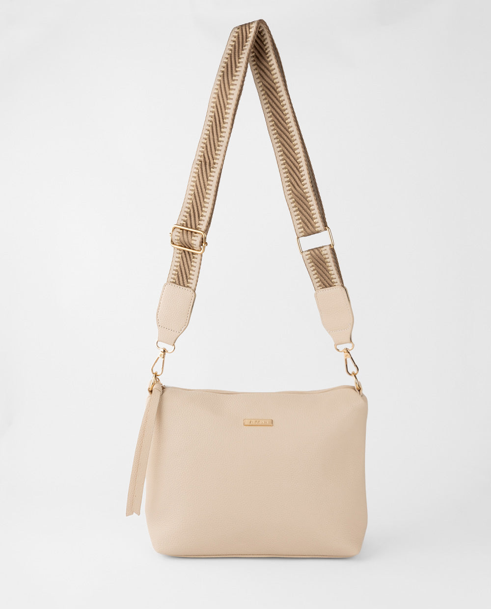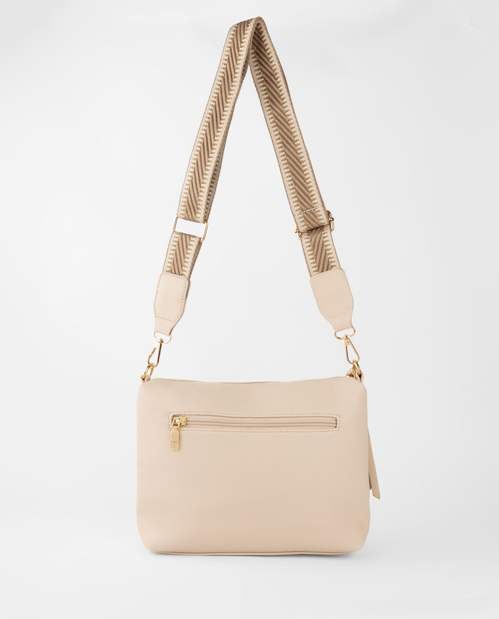 Cartera beige en material PU, equipada con bolsillo posterior con cierre y compartimento principal amplio. Incluye correa ancha estampada, ajustable y desmontable, que aporta comodidad.
