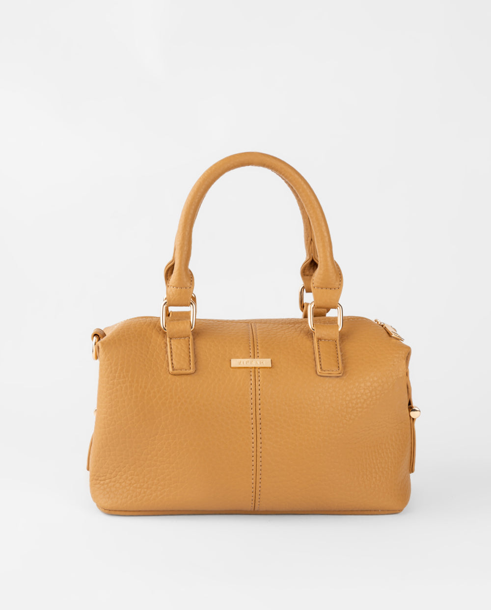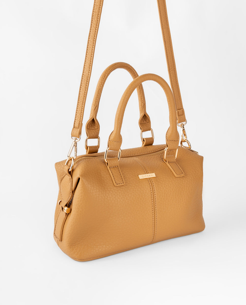 Cartera tipo bowling en material PU color camel con textura graneada, diseñada con compartimento principal amplio y cierre superior. Incluye asas rígidas y correa desmontable y ajustable para llevarla al hombro o cruzada.