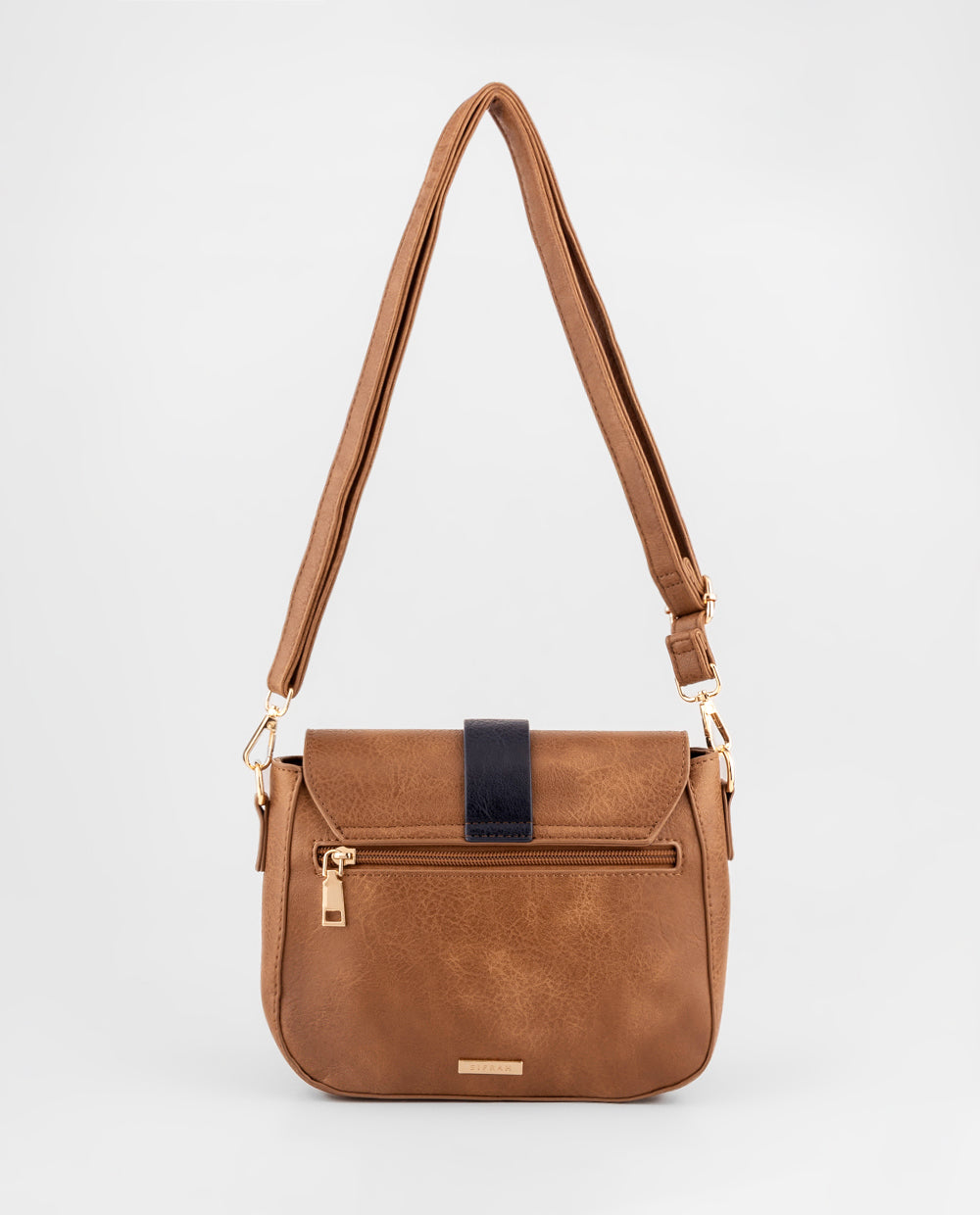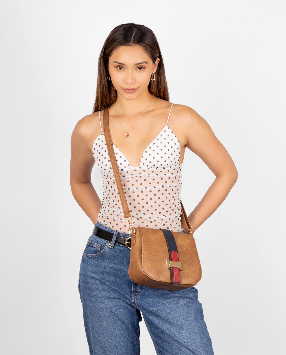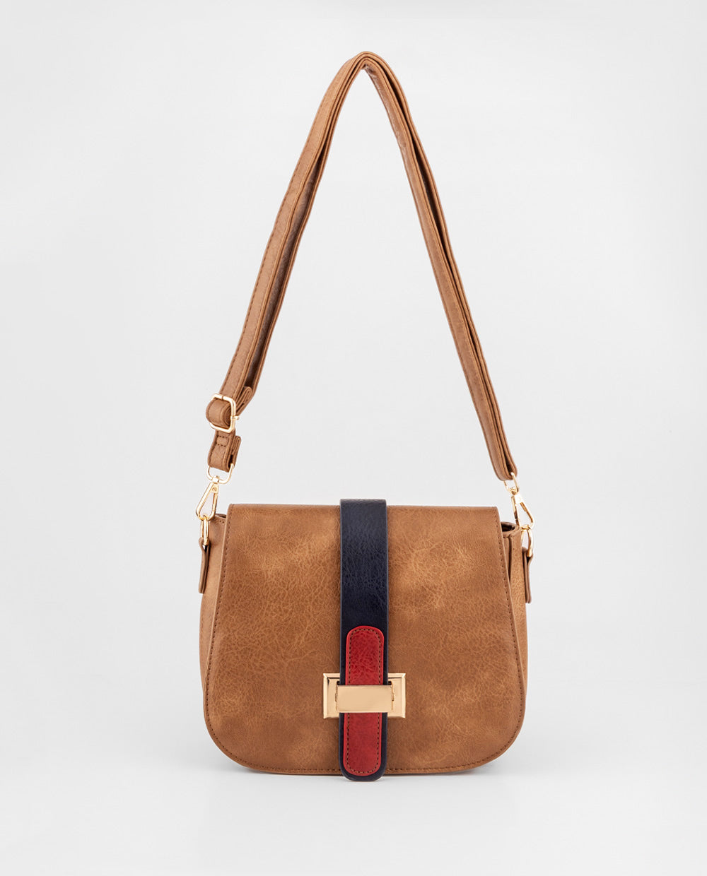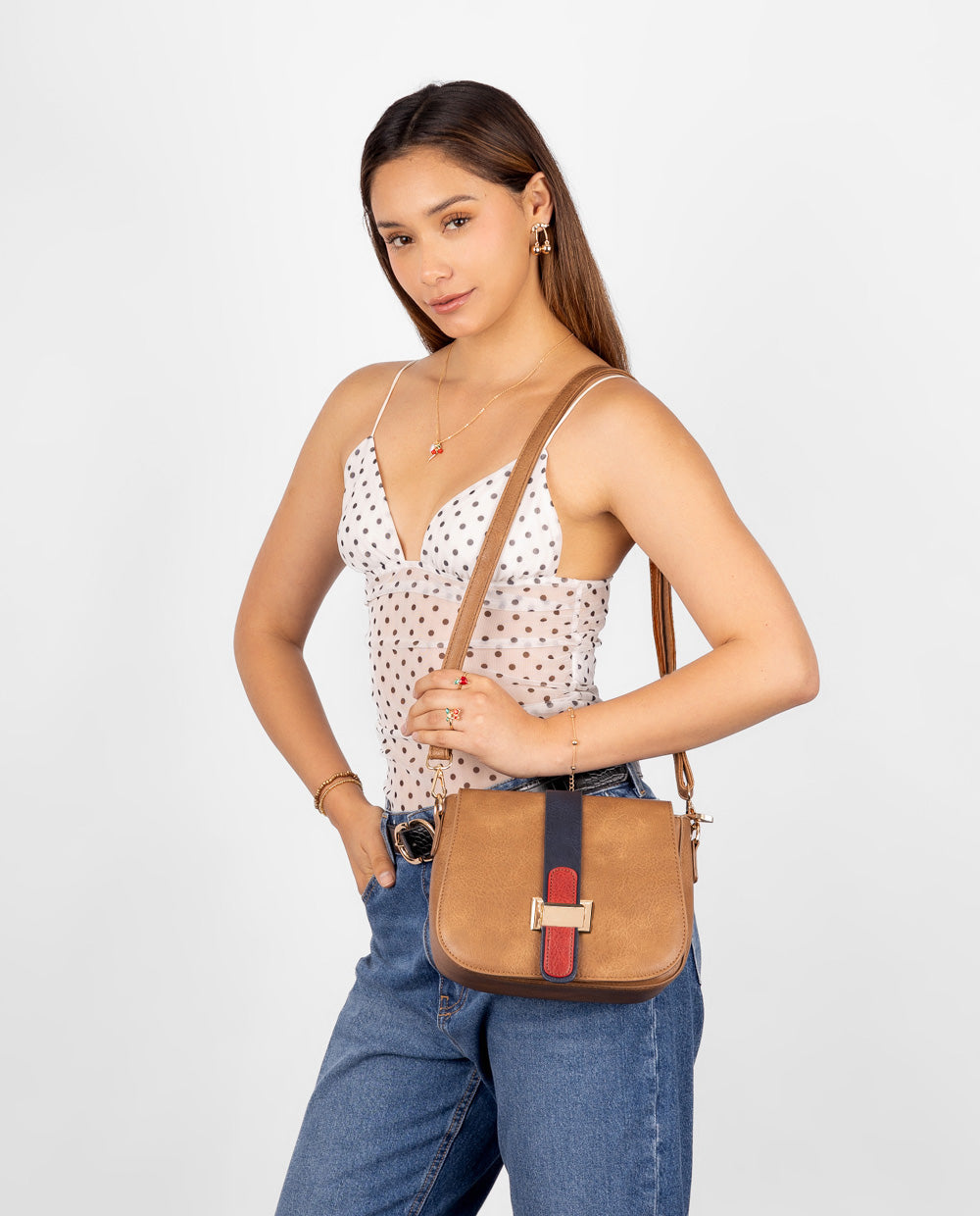 Cartera camel en material PU con acabado cuero. Presenta detalle frontal bicolor en azul marino y rojo, cierre imantado con hebilla dorada y bolsillo posterior con cierre. Incluye correa ajustable para usarla cruzada.