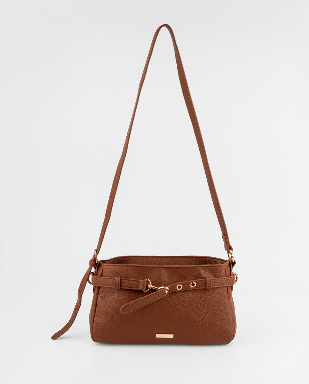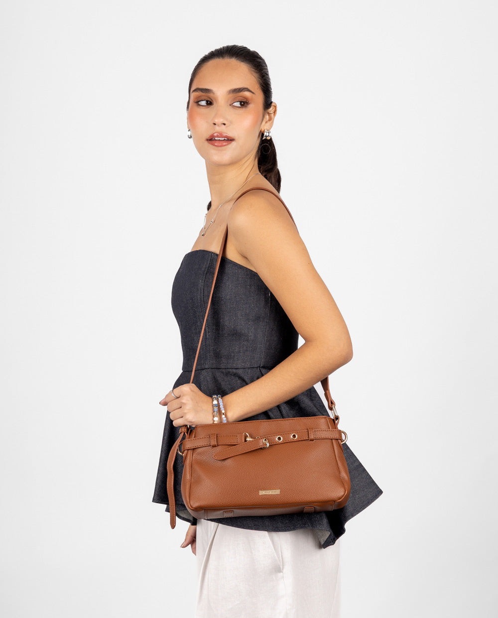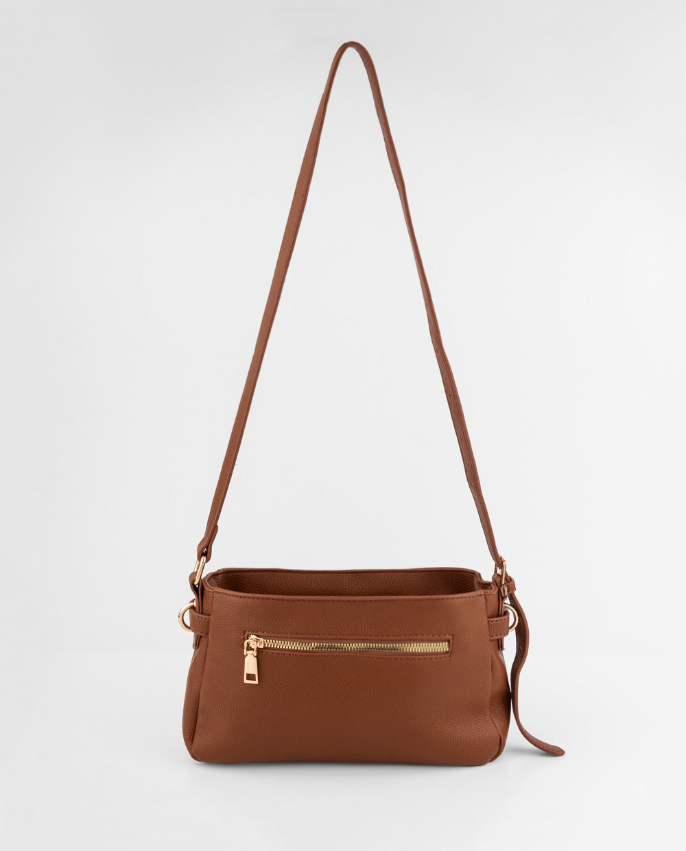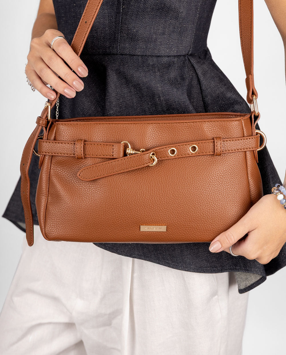 Eleva tu look diario con esta cartera camel de diseño versátil y detalle de hebilla decorativa. Su correa ajustable permite llevarla al hombro o cruzada, adaptándose a cada momento de tu rutina. Compacta pero funcional, cuenta con el espacio ideal para llevar lo esencial con estilo. Perfecta para acompañar outfits casuales o de oficina, es un básico chic que no puede faltar en tu guardarropa.