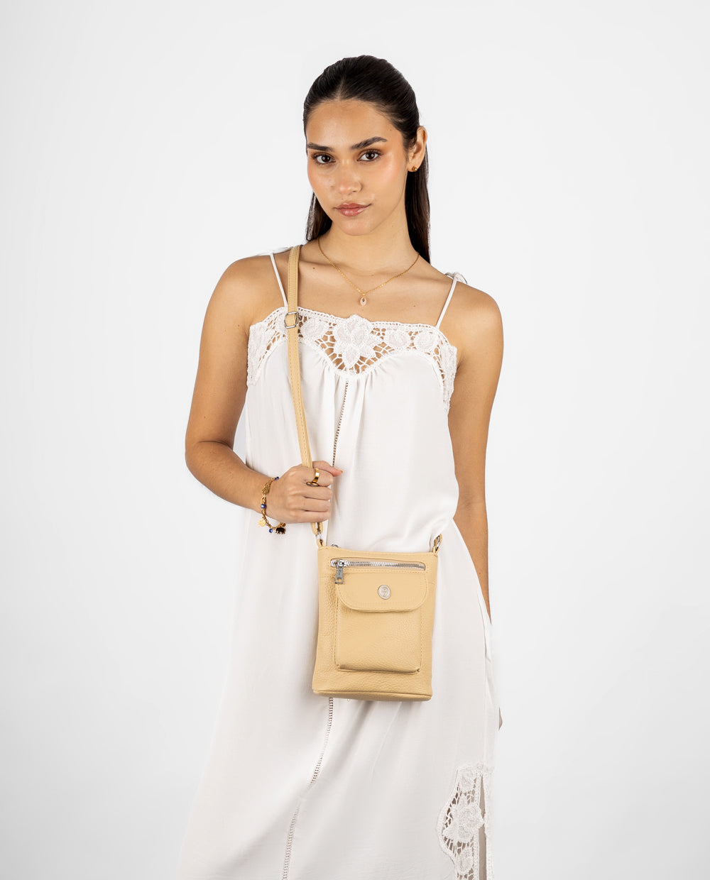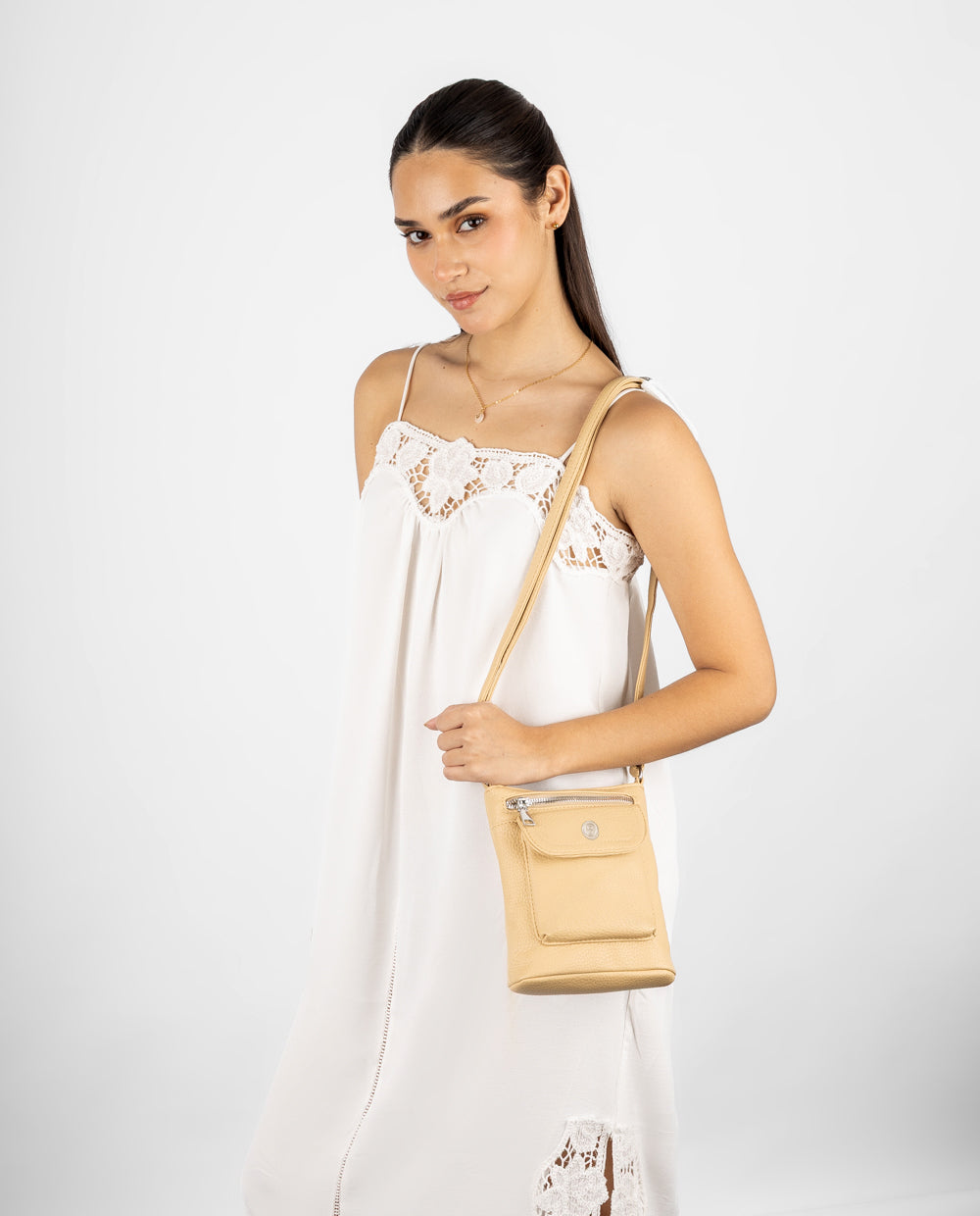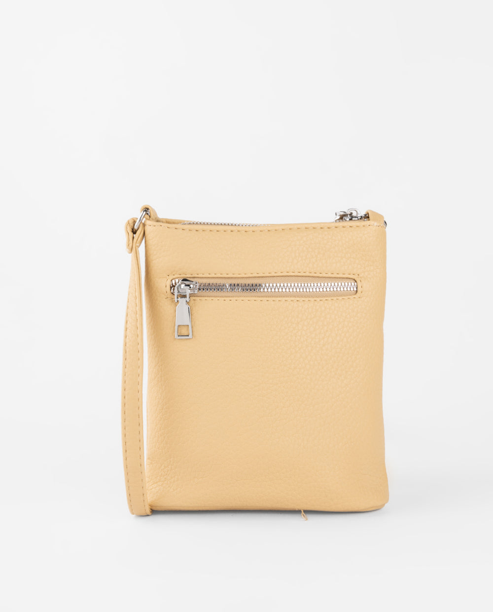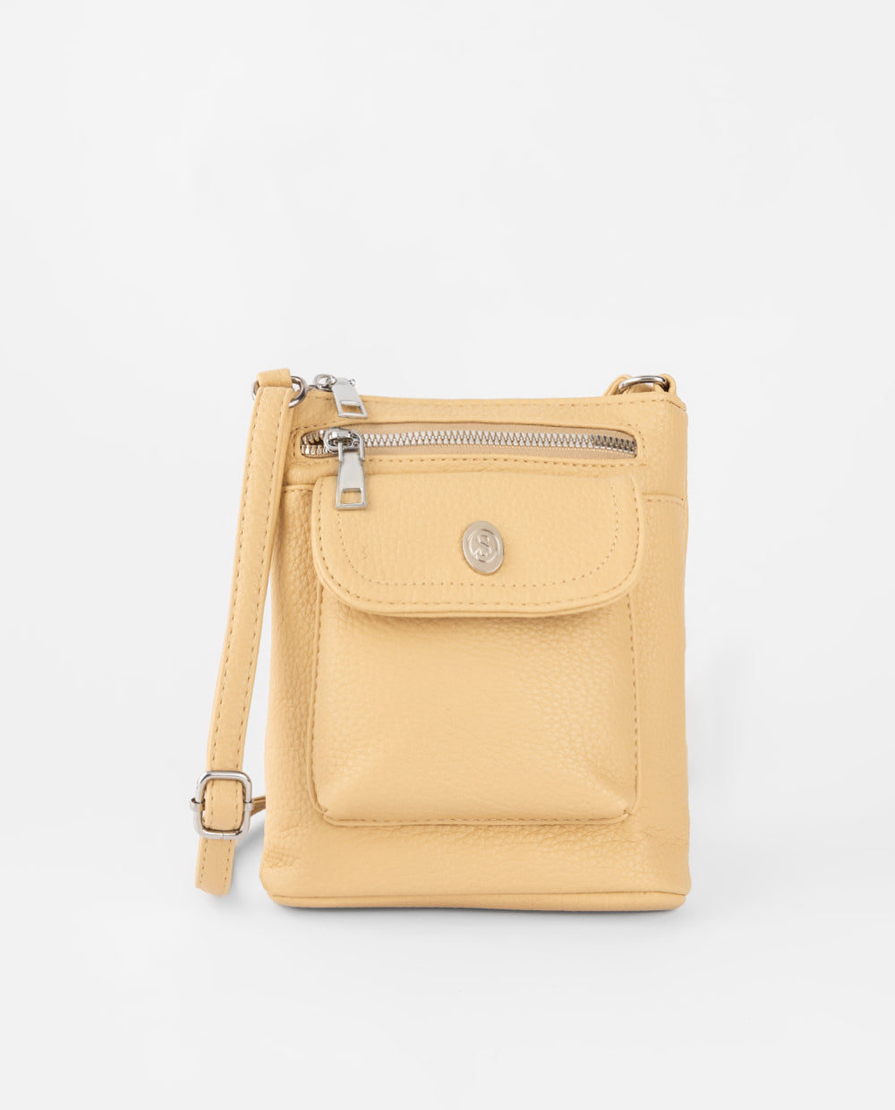 Cartera crossbody amarilla de PU con cierre superior y bolsillo frontal. Incluye correa ajustable, para llevarla cruzada.