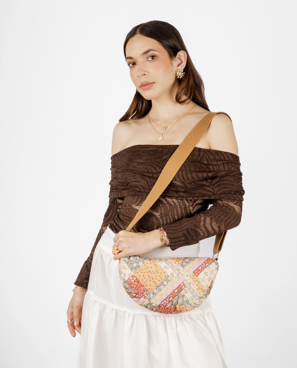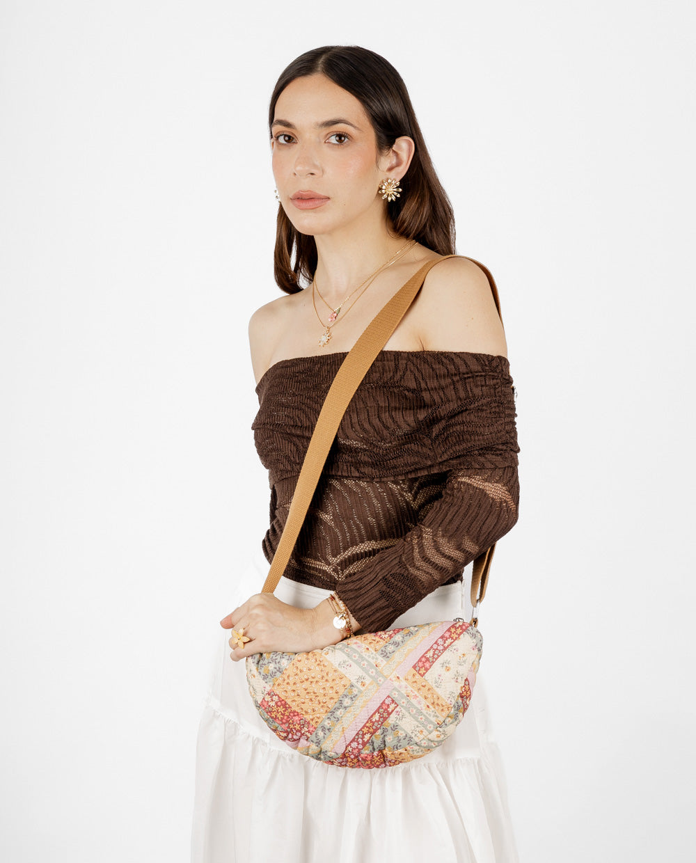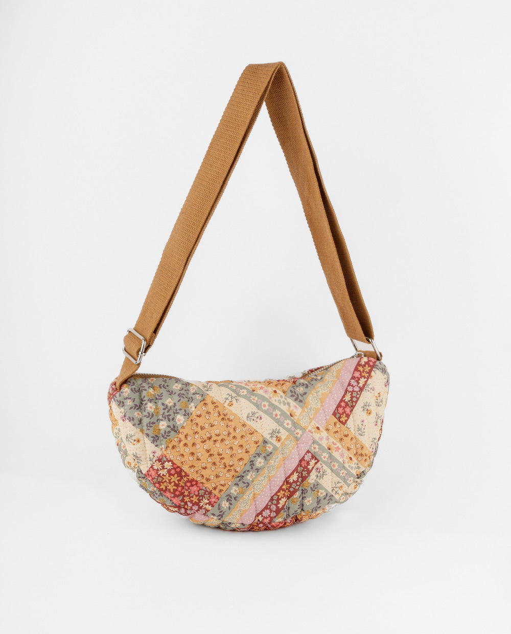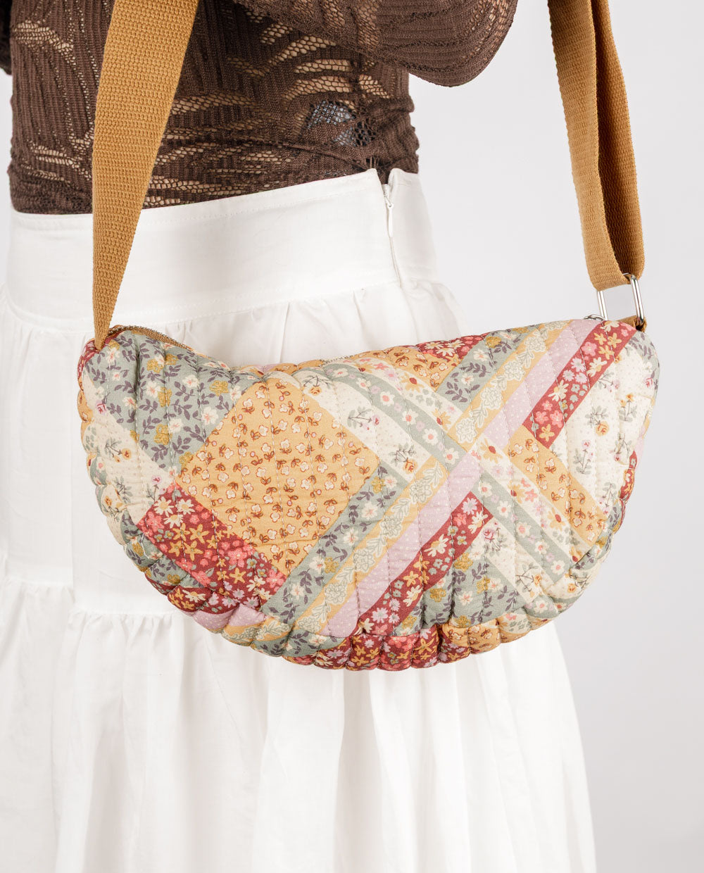 Esta cartera estilo patchwork combina retazos florales en tonos tierra que le dan un aire vintage y romántico. Cuenta con una correa ancha de tela regulable, ideal para llevarla cómodamente al hombro o en estilo crossbody. Perfecta para complementar looks casuales con un toque boho y femenino.