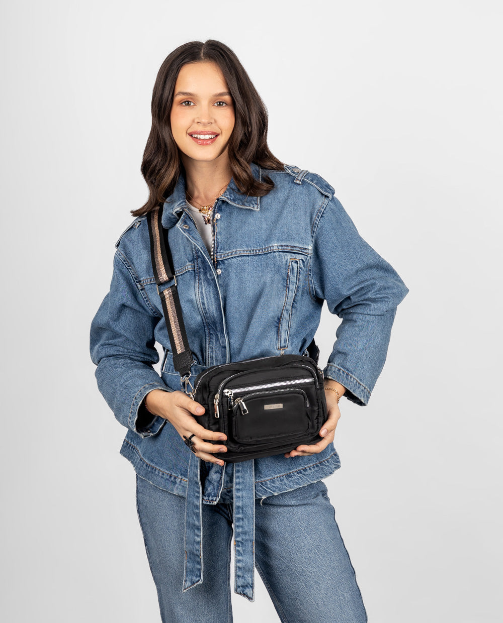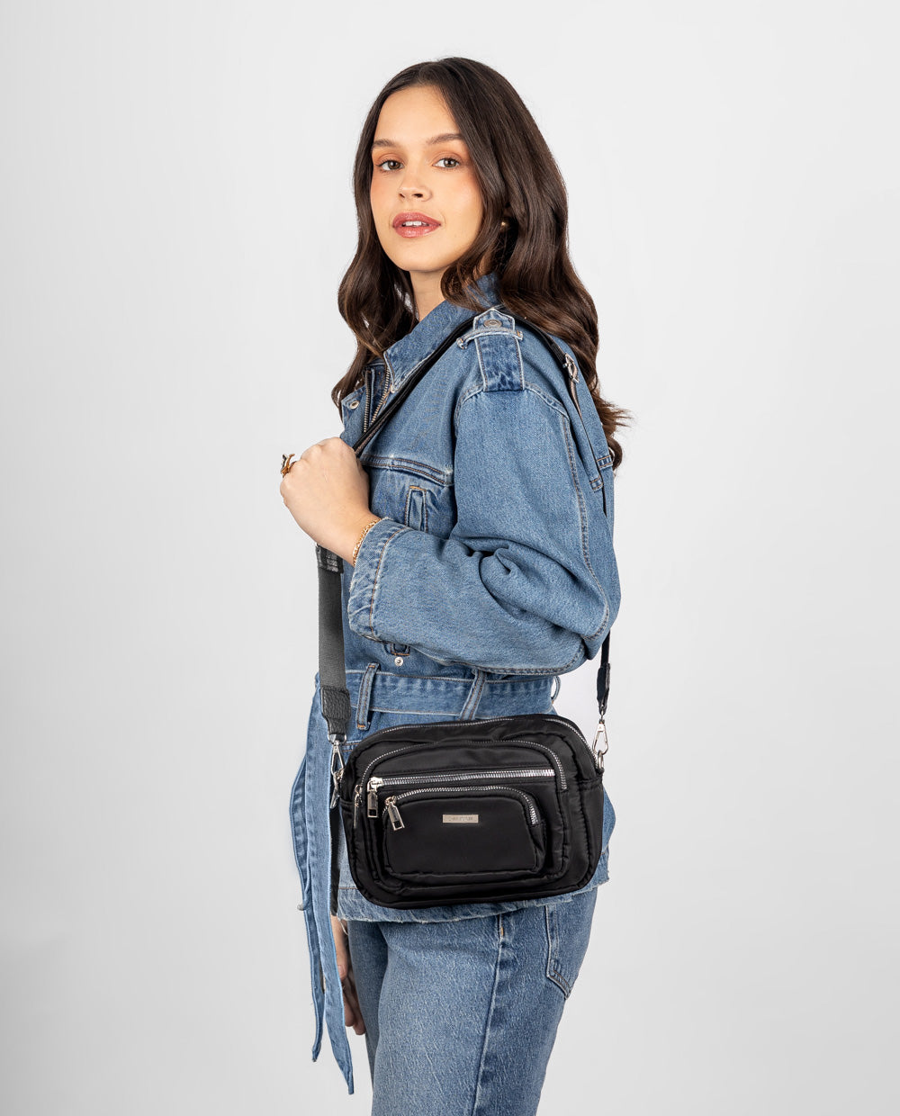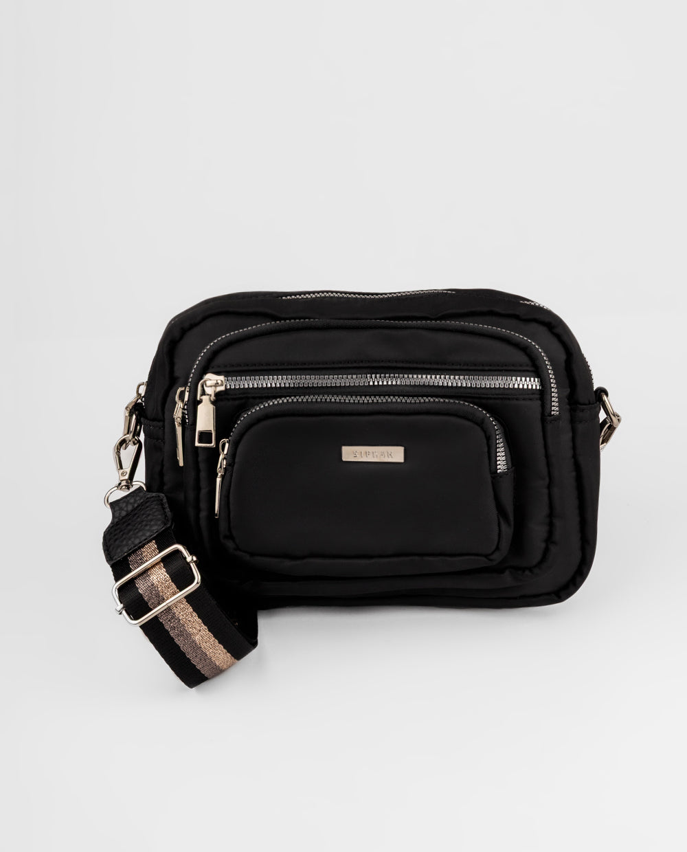 El equilibrio perfecto entre comodidad y estilo. Esta cartera negra es tu aliada ideal para días activos. Con múltiples compartimentos y una correa tejida multicolor ajustable, te acompaña con actitud en cada paso. Úsala como crossbody y brilla con tu propio ritmo.