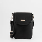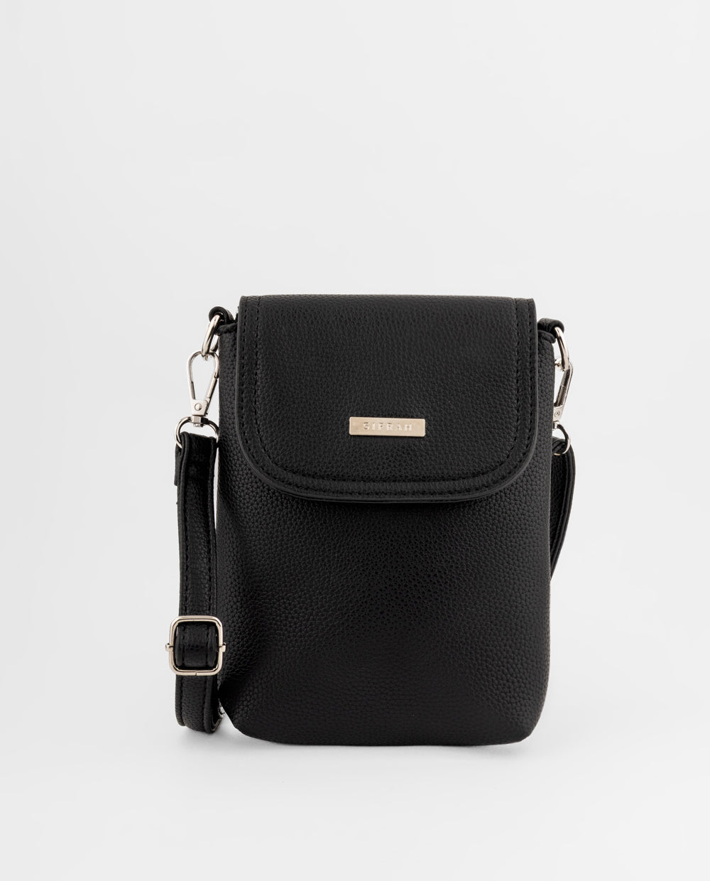 Cartera crossbody negra de tamaño compacto con tapa frontal, textura tipo cuero. Incluye correa ajustable y desmontable, para llevarla cruzada.