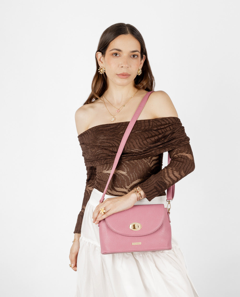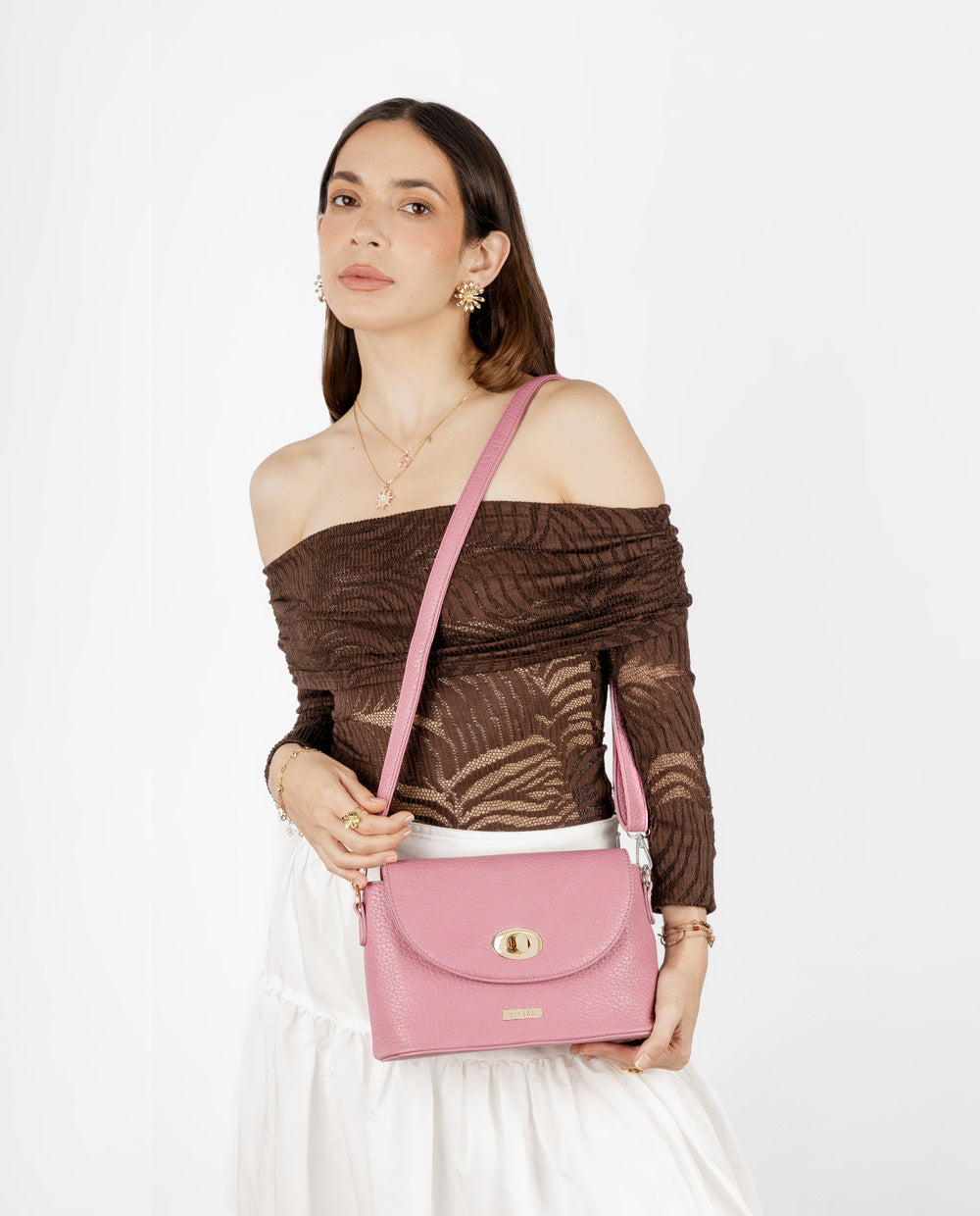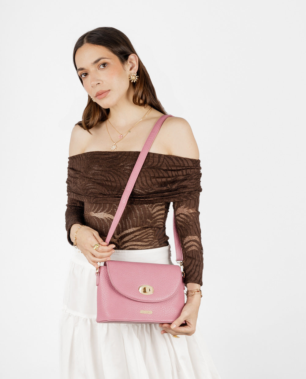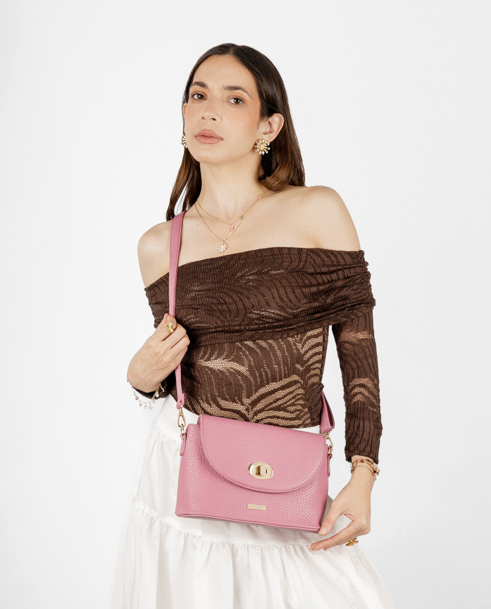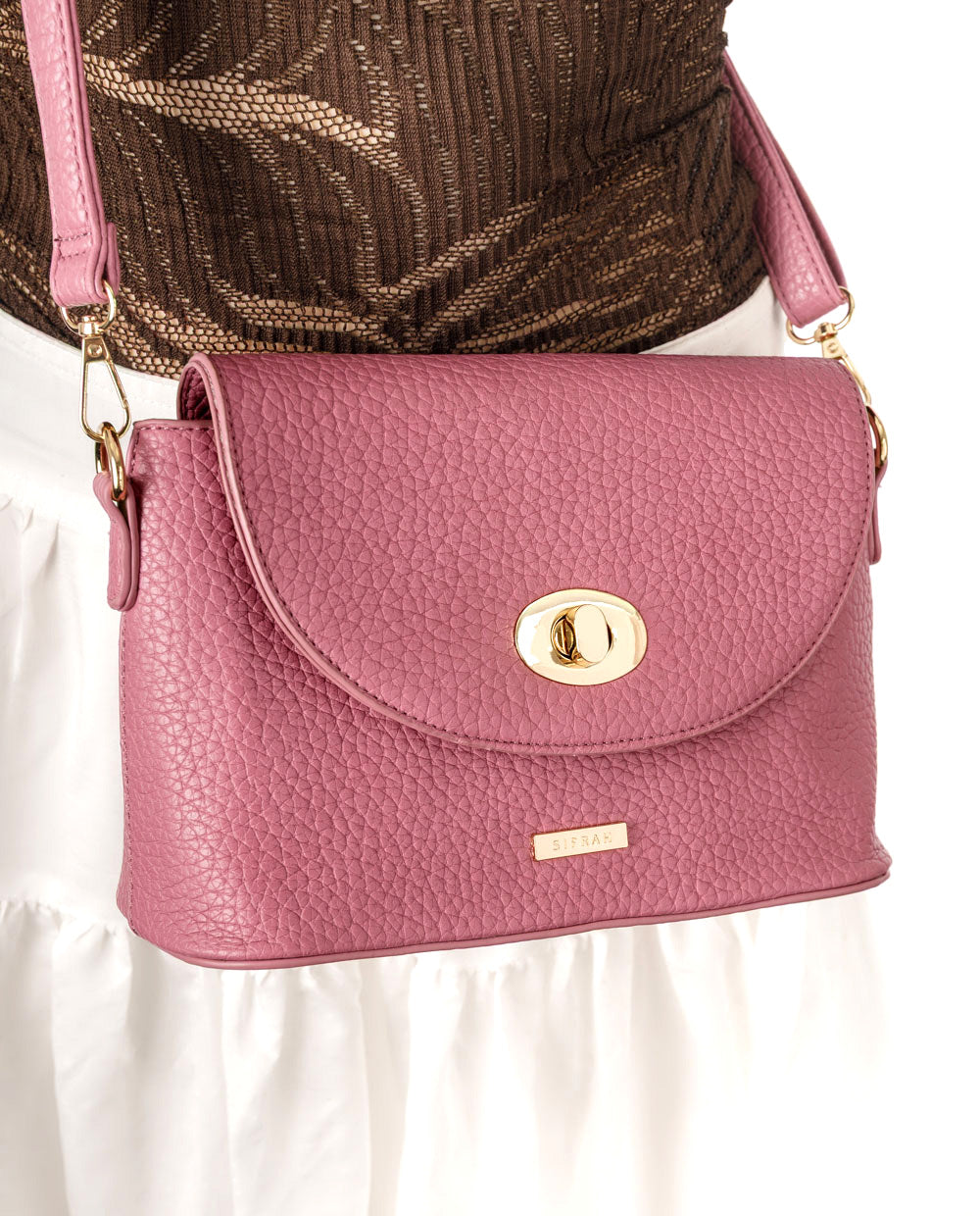 Una cartera que combina estilo clásico con un toque moderno. Su diseño estructurado en tono rosado y acabado tipo cuero graneado la hace ideal para elevar cualquier outfit. Cuenta con una solapa de cierre giratorio en dorado y un bolsillo externo con cierre para mayor practicidad. Su correa ajustable permite llevarla cómodamente al hombro o en estilo crossbody, adaptándose a tu rutina diaria con elegancia y funcionalidad. Ideal para salidas, oficina o eventos casual chic