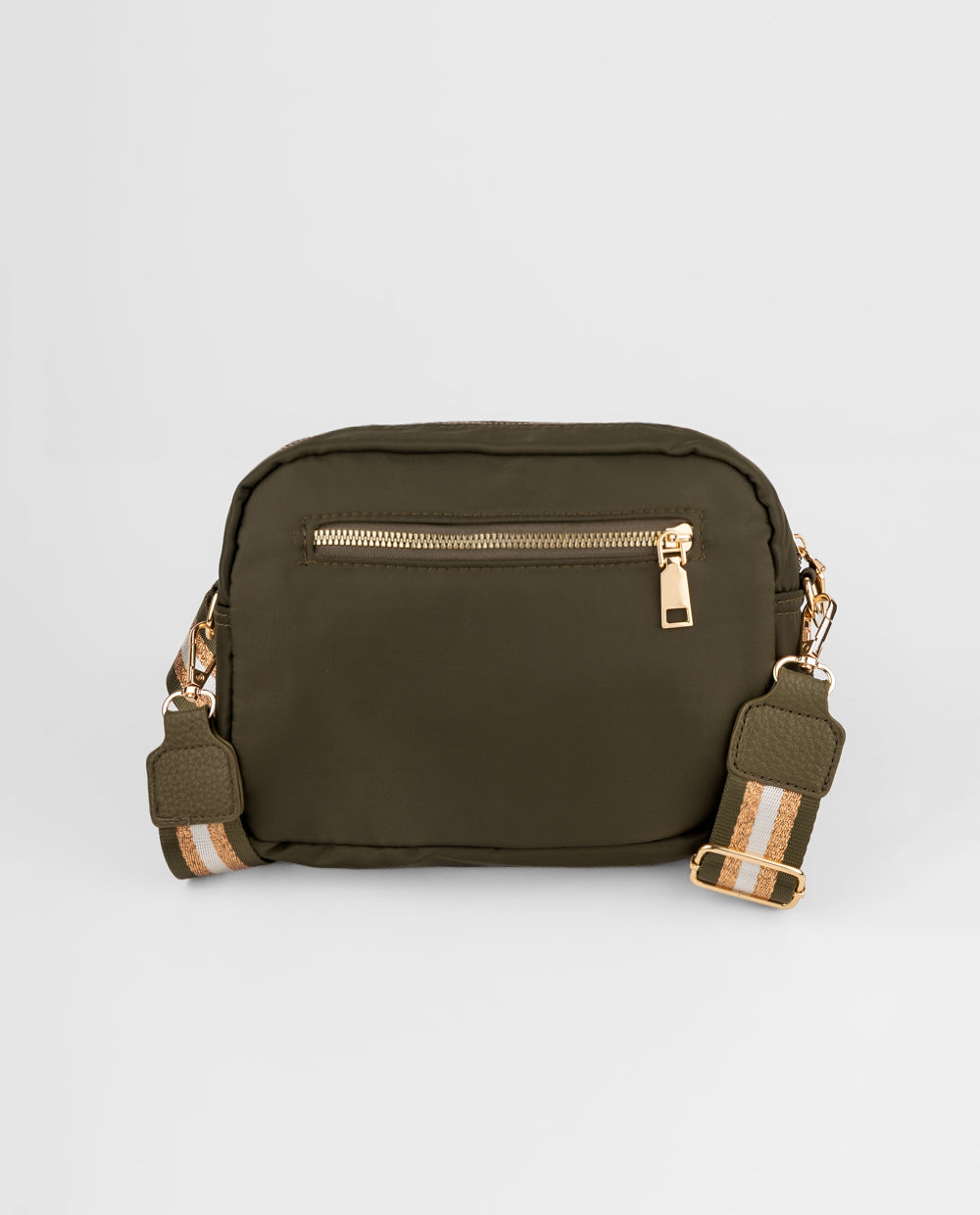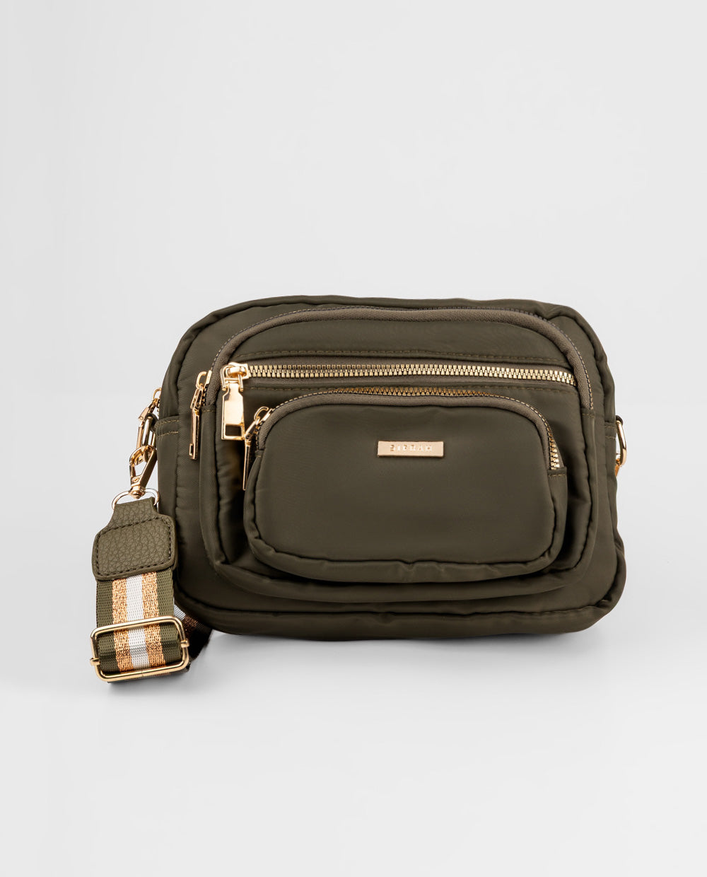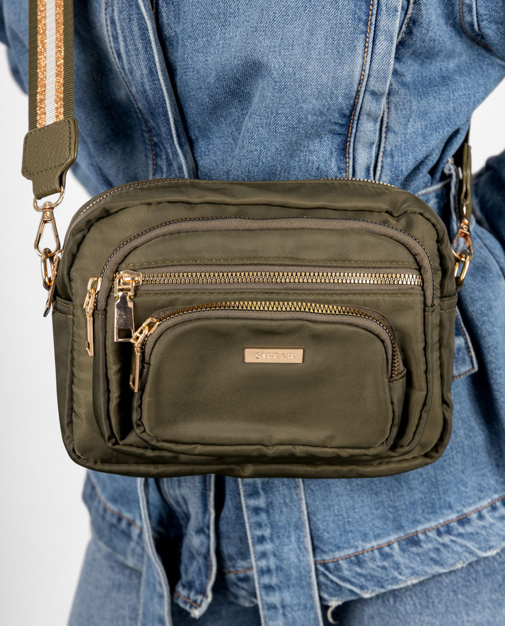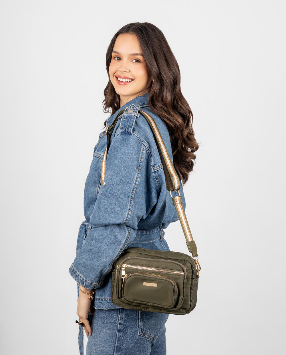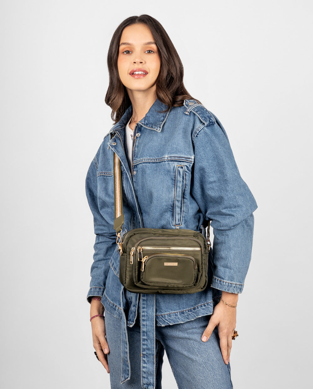 El equilibrio perfecto entre comodidad y estilo Esta cartera verde militar es tu aliada ideal para días activos. Con múltiples compartimentos y una correa tejida multicolor ajustable, te acompaña con actitud en cada paso. Úsala como crossbody y brilla con tu propio ritmo.
