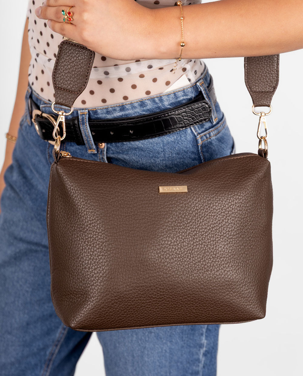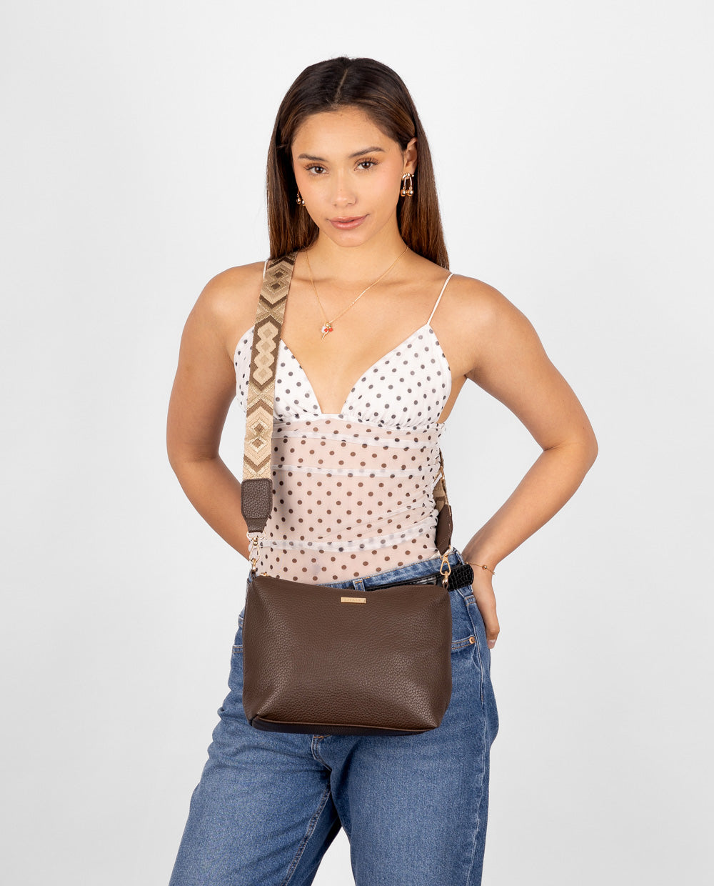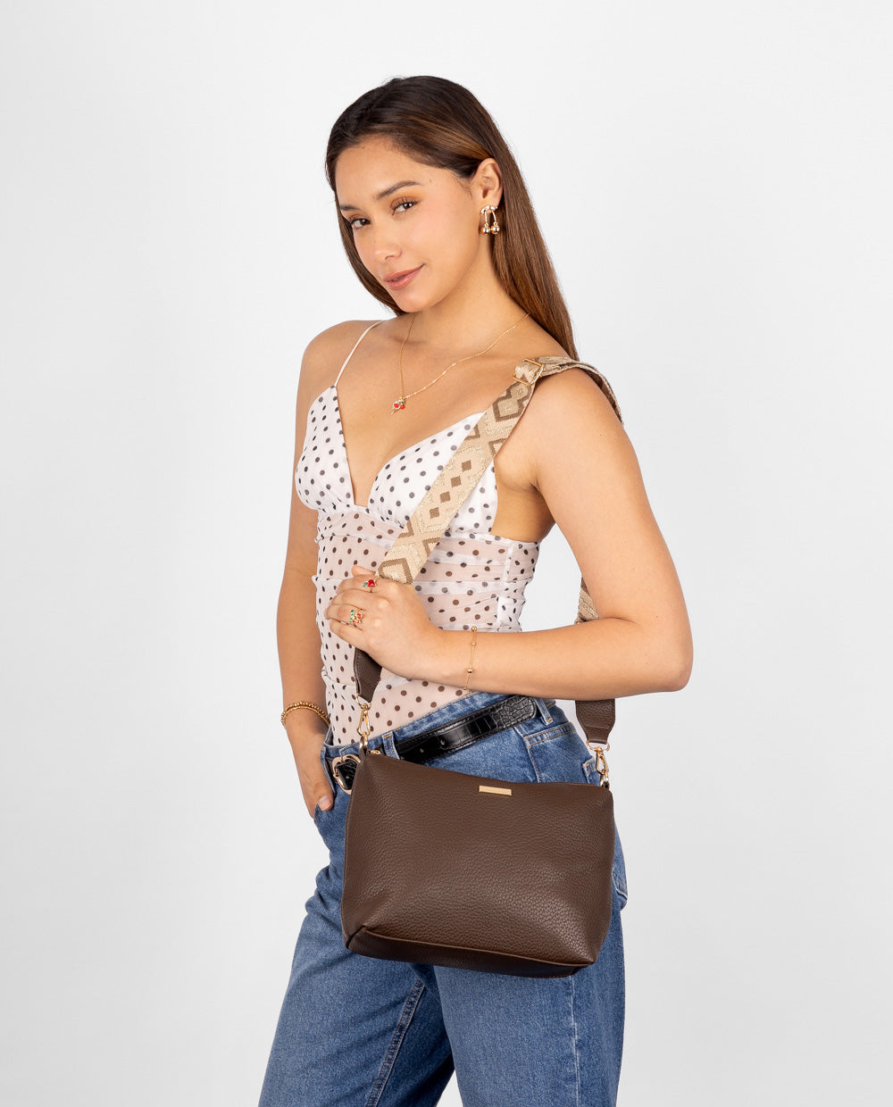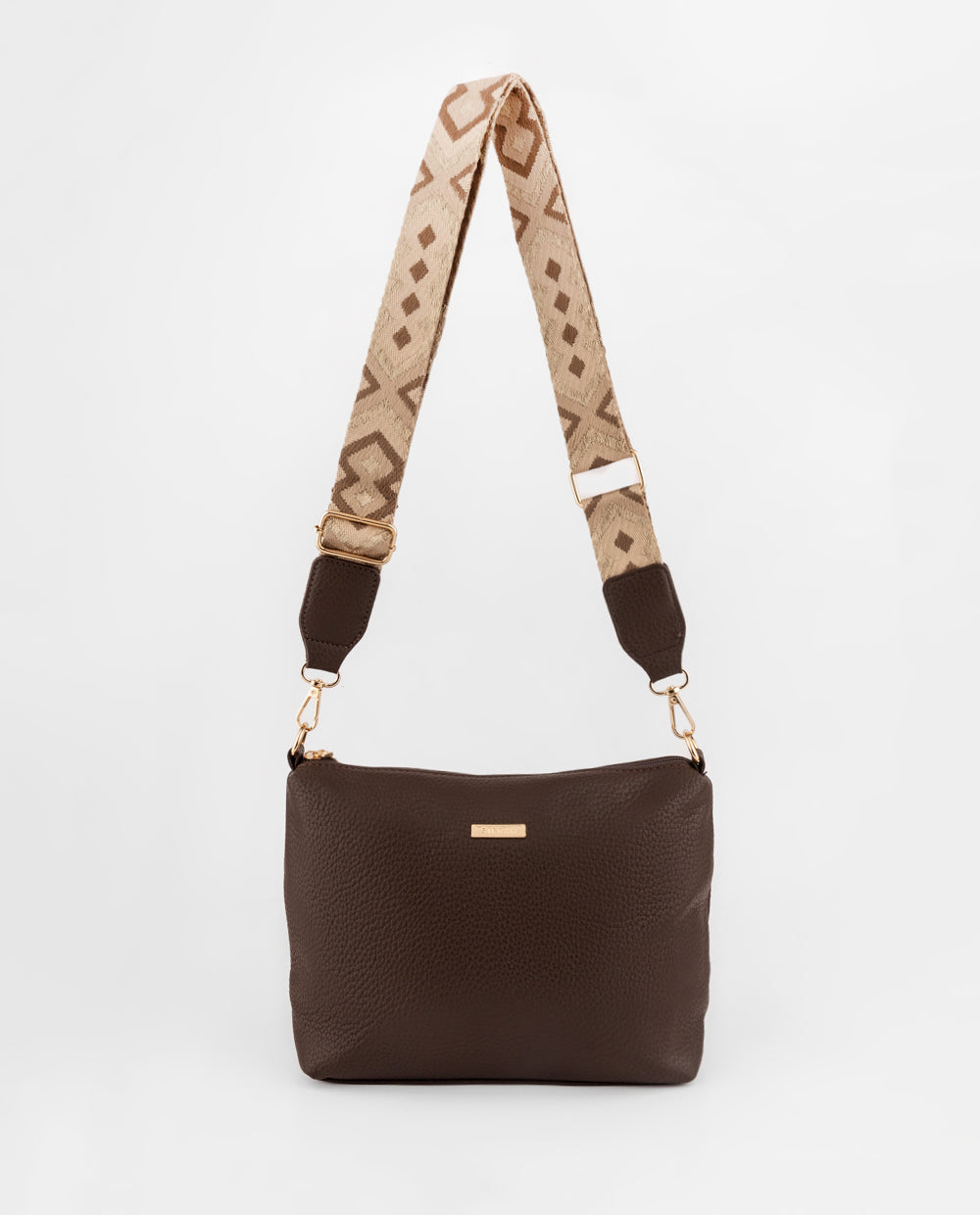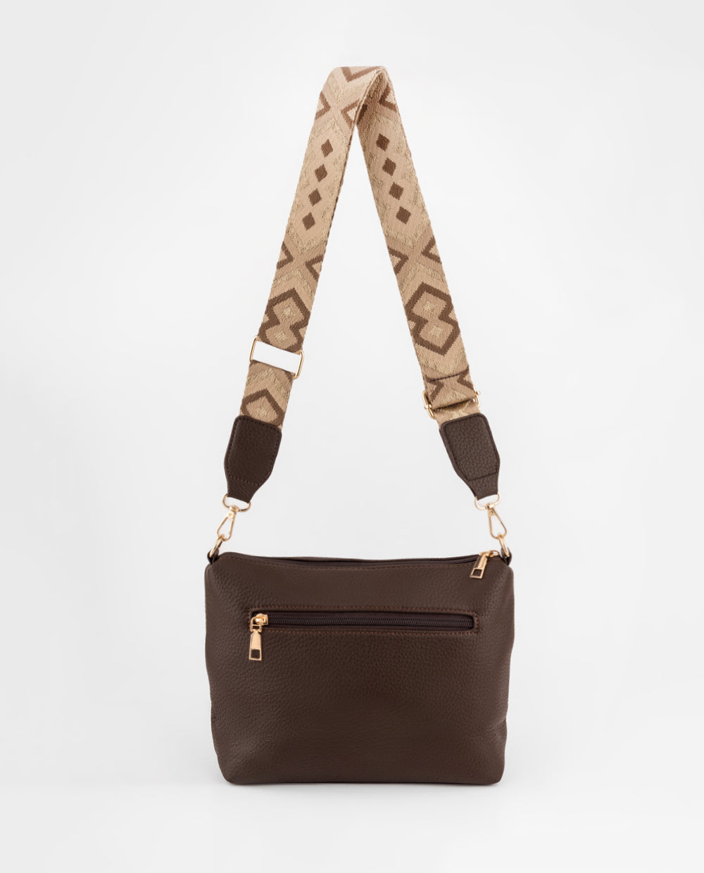 Cartera marrón en material PU con acabado graneado y herrajes dorados. Cuenta con bolsillo posterior con cierre y correa ancha ajustable con diseño tribal en tonos beige y marrón.