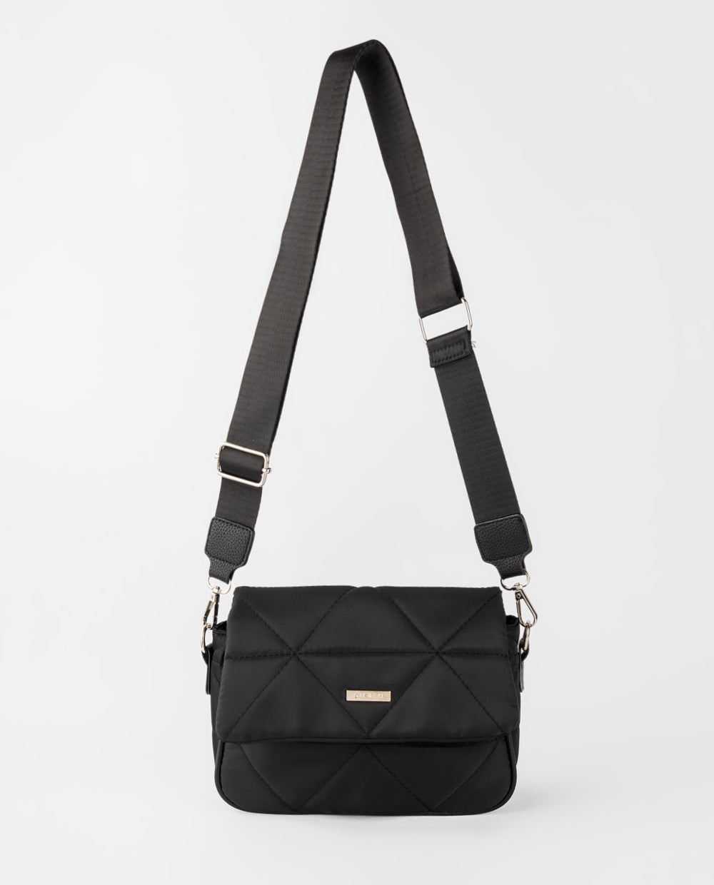 Cartera negra acolchada en patrones geométricos y tapa frontal con cierre seguro. Incluye correa ancha ajustable y desmontable que aporta comodidad para uso diario.