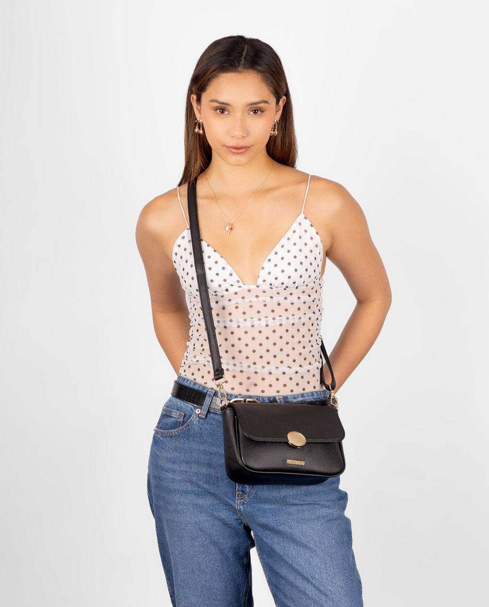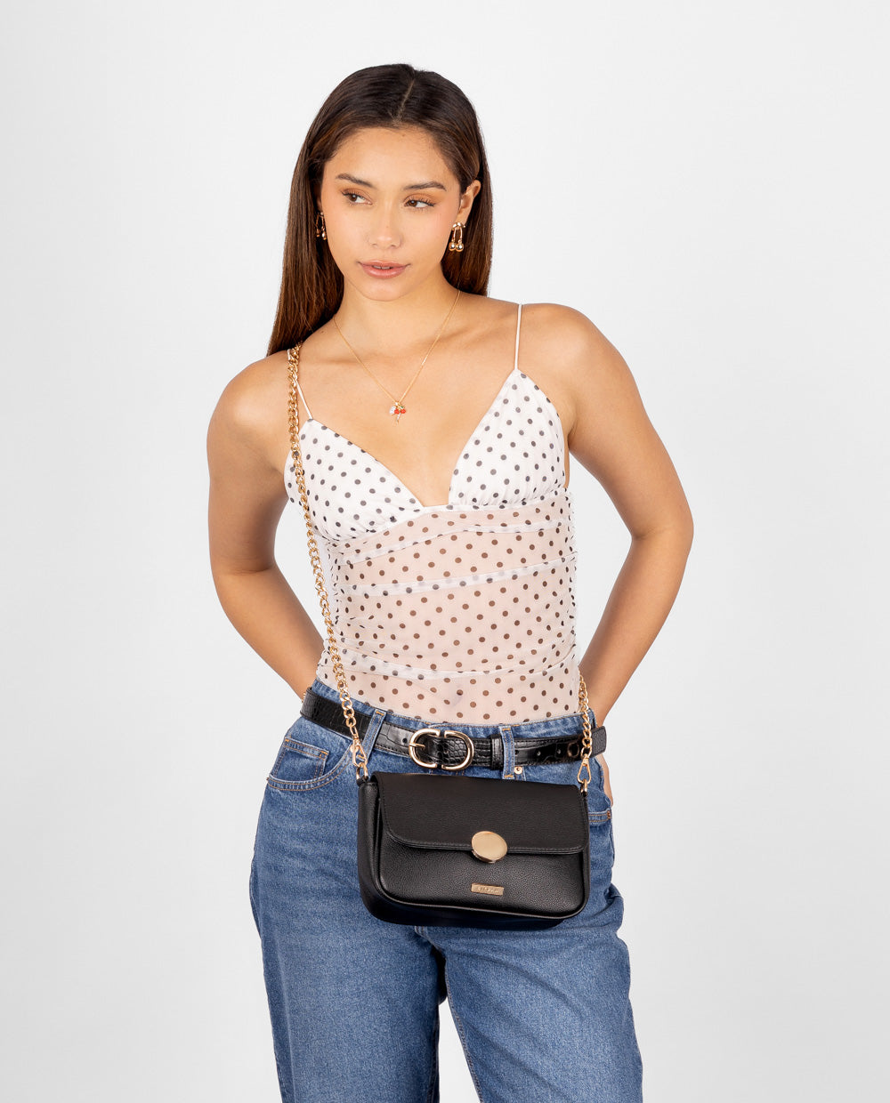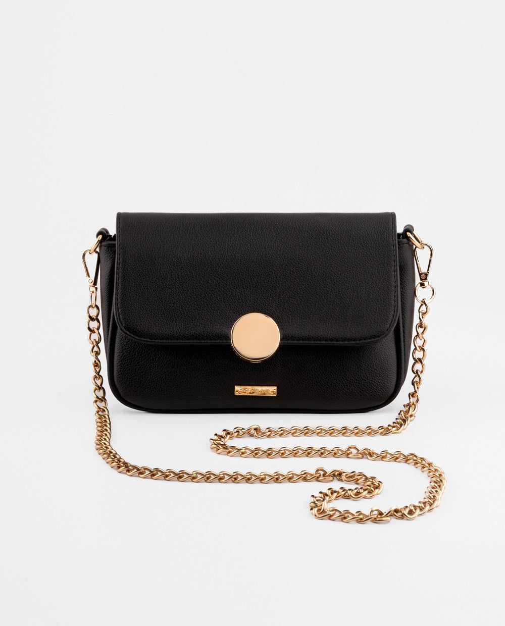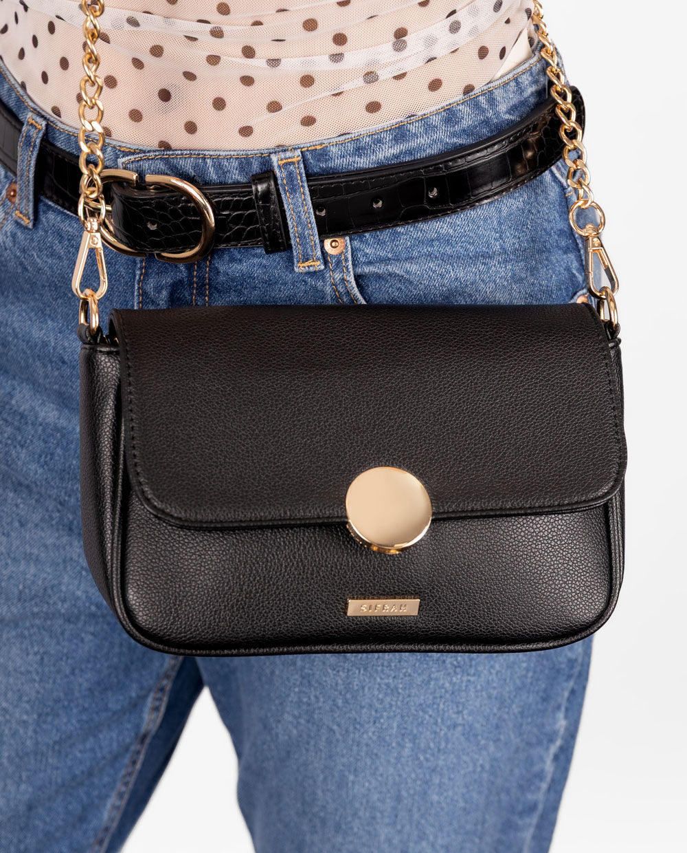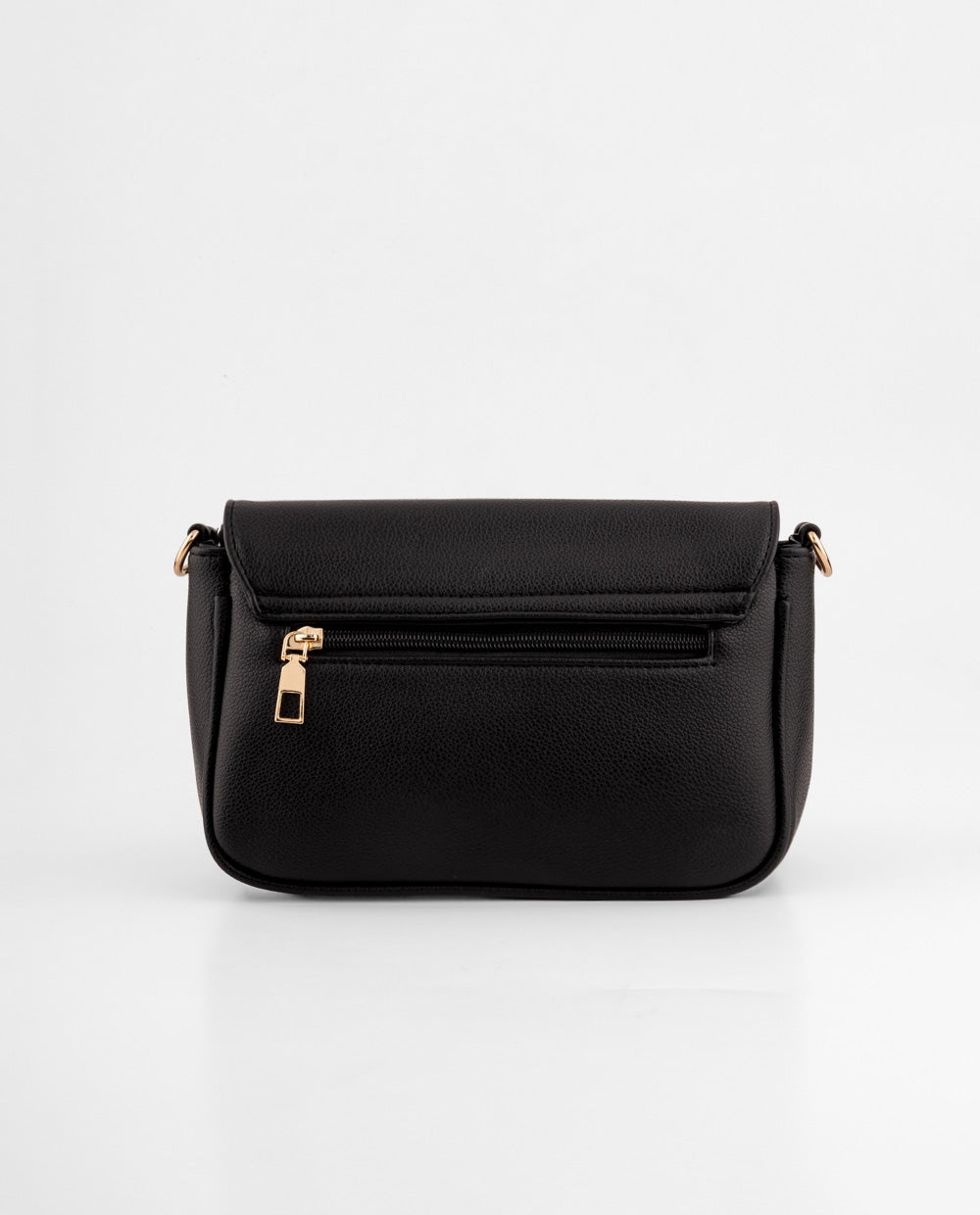 Cartera negra en material PU con textura graneada y cierre imantado. Cuenta con cierre superior, bolsillo posterior con cierre y con dos correas intercambiables: una cadena dorada para un look elegante y una correa ajustable para mayor comodidad.