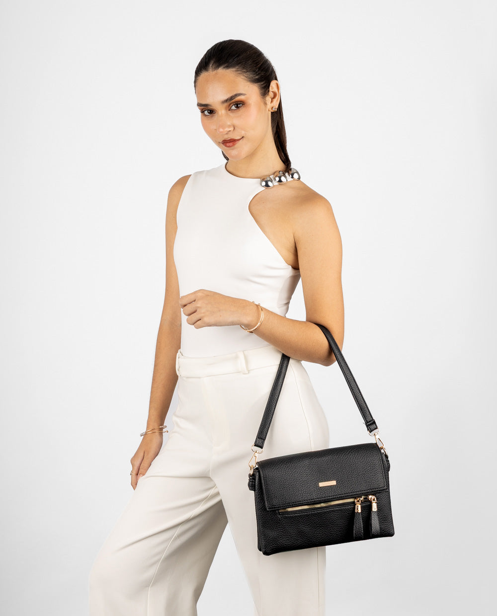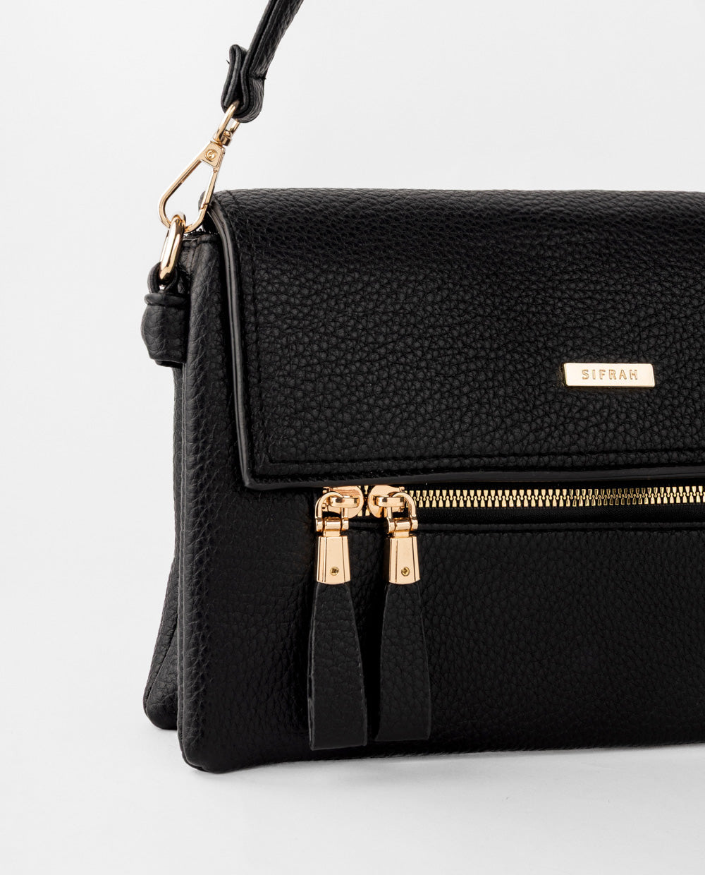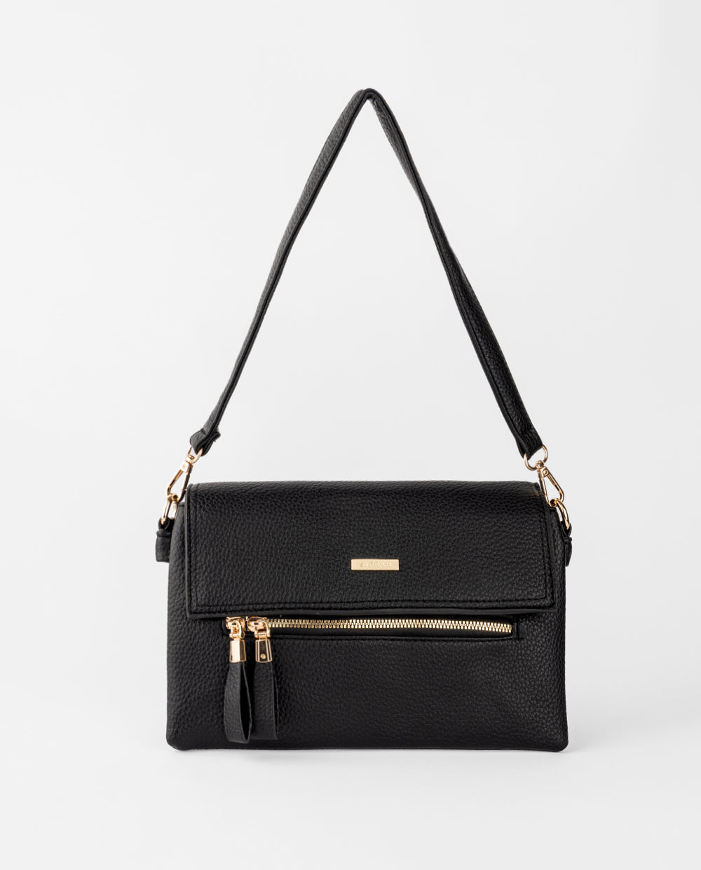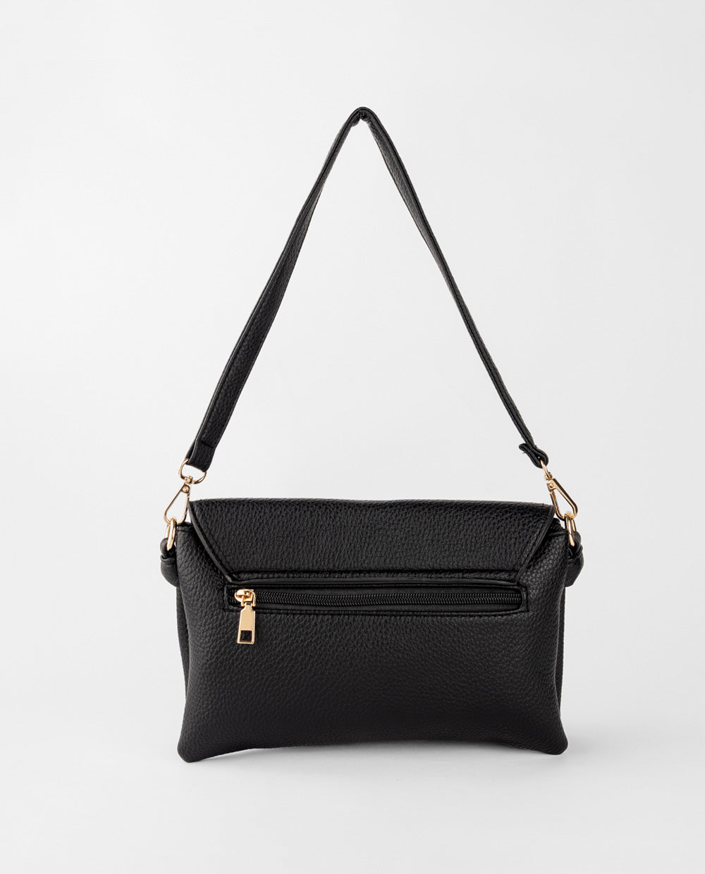 Cartera negra de PU, tapa plegable y doble cierre frontal. Incluye correa ajustable y desmontable, para llevarla cruzada.