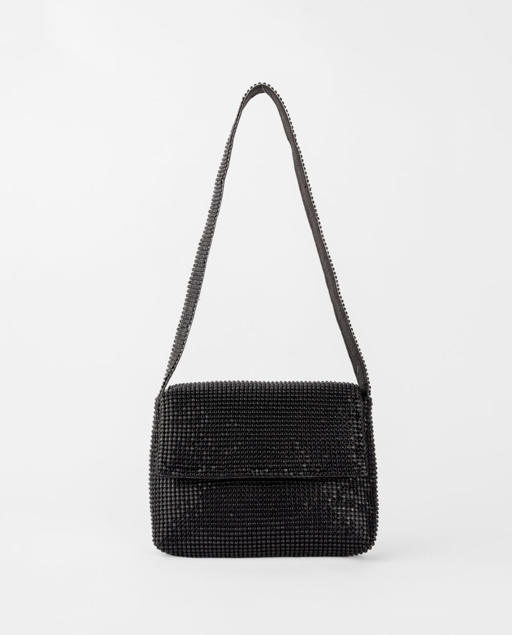 Cartera negra con exterior cubierto de aplicaciones tipo strass que aportan textura y brillo. Incluye tapa frontal con cierre seguro y correa fija al hombro.