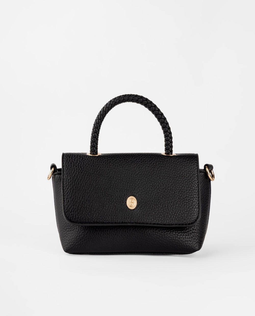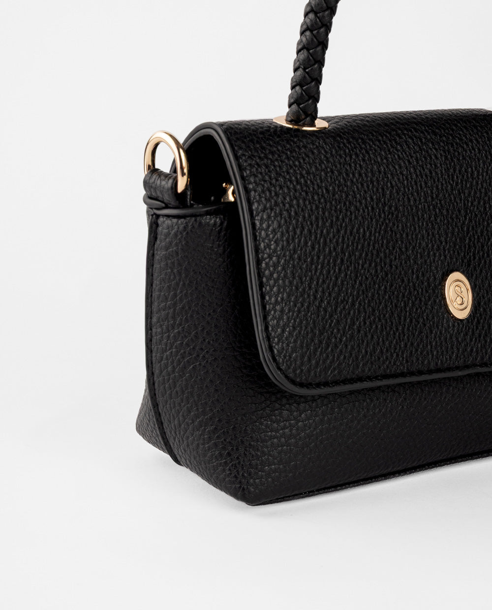 Cartera negra de textura suave con tapa frontal y asa trenzada. Incluye correa ajustable y desmontable, para llevarla cruzada.
