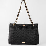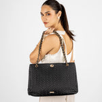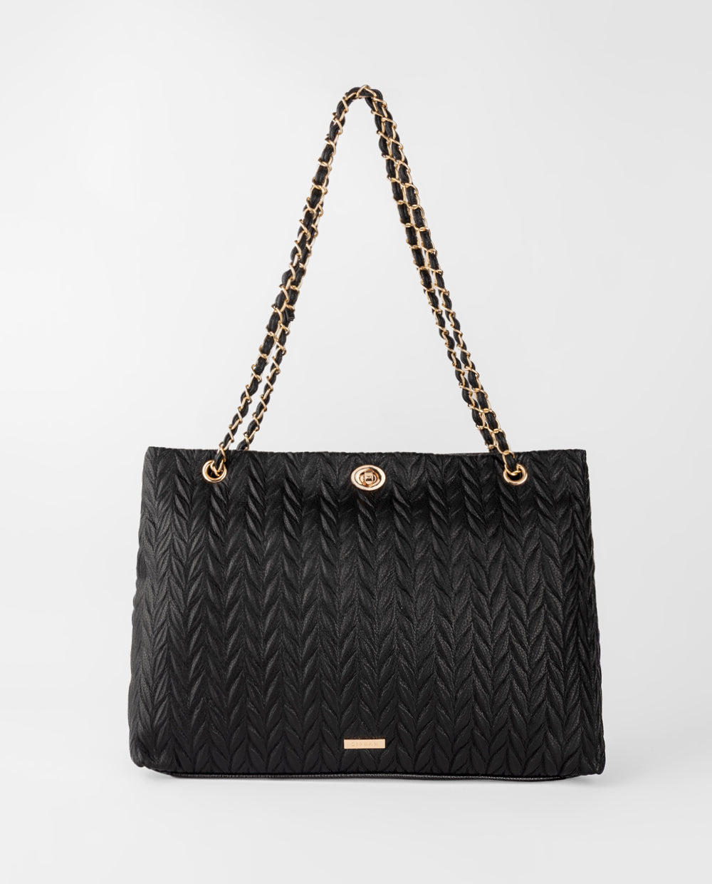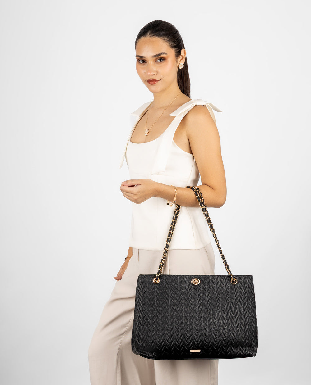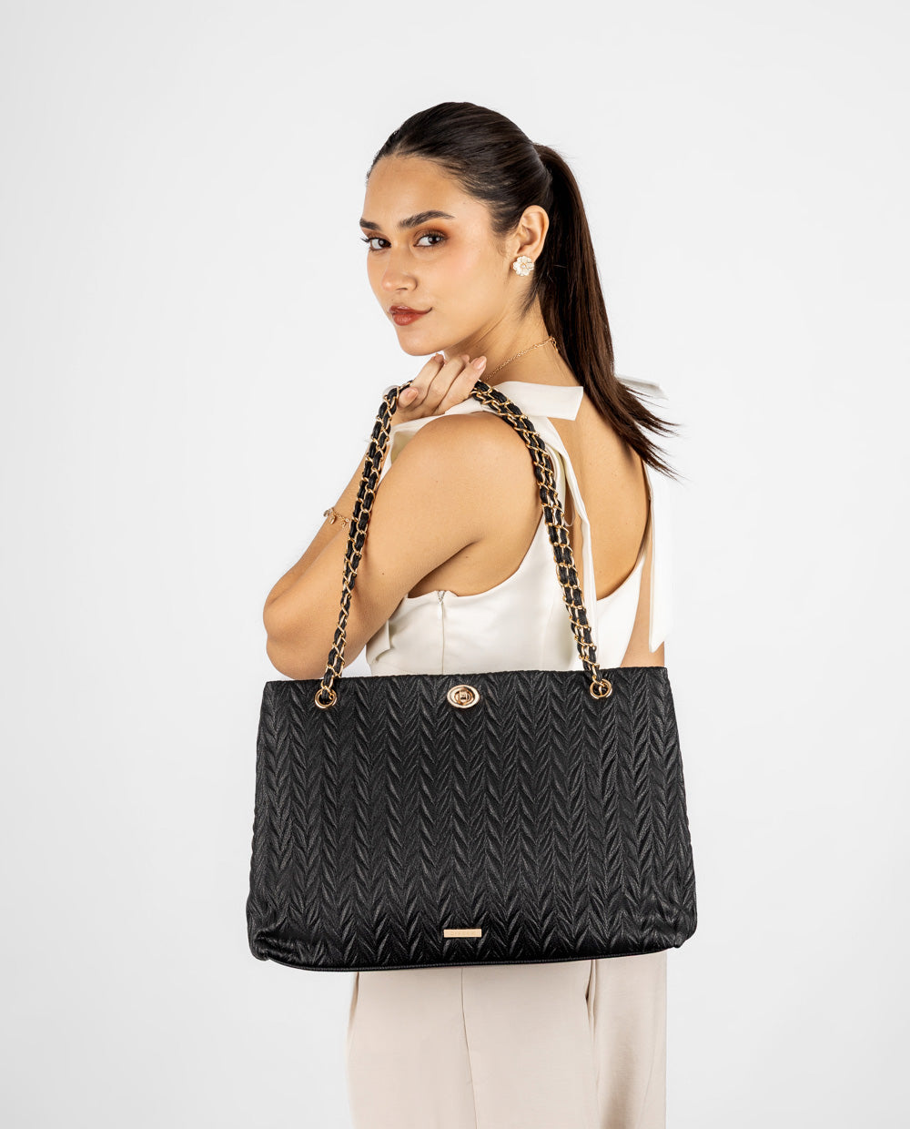 Cartera negra en material PU con patrón de espiga y estructura amplia tipo shopping bag. Incorpora asas dobles con cadena entrelazada y broche metálico frontal para un cierre práctico.