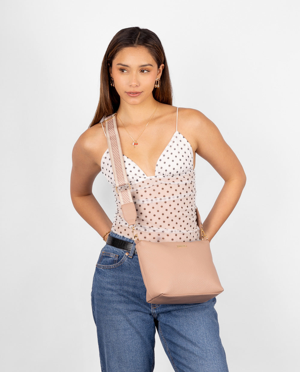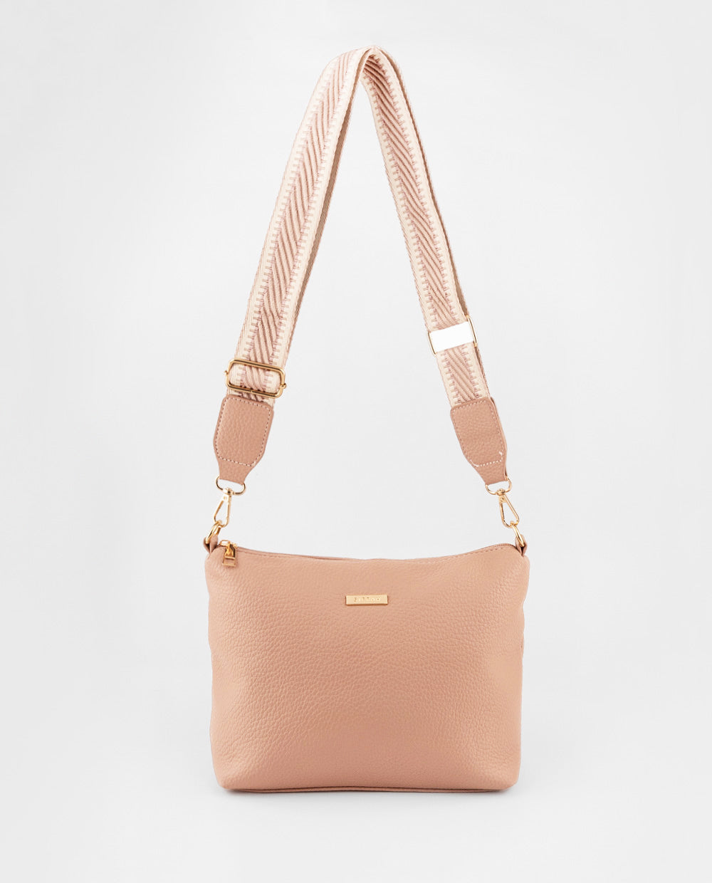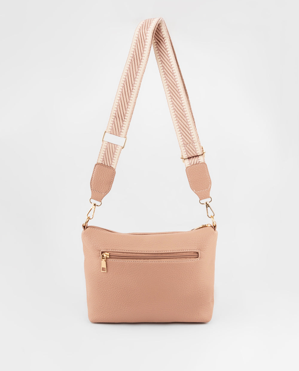 Cartera nude en material PU con textura graneada y herrajes dorados. Incluye correa ancha tejida ajustable en tono nude con diseño en espiga y bolsillo posterior con cierre.