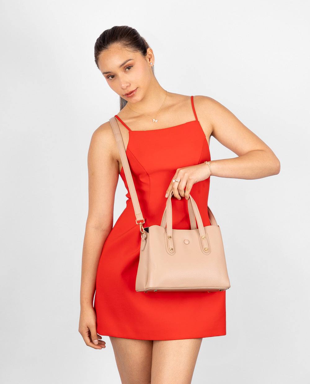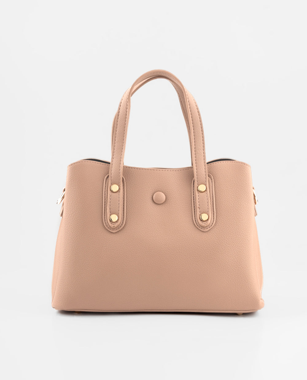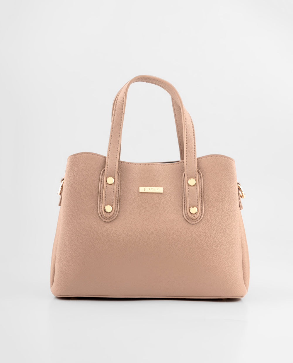 Cartera nude en material PU con textura graneada y herrajes dorados. Presenta doble asa reforzada y correa ajustable desmontable para mayor versatilidad. Su diseño estructurado y tono neutro la convierten en un básico elegante para el día o la noche.
