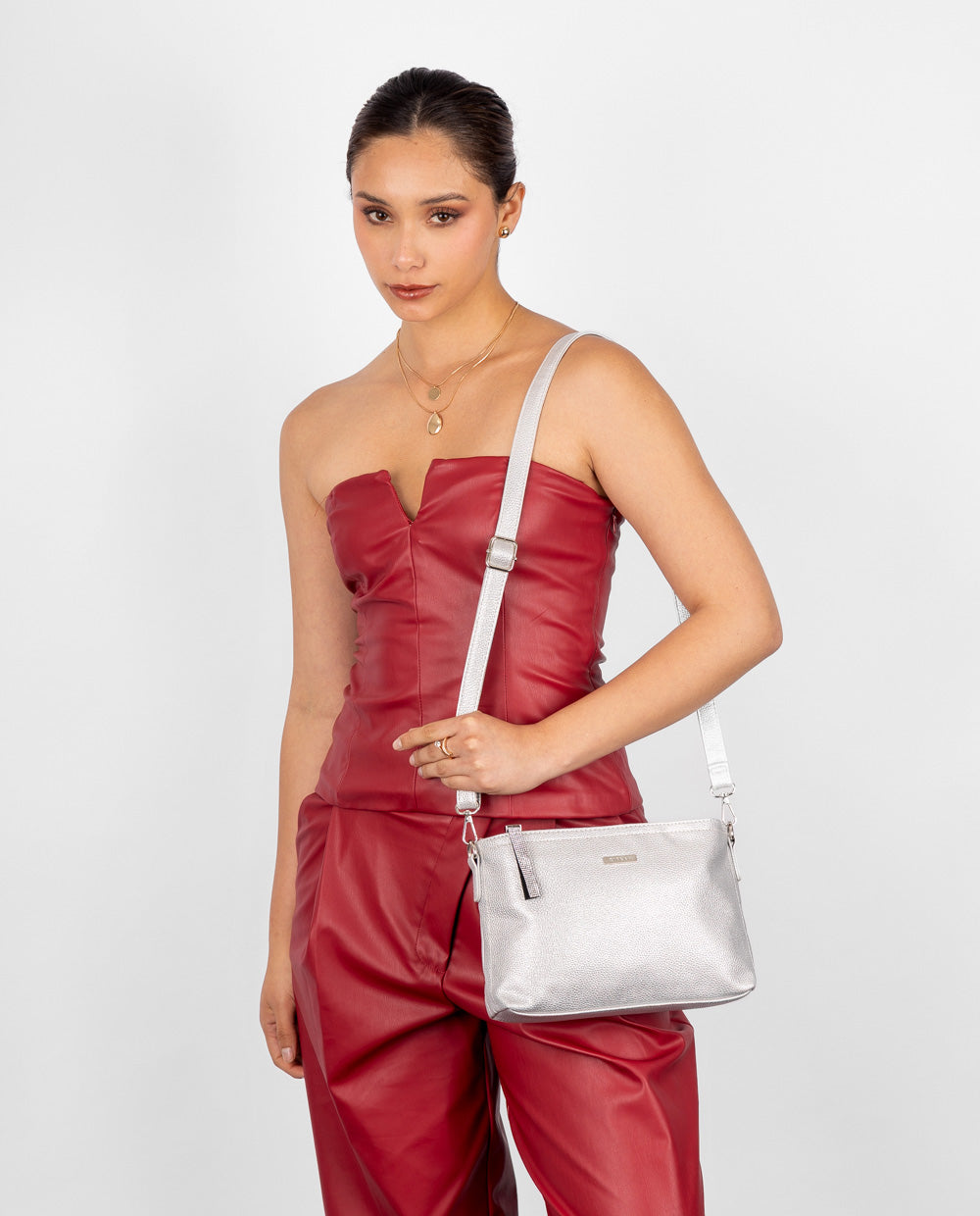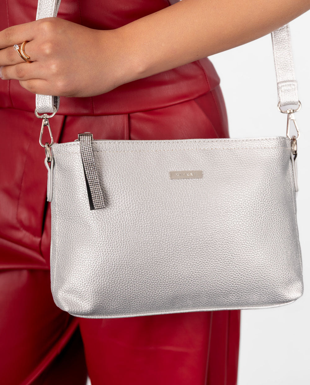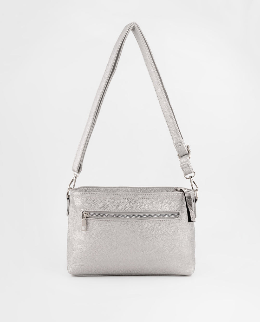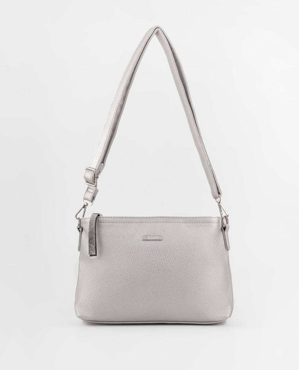 Cartera plateada crossbody en material PU color plateado con acabado graneado. Cuenta con correa ajustable, ideal para usar cruzada o al hombro, cierre superior y bolsillo posterior con cierre.