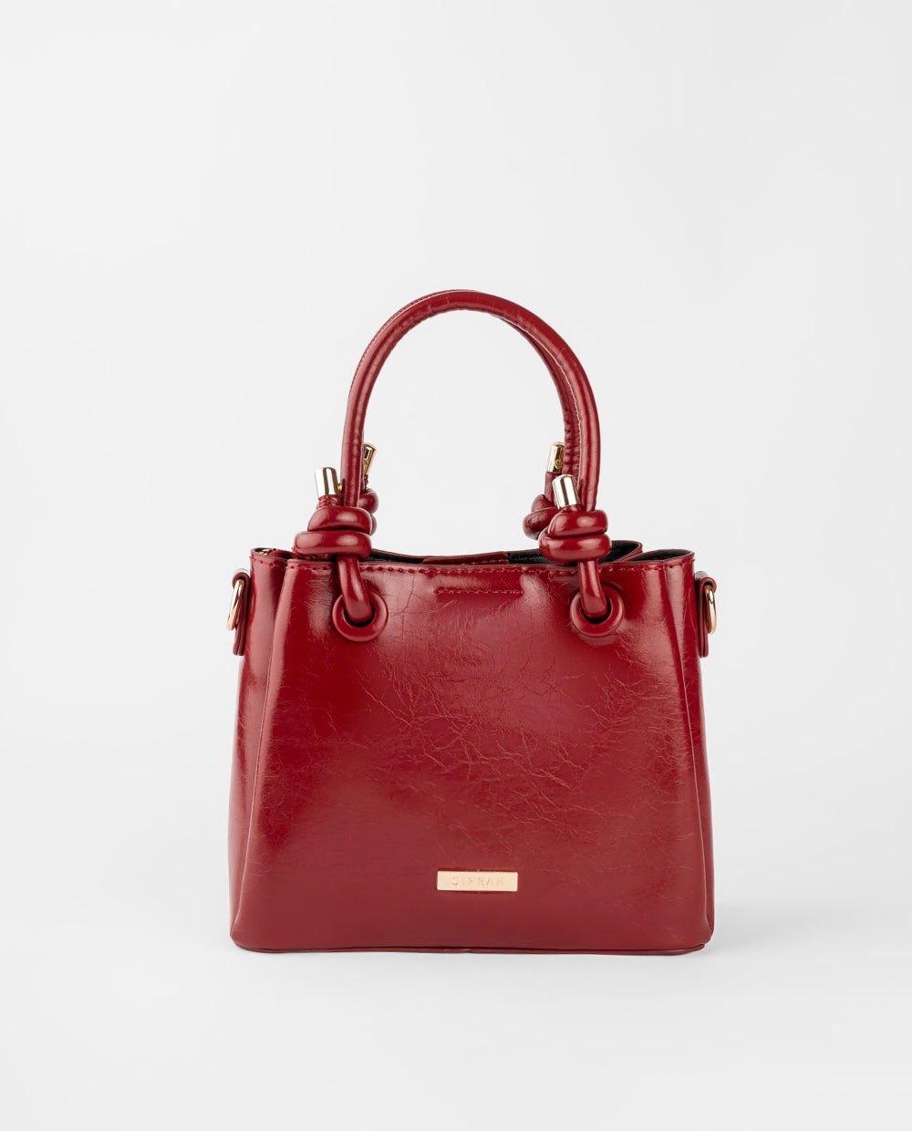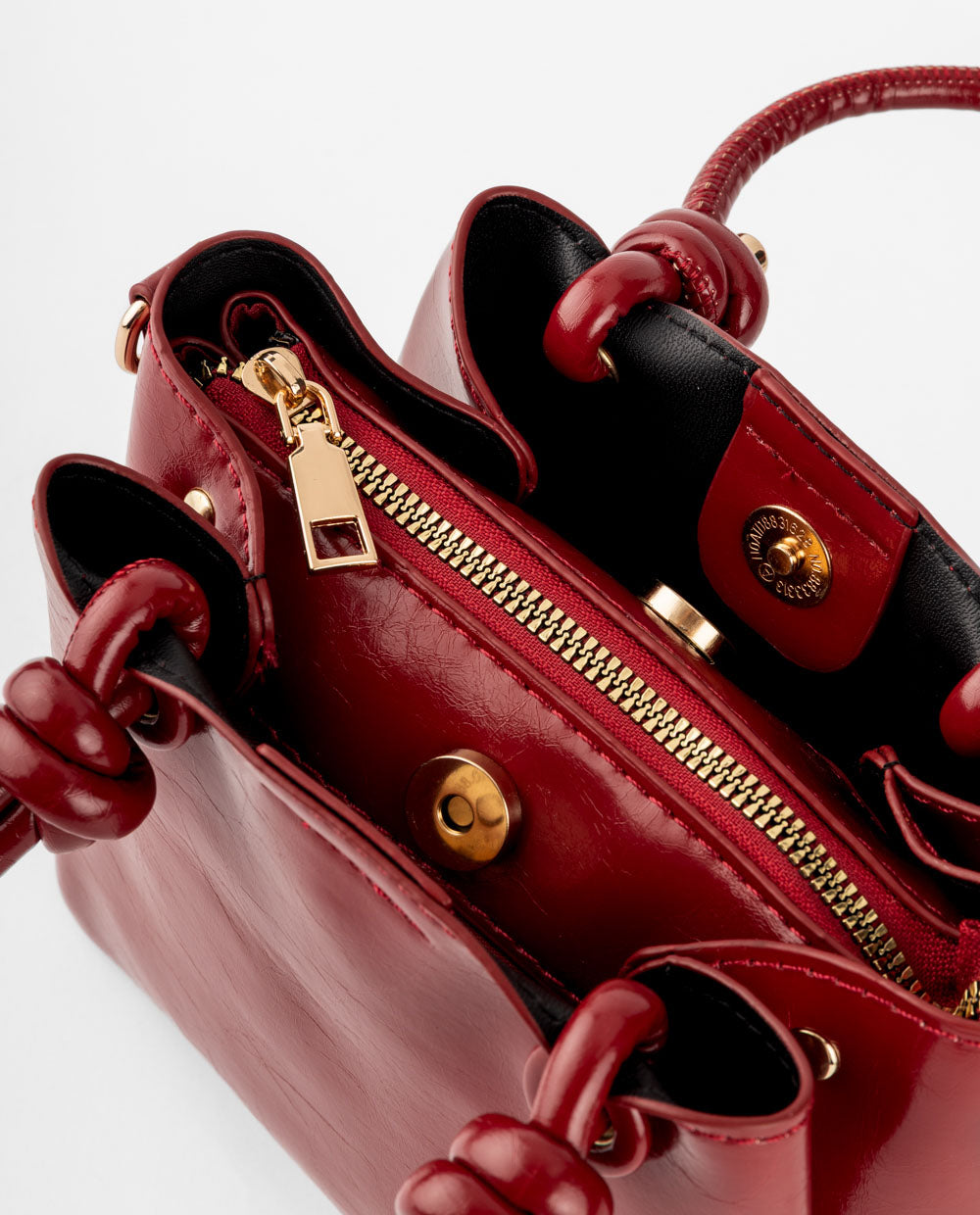 Cartera roja de acabado brillante con asas de nudo y compartimentos con cierre metálico, ideal para un look elegante. Incluye correa ajustable y desmontable, para llevarla cruzada.