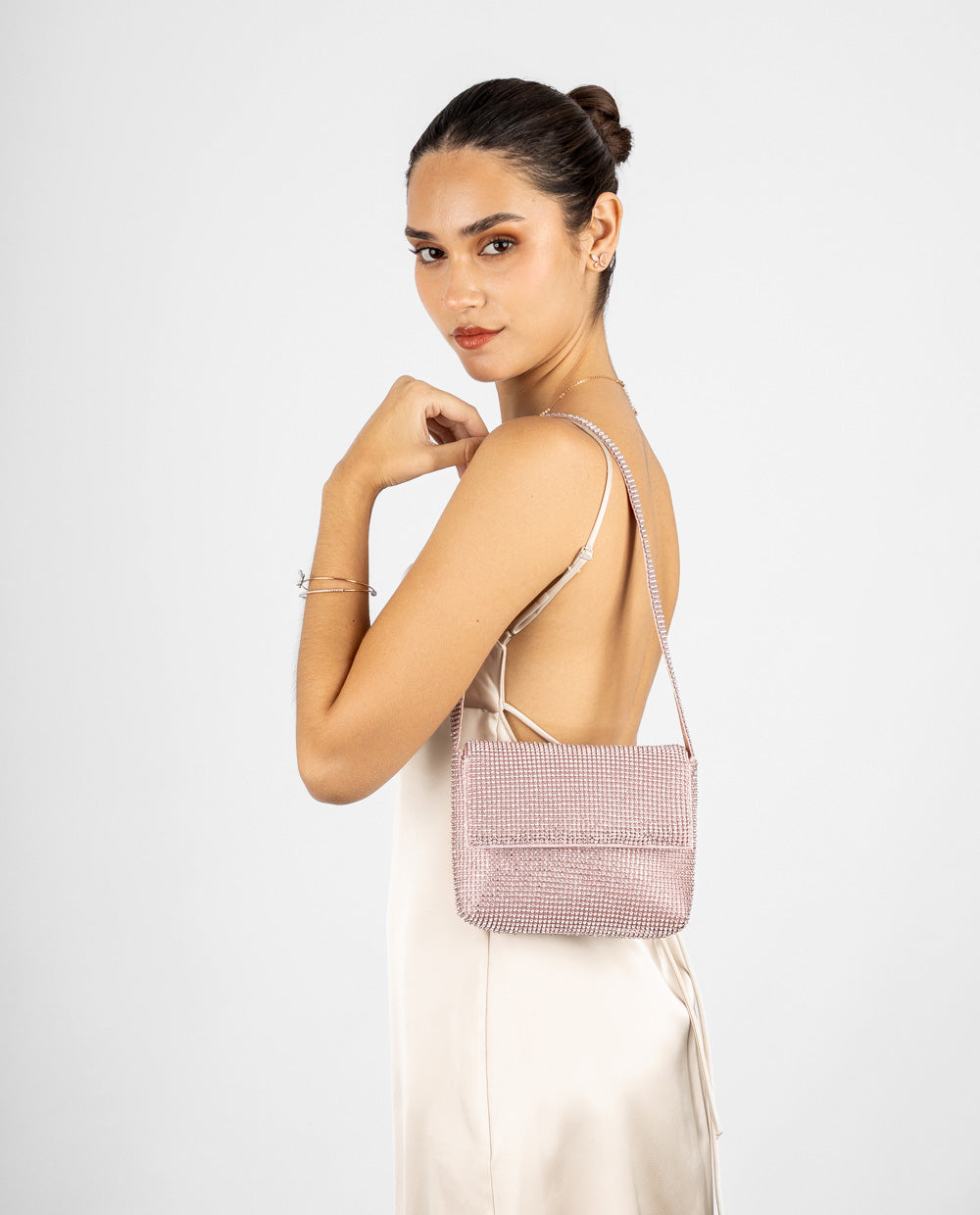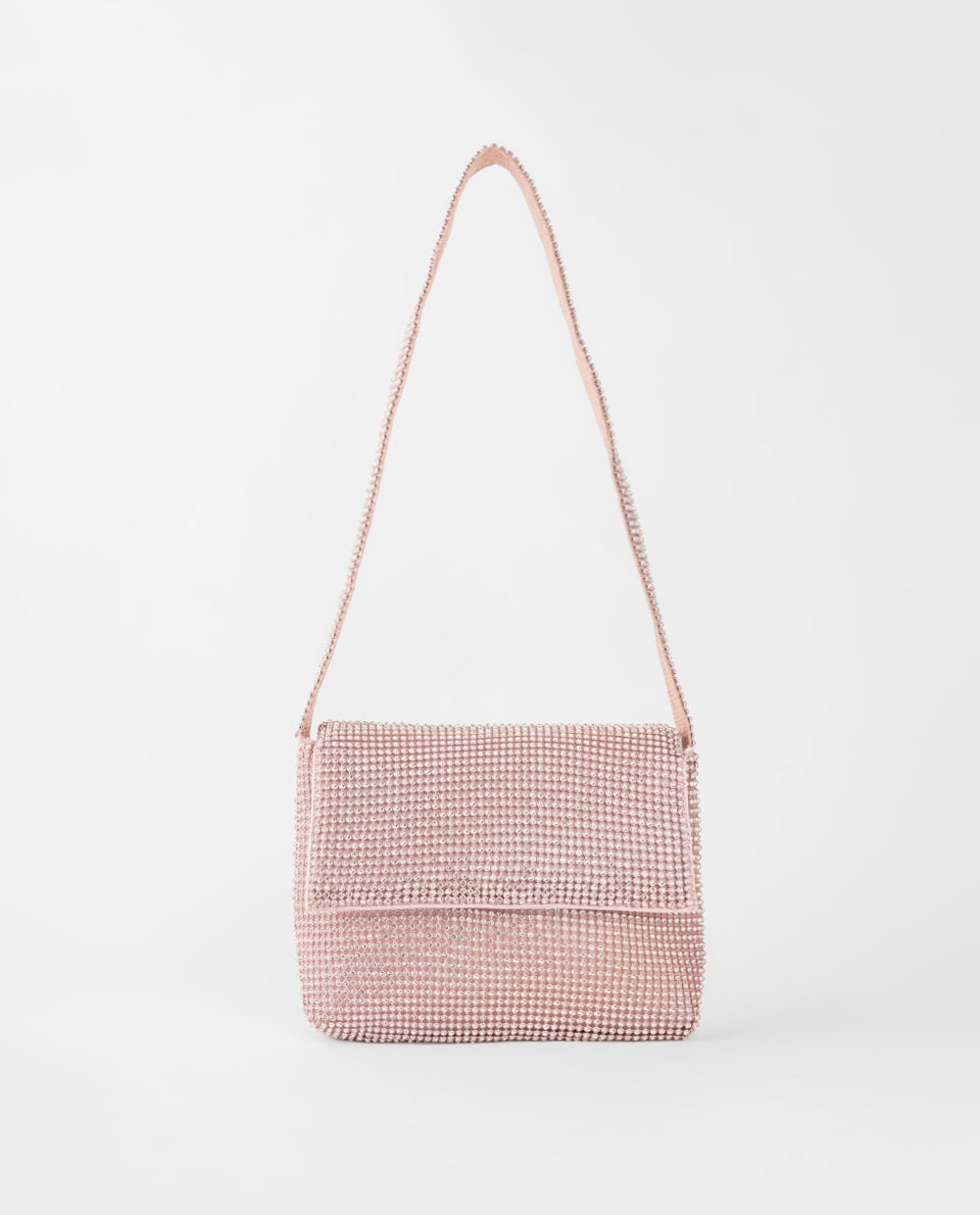 Cartera rosada con exterior cubierto de aplicaciones tipo strass que aportan textura y brillo. Incluye tapa frontal con cierre seguro y correa fija al hombro.