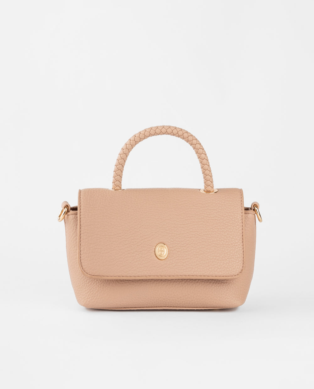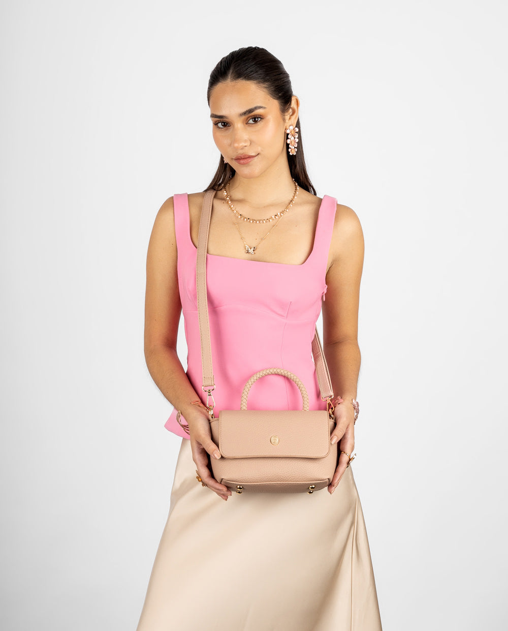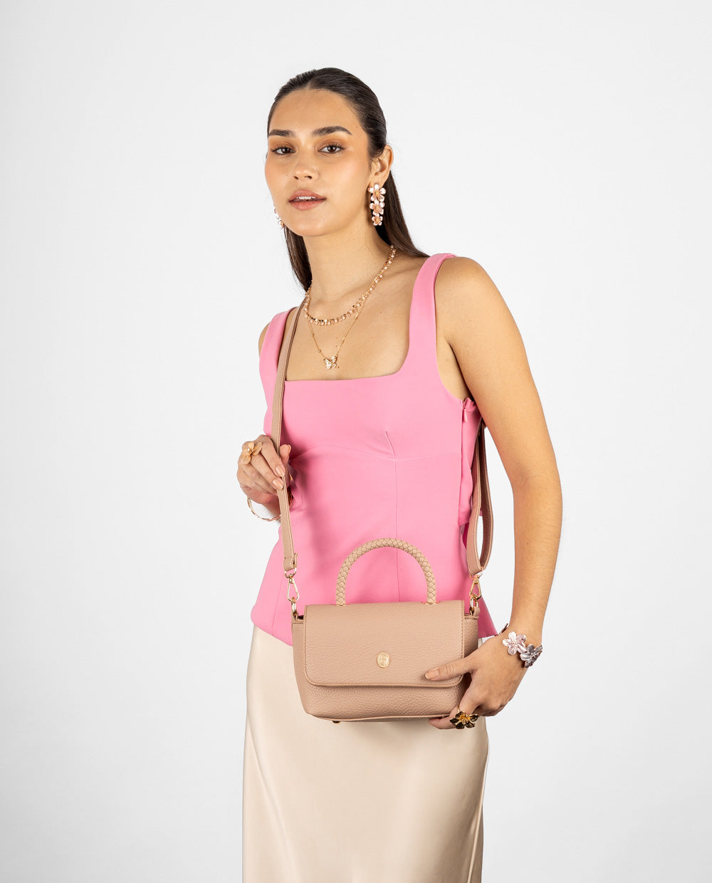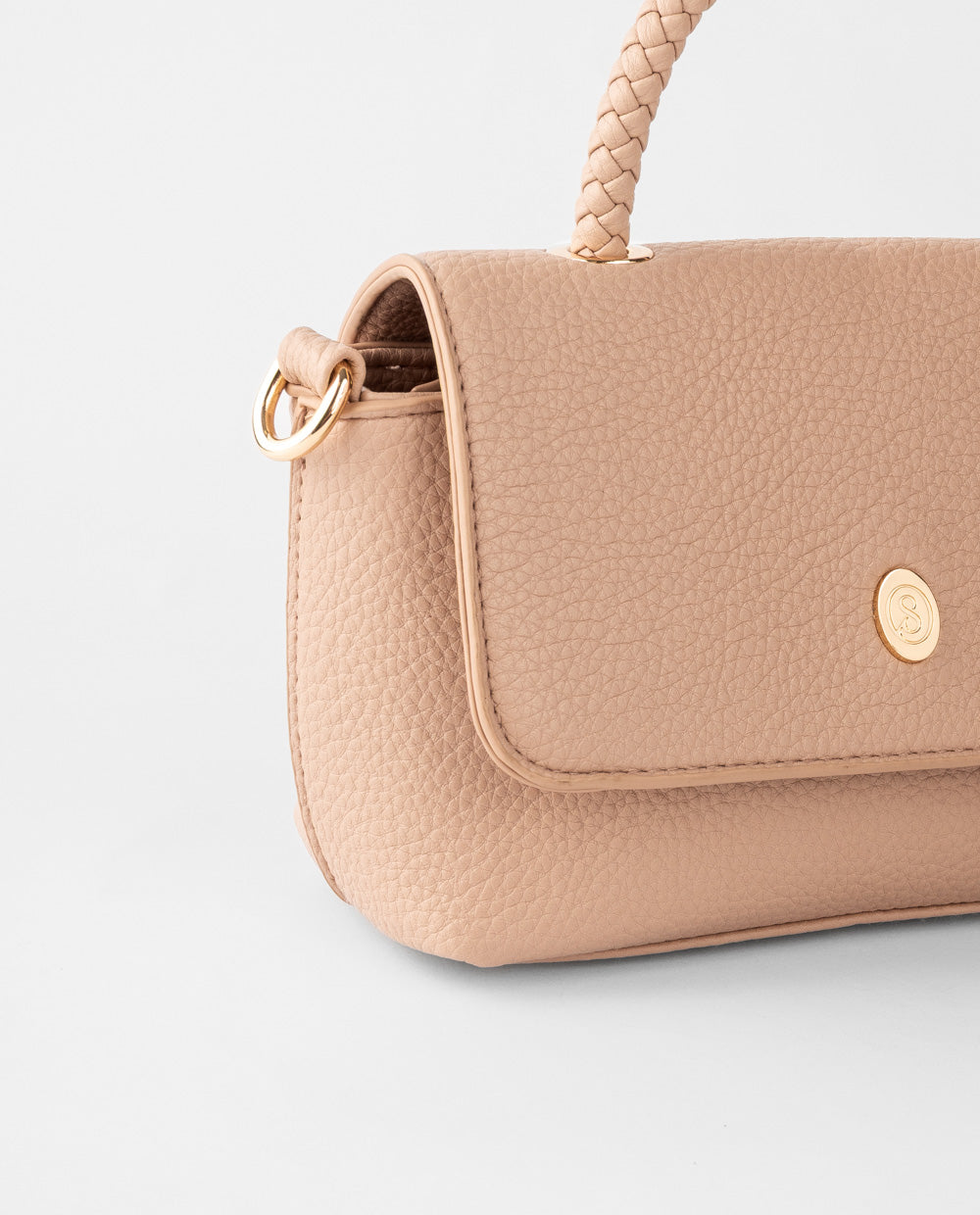Cartera rosada de textura suave con tapa frontal y asa trenzada. Incluye correa ajustable y desmontable, para llevarla cruzada.