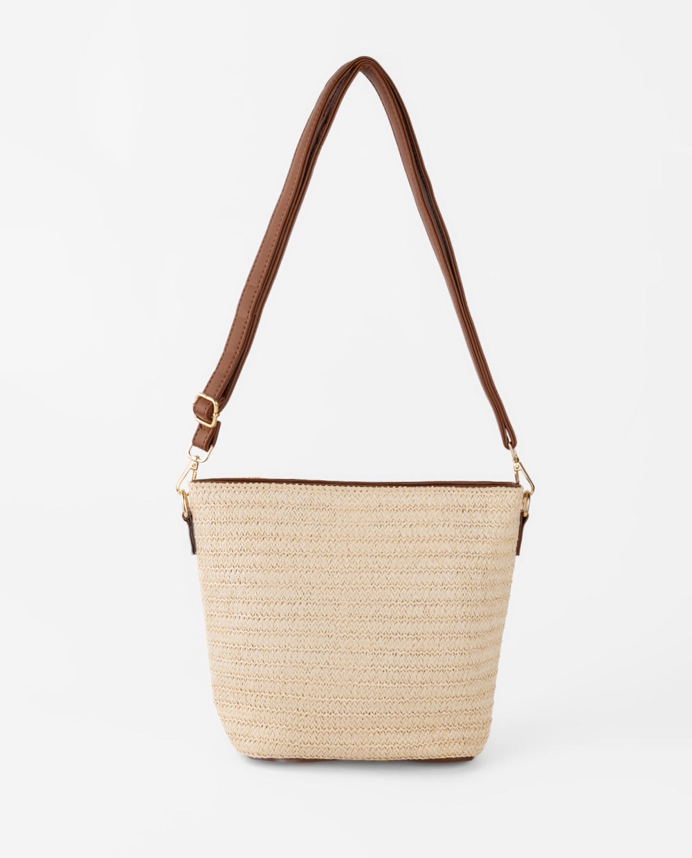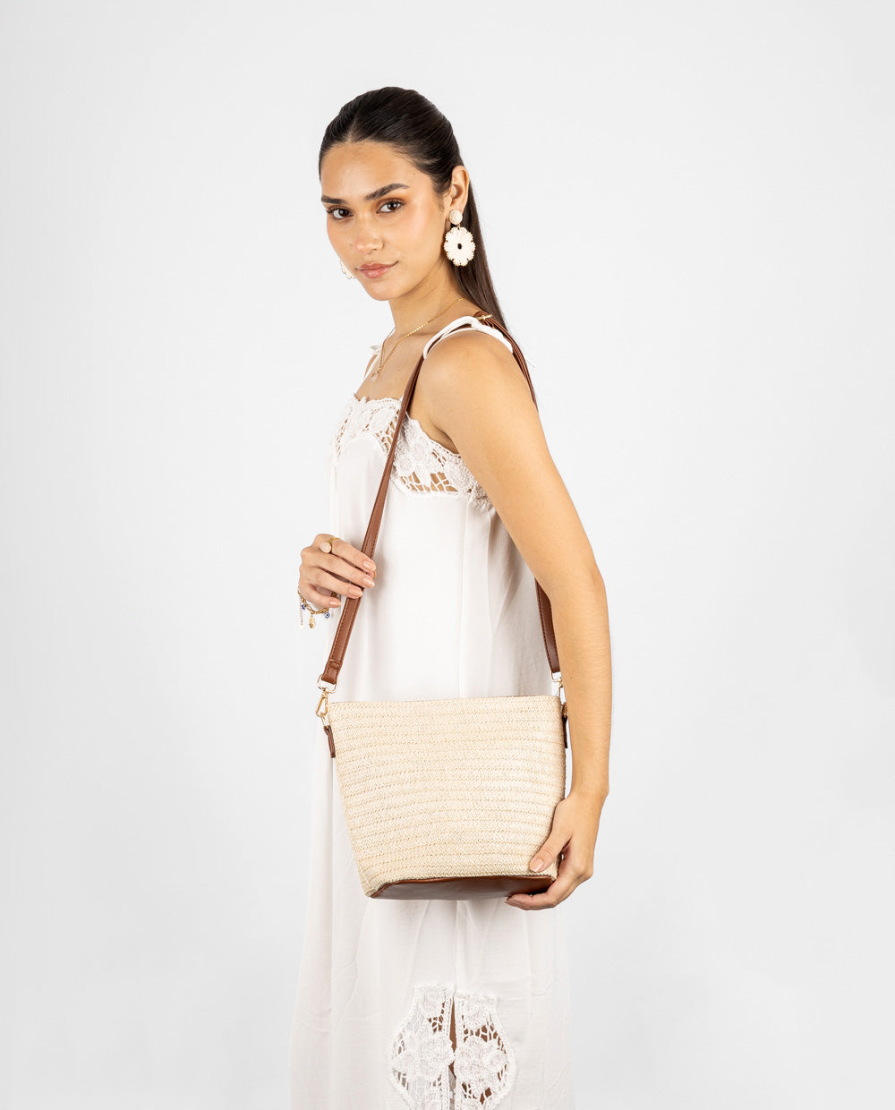 Cartera tejida beige y asa larga ajustable para llevarla cruzada y acompañar tus outfits de verano.